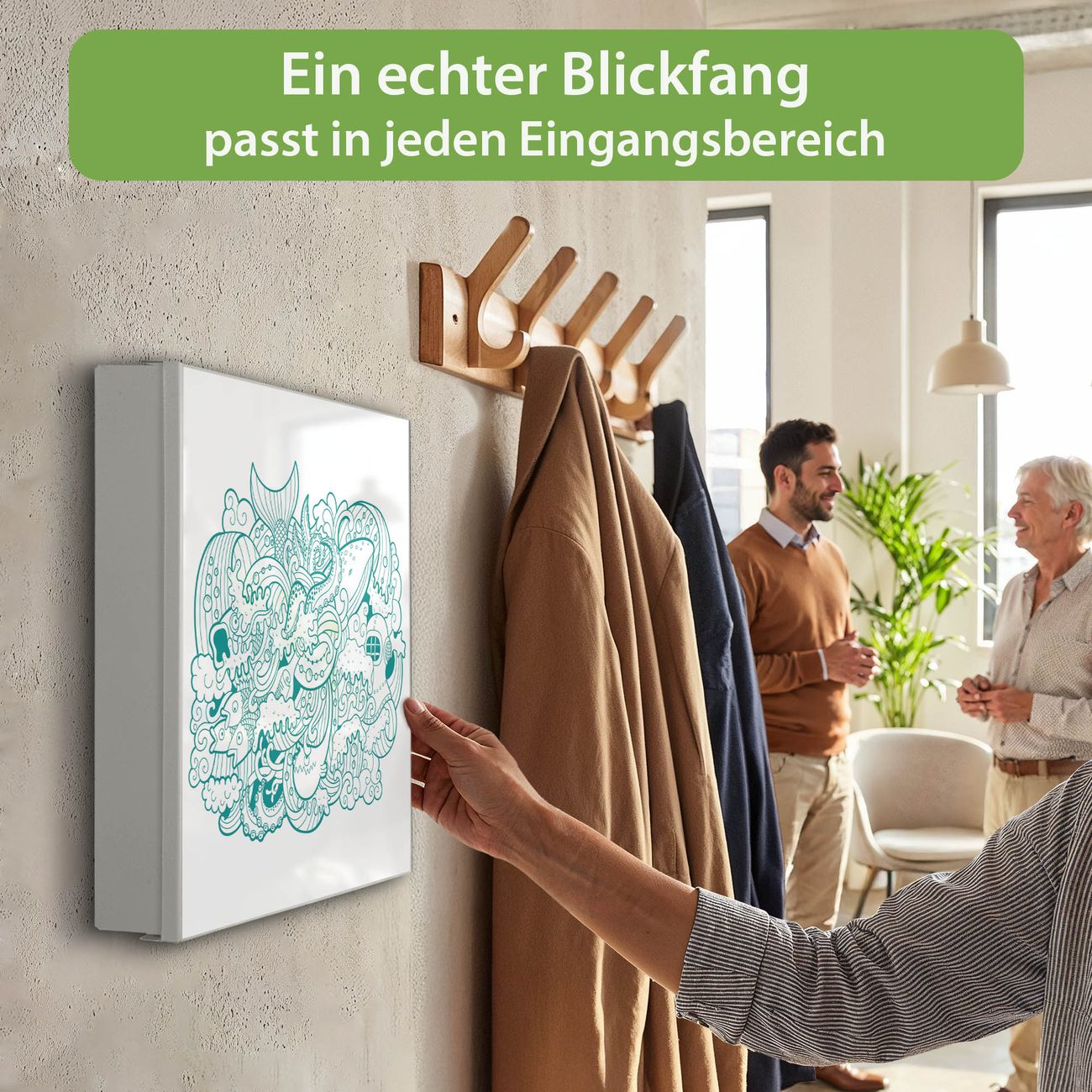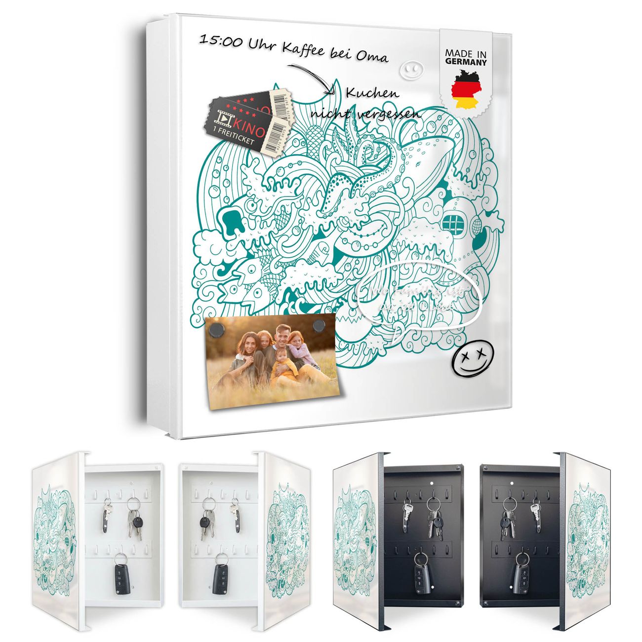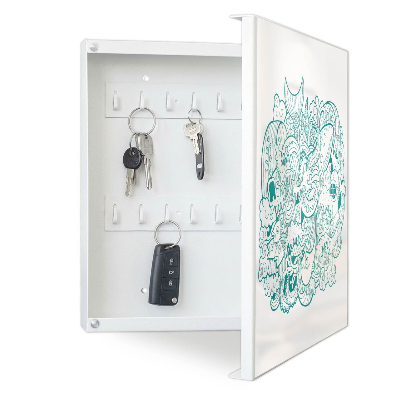 Bringe Ordnung und Eleganz in deinen Eingangsbereich mit dem banjado Schlüsselkasten Motiv Motiv Tiefsee. Die moderne Schlüsselbox kombiniert funktionales Design mit hochwertiger Verarbeitung und wird so zu einem echten Hingucker in Flur, Büro oder Ferienwohnung. ✅ Stilvolle Schlüsselaufbewahrung mit Motiv Motiv Tiefsee Der Design-Schlüsselkasten Motiv Motiv Tiefsee bietet Platz für bis zu 32 Schlüssel, die auf 4 stabilen Reihen mit je 8 Haken übersichtlich verstaut werden. Mit seinen kompakten Maßen von 30 x 30 x 5 cm passt die Schlüsselbox perfekt auch in kleinere Räume. Der weiß lackierte Stahlkorpus mit rechts angeschlagenem Türscharnier harmoniert mit gedruckten Folie auf der Front und fügt sich nahtlos in jedes Wohnambiente ein. Ob als Schlüsselorganizer für Zuhause oder als praktische Lösung für Büros, Praxen und Gewerbe, der banjado Schlüsselkasten sorgt für Ordnung und Übersicht. Dank der magnetischen, mit Kreidestiften beschreibbaren Folie auf der Front kannst du Notizen anheften oder Termine direkt auf der Oberfläche festhalten. Die Schlüsselbox Motiv Motiv Tiefsee zur Wandmontage wird inklusive Befestigungsmaterial geliefert und ist schnell angebracht. So hast du deine Schlüssel jederzeit griffbereit und zugleich stilvoll verstaut. Mit diesem banjado Schlüsselkasten Motiv Motiv Tiefsee kombinierst du praktische Aufbewahrung mit stilvollem Wohndesign. Ob privat oder geschäftlich, die Schlüsselbox sorgt für mehr Ordnung, Übersicht und ein wohnliches Ambiente.Vorteile im Überblick