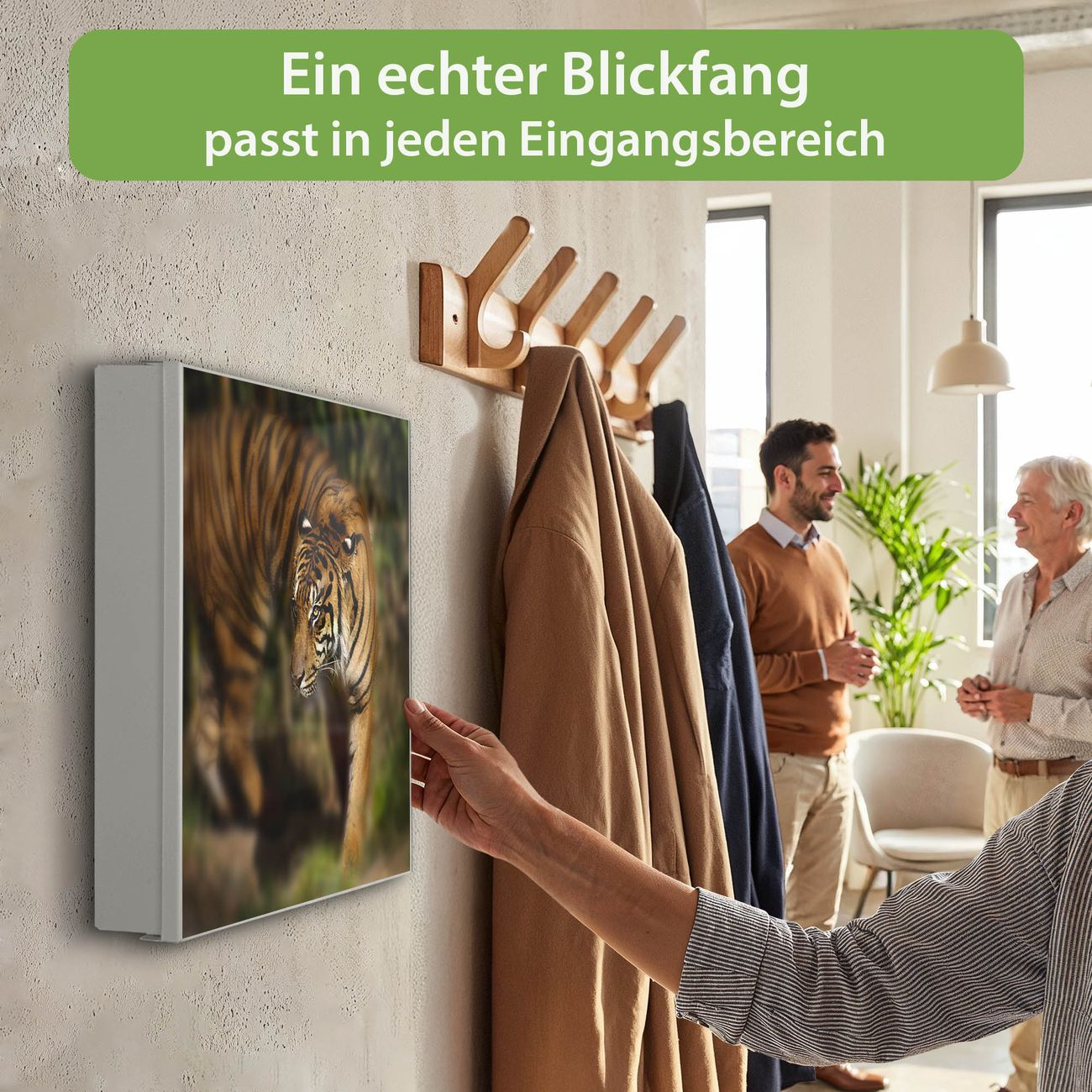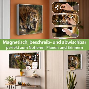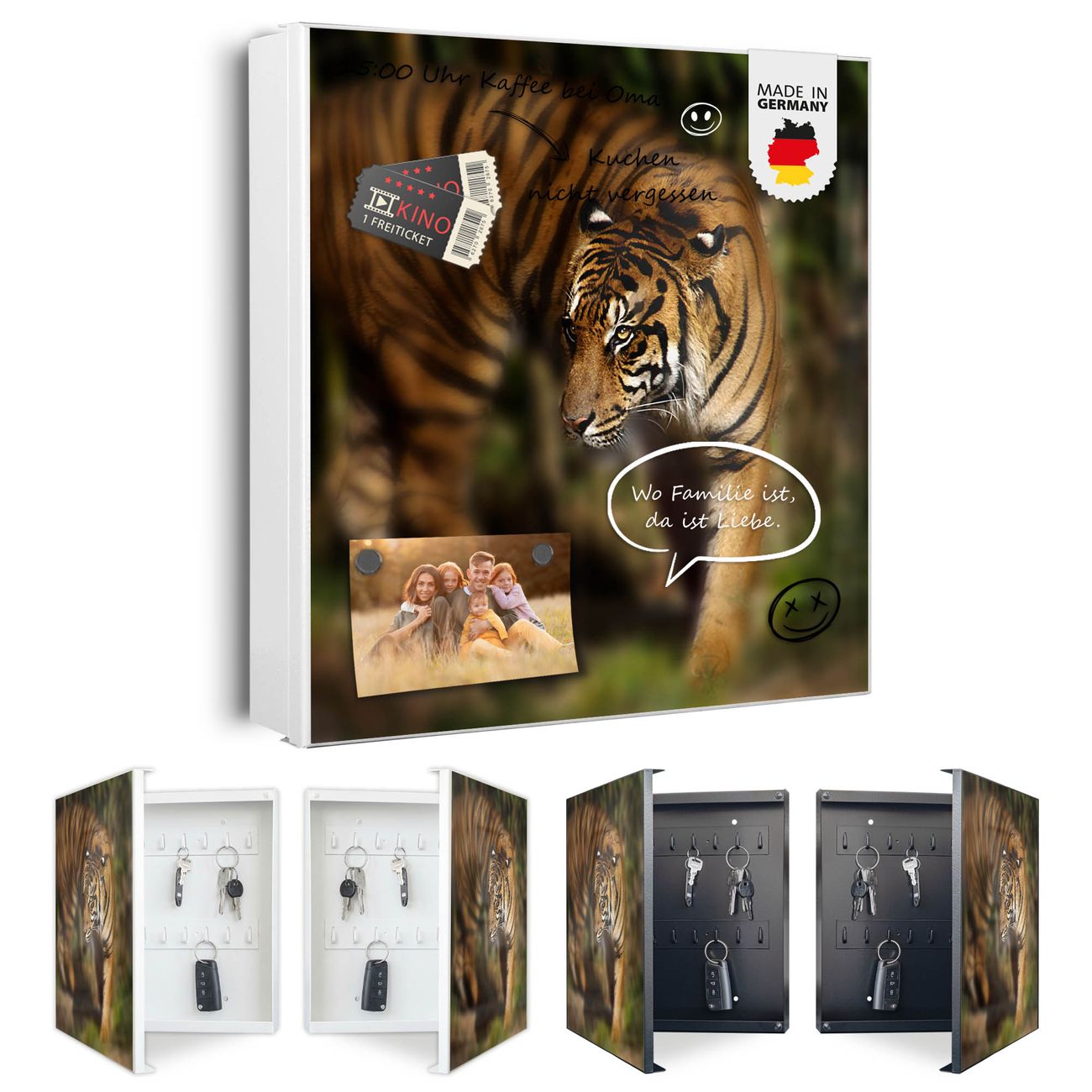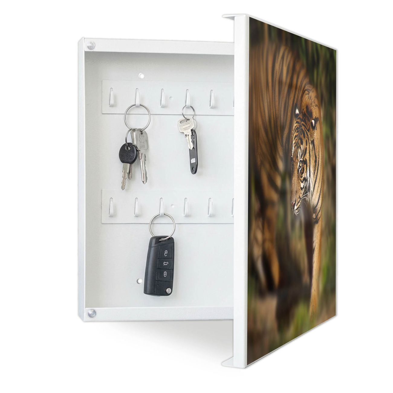Bringe Ordnung und Eleganz in deinen Eingangsbereich mit dem banjado Schlüsselkasten Motiv Motiv Tiger. Die moderne Schlüsselbox kombiniert funktionales Design mit hochwertiger Verarbeitung und wird so zu einem echten Hingucker in Flur, Büro oder Ferienwohnung. ✅ Stilvolle Schlüsselaufbewahrung mit Motiv Motiv Tiger Der Design-Schlüsselkasten Motiv Motiv Tiger bietet Platz für bis zu 32 Schlüssel, die auf 4 stabilen Reihen mit je 8 Haken übersichtlich verstaut werden. Mit seinen kompakten Maßen von 30 x 30 x 5 cm passt die Schlüsselbox perfekt auch in kleinere Räume. Der weiß lackierte Stahlkorpus mit rechts angeschlagenem Türscharnier harmoniert mit gedruckten Folie auf der Front und fügt sich nahtlos in jedes Wohnambiente ein. Ob als Schlüsselorganizer für Zuhause oder als praktische Lösung für Büros, Praxen und Gewerbe, der banjado Schlüsselkasten sorgt für Ordnung und Übersicht. Dank der magnetischen, mit Kreidestiften beschreibbaren Folie auf der Front kannst du Notizen anheften oder Termine direkt auf der Oberfläche festhalten. Die Schlüsselbox Motiv Motiv Tiger zur Wandmontage wird inklusive Befestigungsmaterial geliefert und ist schnell angebracht. So hast du deine Schlüssel jederzeit griffbereit und zugleich stilvoll verstaut. Mit diesem banjado Schlüsselkasten Motiv Motiv Tiger kombinierst du praktische Aufbewahrung mit stilvollem Wohndesign. Ob privat oder geschäftlich, die Schlüsselbox sorgt für mehr Ordnung, Übersicht und ein wohnliches Ambiente.Vorteile im Überblick