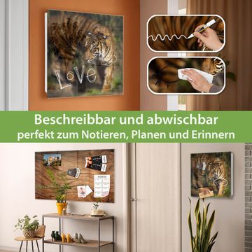 Bringe Ordnung und Eleganz in deinen Eingangsbereich mit dem banjado Schlüsselkasten Motiv Motiv Tiger. Die moderne Schlüsselbox kombiniert funktionales Design mit hochwertiger Verarbeitung und wird so zu einem echten Hingucker in Flur, Büro oder Ferienwohnung. ✅ Stilvolle Schlüsselaufbewahrung mit Glasfront im Motiv Motiv Tiger Der Design-Schlüsselkasten Motiv Motiv Tiger bietet Platz für bis zu 50 Schlüssel, die auf 5 stabilen Reihen mit je 10 Haken übersichtlich verstaut werden. Mit seinen kompakten Maßen von 30 x 30 x 5 cm passt die Schlüsselbox perfekt auch in kleinere Räume. Der weiß lackierte Stahlkorpus mit rechts angeschlagenem Türscharnier harmoniert mit der Glasfront und fügt sich nahtlos in jedes Wohnambiente ein. Ob als Schlüsselorganizer für Zuhause oder als praktische Lösung für Büros, Praxen und Gewerbe, der banjado Schlüsselkasten sorgt für Ordnung und Übersicht. Dank der magnetischen, mit Kreidestiften beschreibbaren Glasfront kannst du Notizen anheften oder Termine direkt auf der Oberfläche festhalten. Die Schlüsselbox Motiv Motiv Tiger zur Wandmontage wird inklusive Befestigungsmaterial geliefert und ist schnell angebracht. So hast du deine Schlüssel jederzeit griffbereit und zugleich stilvoll verstaut. Mit diesem banjado Schlüsselkasten Motiv Motiv Tiger kombinierst du praktische Aufbewahrung mit stilvollem Wohndesign. Ob privat oder geschäftlich, die Schlüsselbox sorgt für mehr Ordnung, Übersicht und ein wohnliches Ambiente.Vorteile im Überblick