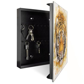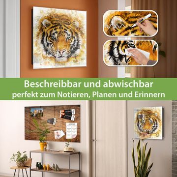 Bringe Ordnung und Eleganz in deinen Eingangsbereich mit dem banjado Schlüsselkasten Motiv Motiv Tigerkopf. Die moderne Schlüsselbox kombiniert funktionales Design mit hochwertiger Verarbeitung und wird so zu einem echten Hingucker in Flur, Büro oder Ferienwohnung. ✅ Stilvolle Schlüsselaufbewahrung mit Glasfront im Motiv Motiv Tigerkopf Der Design-Schlüsselkasten Motiv Motiv Tigerkopf bietet Platz für bis zu 50 Schlüssel, die auf 5 stabilen Reihen mit je 10 Haken übersichtlich verstaut werden. Mit seinen kompakten Maßen von 30 x 30 x 5 cm passt die Schlüsselbox perfekt auch in kleinere Räume. Der schwarz lackierte Stahlkorpus mit rechts angeschlagenem Türscharnier harmoniert mit der Glasfront und fügt sich nahtlos in jedes Wohnambiente ein. Ob als Schlüsselorganizer für Zuhause oder als praktische Lösung für Büros, Praxen und Gewerbe, der banjado Schlüsselkasten sorgt für Ordnung und Übersicht. Dank der magnetischen, mit Kreidestiften beschreibbaren Glasfront kannst du Notizen anheften oder Termine direkt auf der Oberfläche festhalten. Die Schlüsselbox Motiv Motiv Tigerkopf zur Wandmontage wird inklusive Befestigungsmaterial geliefert und ist schnell angebracht. So hast du deine Schlüssel jederzeit griffbereit und zugleich stilvoll verstaut. Mit diesem banjado Schlüsselkasten Motiv Motiv Tigerkopf kombinierst du praktische Aufbewahrung mit stilvollem Wohndesign. Ob privat oder geschäftlich, die Schlüsselbox sorgt für mehr Ordnung, Übersicht und ein wohnliches Ambiente.Vorteile im Überblick