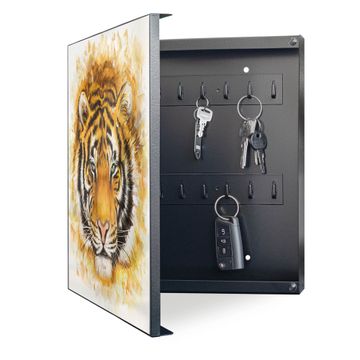 Bringe Ordnung und Eleganz in deinen Eingangsbereich mit dem banjado Schlüsselkasten Motiv Motiv Tigerkopf. Die moderne Schlüsselbox kombiniert funktionales Design mit hochwertiger Verarbeitung und wird so zu einem echten Hingucker in Flur, Büro oder Ferienwohnung. ✅ Stilvolle Schlüsselaufbewahrung mit Motiv Motiv Tigerkopf Der Design-Schlüsselkasten Motiv Motiv Tigerkopf bietet Platz für bis zu 32 Schlüssel, die auf 4 stabilen Reihen mit je 8 Haken übersichtlich verstaut werden. Mit seinen kompakten Maßen von 30 x 30 x 5 cm passt die Schlüsselbox perfekt auch in kleinere Räume. Der schwarz lackierte Stahlkorpus mit links angeschlagenem Türscharnier harmoniert mit gedruckten Folie auf der Front und fügt sich nahtlos in jedes Wohnambiente ein. Ob als Schlüsselorganizer für Zuhause oder als praktische Lösung für Büros, Praxen und Gewerbe, der banjado Schlüsselkasten sorgt für Ordnung und Übersicht. Dank der magnetischen, mit Kreidestiften beschreibbaren Folie auf der Front kannst du Notizen anheften oder Termine direkt auf der Oberfläche festhalten. Die Schlüsselbox Motiv Motiv Tigerkopf zur Wandmontage wird inklusive Befestigungsmaterial geliefert und ist schnell angebracht. So hast du deine Schlüssel jederzeit griffbereit und zugleich stilvoll verstaut. Mit diesem banjado Schlüsselkasten Motiv Motiv Tigerkopf kombinierst du praktische Aufbewahrung mit stilvollem Wohndesign. Ob privat oder geschäftlich, die Schlüsselbox sorgt für mehr Ordnung, Übersicht und ein wohnliches Ambiente.Vorteile im Überblick