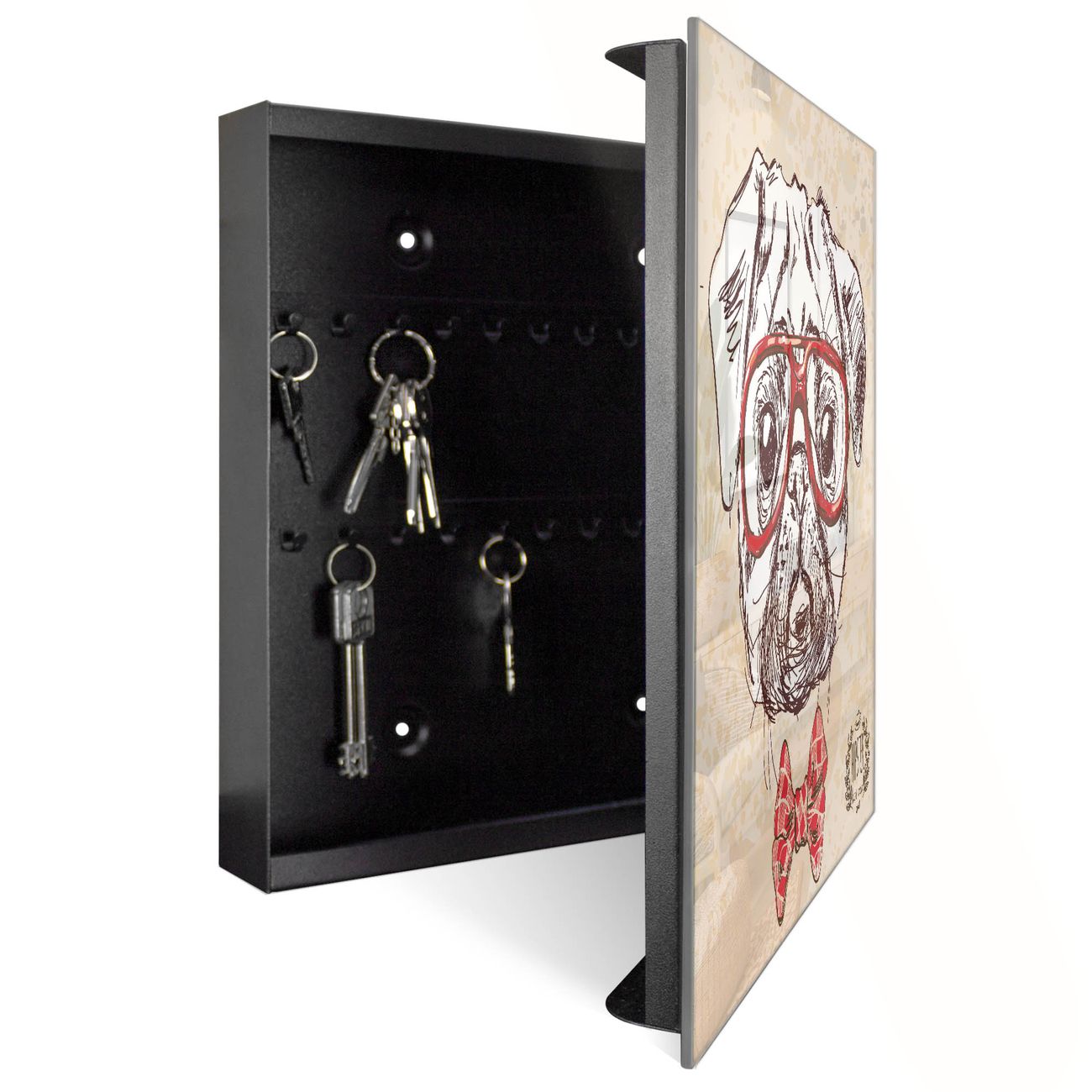 Bringe Ordnung und Eleganz in deinen Eingangsbereich mit dem banjado Schlüsselkasten Motiv Motiv Timothy. Die moderne Schlüsselbox kombiniert funktionales Design mit hochwertiger Verarbeitung und wird so zu einem echten Hingucker in Flur, Büro oder Ferienwohnung. ✅ Stilvolle Schlüsselaufbewahrung mit Glasfront im Motiv Motiv Timothy Der Design-Schlüsselkasten Motiv Motiv Timothy bietet Platz für bis zu 50 Schlüssel, die auf 5 stabilen Reihen mit je 10 Haken übersichtlich verstaut werden. Mit seinen kompakten Maßen von 30 x 30 x 5 cm passt die Schlüsselbox perfekt auch in kleinere Räume. Der schwarz lackierte Stahlkorpus mit rechts angeschlagenem Türscharnier harmoniert mit der Glasfront und fügt sich nahtlos in jedes Wohnambiente ein. Ob als Schlüsselorganizer für Zuhause oder als praktische Lösung für Büros, Praxen und Gewerbe, der banjado Schlüsselkasten sorgt für Ordnung und Übersicht. Dank der magnetischen, mit Kreidestiften beschreibbaren Glasfront kannst du Notizen anheften oder Termine direkt auf der Oberfläche festhalten. Die Schlüsselbox Motiv Motiv Timothy zur Wandmontage wird inklusive Befestigungsmaterial geliefert und ist schnell angebracht. So hast du deine Schlüssel jederzeit griffbereit und zugleich stilvoll verstaut. Mit diesem banjado Schlüsselkasten Motiv Motiv Timothy kombinierst du praktische Aufbewahrung mit stilvollem Wohndesign. Ob privat oder geschäftlich, die Schlüsselbox sorgt für mehr Ordnung, Übersicht und ein wohnliches Ambiente.Vorteile im Überblick