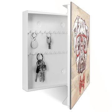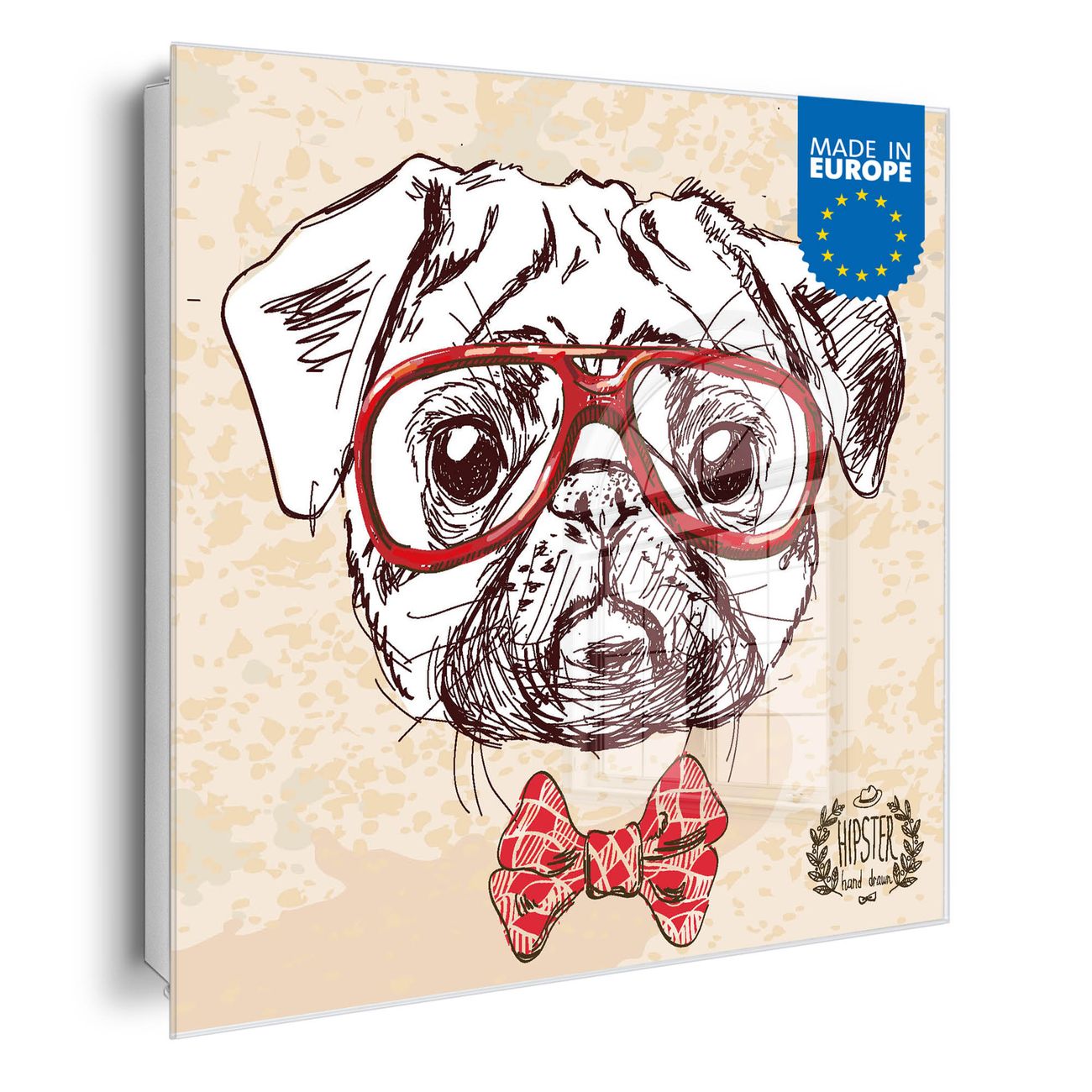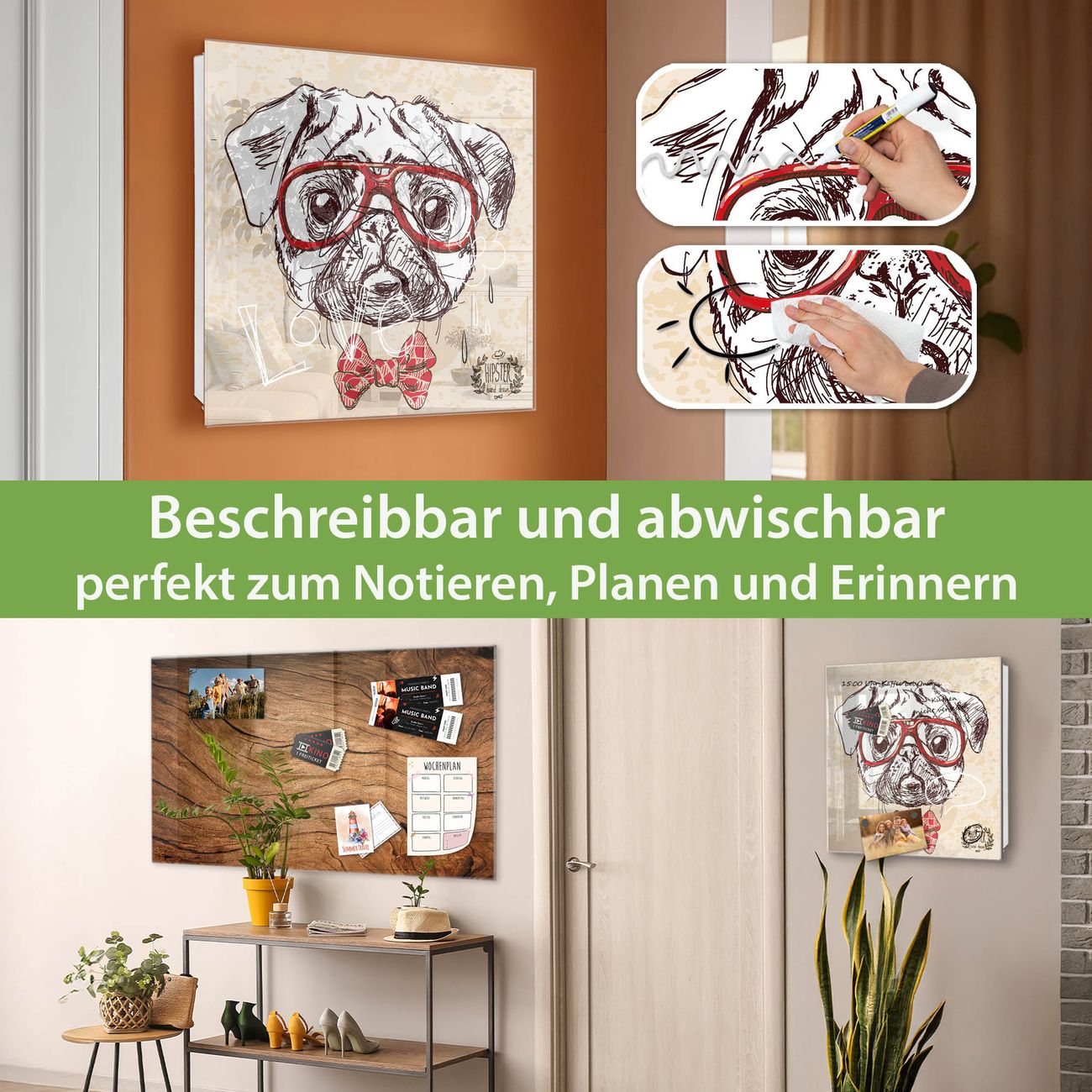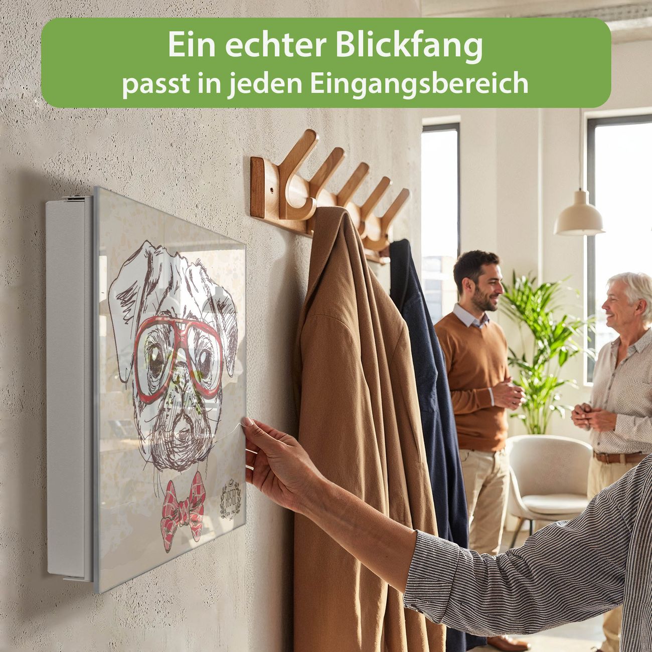Bringe Ordnung und Eleganz in deinen Eingangsbereich mit dem banjado Schlüsselkasten Motiv Motiv Timothy. Die moderne Schlüsselbox kombiniert funktionales Design mit hochwertiger Verarbeitung und wird so zu einem echten Hingucker in Flur, Büro oder Ferienwohnung. ✅ Stilvolle Schlüsselaufbewahrung mit Glasfront im Motiv Motiv Timothy Der Design-Schlüsselkasten Motiv Motiv Timothy bietet Platz für bis zu 50 Schlüssel, die auf 5 stabilen Reihen mit je 10 Haken übersichtlich verstaut werden. Mit seinen kompakten Maßen von 30 x 30 x 5 cm passt die Schlüsselbox perfekt auch in kleinere Räume. Der weiß lackierte Stahlkorpus mit rechts angeschlagenem Türscharnier harmoniert mit der Glasfront und fügt sich nahtlos in jedes Wohnambiente ein. Ob als Schlüsselorganizer für Zuhause oder als praktische Lösung für Büros, Praxen und Gewerbe, der banjado Schlüsselkasten sorgt für Ordnung und Übersicht. Dank der magnetischen, mit Kreidestiften beschreibbaren Glasfront kannst du Notizen anheften oder Termine direkt auf der Oberfläche festhalten. Die Schlüsselbox Motiv Motiv Timothy zur Wandmontage wird inklusive Befestigungsmaterial geliefert und ist schnell angebracht. So hast du deine Schlüssel jederzeit griffbereit und zugleich stilvoll verstaut. Mit diesem banjado Schlüsselkasten Motiv Motiv Timothy kombinierst du praktische Aufbewahrung mit stilvollem Wohndesign. Ob privat oder geschäftlich, die Schlüsselbox sorgt für mehr Ordnung, Übersicht und ein wohnliches Ambiente.Vorteile im Überblick