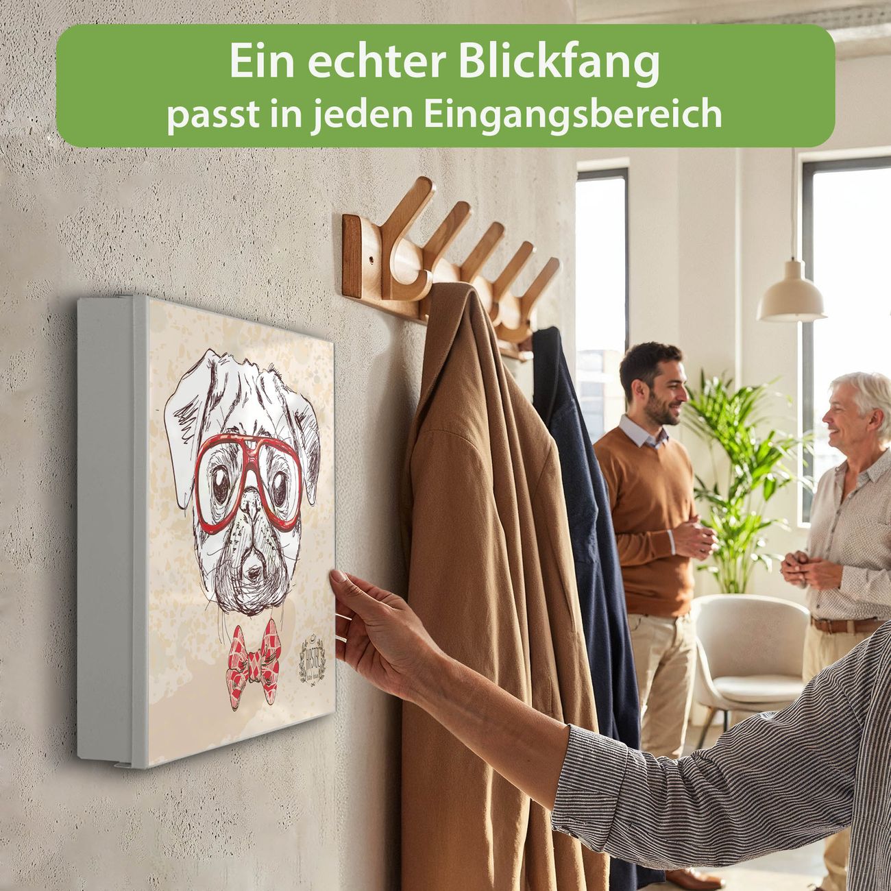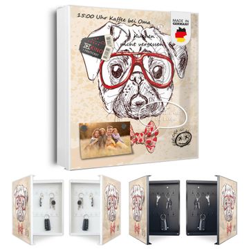 Bringe Ordnung und Eleganz in deinen Eingangsbereich mit dem banjado Schlüsselkasten Motiv Motiv Timothy. Die moderne Schlüsselbox kombiniert funktionales Design mit hochwertiger Verarbeitung und wird so zu einem echten Hingucker in Flur, Büro oder Ferienwohnung. ✅ Stilvolle Schlüsselaufbewahrung mit Motiv Motiv Timothy Der Design-Schlüsselkasten Motiv Motiv Timothy bietet Platz für bis zu 32 Schlüssel, die auf 4 stabilen Reihen mit je 8 Haken übersichtlich verstaut werden. Mit seinen kompakten Maßen von 30 x 30 x 5 cm passt die Schlüsselbox perfekt auch in kleinere Räume. Der weiß lackierte Stahlkorpus mit links angeschlagenem Türscharnier harmoniert mit gedruckten Folie auf der Front und fügt sich nahtlos in jedes Wohnambiente ein. Ob als Schlüsselorganizer für Zuhause oder als praktische Lösung für Büros, Praxen und Gewerbe, der banjado Schlüsselkasten sorgt für Ordnung und Übersicht. Dank der magnetischen, mit Kreidestiften beschreibbaren Folie auf der Front kannst du Notizen anheften oder Termine direkt auf der Oberfläche festhalten. Die Schlüsselbox Motiv Motiv Timothy zur Wandmontage wird inklusive Befestigungsmaterial geliefert und ist schnell angebracht. So hast du deine Schlüssel jederzeit griffbereit und zugleich stilvoll verstaut. Mit diesem banjado Schlüsselkasten Motiv Motiv Timothy kombinierst du praktische Aufbewahrung mit stilvollem Wohndesign. Ob privat oder geschäftlich, die Schlüsselbox sorgt für mehr Ordnung, Übersicht und ein wohnliches Ambiente.Vorteile im Überblick