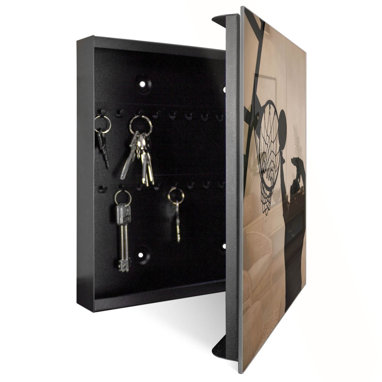 Bringe Ordnung und Eleganz in deinen Eingangsbereich mit dem banjado Schlüsselkasten Motiv Motiv Tip In. Die moderne Schlüsselbox kombiniert funktionales Design mit hochwertiger Verarbeitung und wird so zu einem echten Hingucker in Flur, Büro oder Ferienwohnung. ✅ Stilvolle Schlüsselaufbewahrung mit Glasfront im Motiv Motiv Tip In Der Design-Schlüsselkasten Motiv Motiv Tip In bietet Platz für bis zu 50 Schlüssel, die auf 5 stabilen Reihen mit je 10 Haken übersichtlich verstaut werden. Mit seinen kompakten Maßen von 30 x 30 x 5 cm passt die Schlüsselbox perfekt auch in kleinere Räume. Der schwarz lackierte Stahlkorpus mit rechts angeschlagenem Türscharnier harmoniert mit der Glasfront und fügt sich nahtlos in jedes Wohnambiente ein. Ob als Schlüsselorganizer für Zuhause oder als praktische Lösung für Büros, Praxen und Gewerbe, der banjado Schlüsselkasten sorgt für Ordnung und Übersicht. Dank der magnetischen, mit Kreidestiften beschreibbaren Glasfront kannst du Notizen anheften oder Termine direkt auf der Oberfläche festhalten. Die Schlüsselbox Motiv Motiv Tip In zur Wandmontage wird inklusive Befestigungsmaterial geliefert und ist schnell angebracht. So hast du deine Schlüssel jederzeit griffbereit und zugleich stilvoll verstaut. Mit diesem banjado Schlüsselkasten Motiv Motiv Tip In kombinierst du praktische Aufbewahrung mit stilvollem Wohndesign. Ob privat oder geschäftlich, die Schlüsselbox sorgt für mehr Ordnung, Übersicht und ein wohnliches Ambiente.Vorteile im Überblick