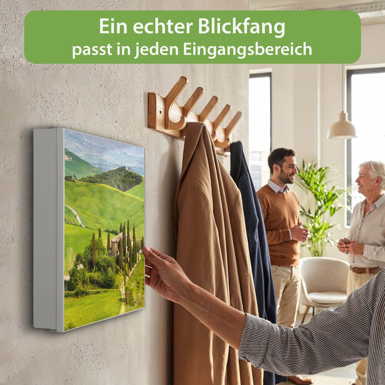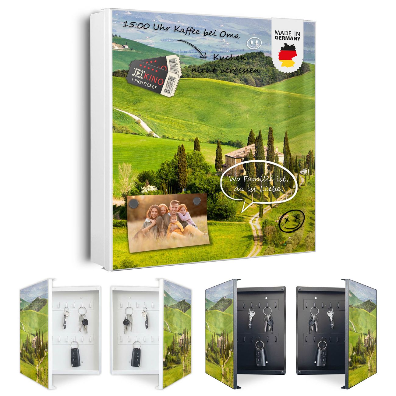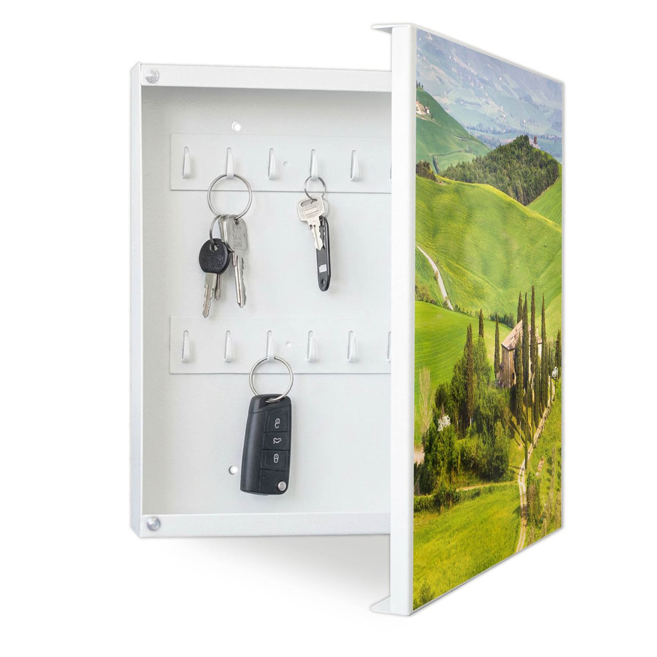 Bringe Ordnung und Eleganz in deinen Eingangsbereich mit dem banjado Schlüsselkasten Motiv Motiv Toskana. Die moderne Schlüsselbox kombiniert funktionales Design mit hochwertiger Verarbeitung und wird so zu einem echten Hingucker in Flur, Büro oder Ferienwohnung. ✅ Stilvolle Schlüsselaufbewahrung mit Motiv Motiv Toskana Der Design-Schlüsselkasten Motiv Motiv Toskana bietet Platz für bis zu 32 Schlüssel, die auf 4 stabilen Reihen mit je 8 Haken übersichtlich verstaut werden. Mit seinen kompakten Maßen von 30 x 30 x 5 cm passt die Schlüsselbox perfekt auch in kleinere Räume. Der weiß lackierte Stahlkorpus mit rechts angeschlagenem Türscharnier harmoniert mit gedruckten Folie auf der Front und fügt sich nahtlos in jedes Wohnambiente ein. Ob als Schlüsselorganizer für Zuhause oder als praktische Lösung für Büros, Praxen und Gewerbe, der banjado Schlüsselkasten sorgt für Ordnung und Übersicht. Dank der magnetischen, mit Kreidestiften beschreibbaren Folie auf der Front kannst du Notizen anheften oder Termine direkt auf der Oberfläche festhalten. Die Schlüsselbox Motiv Motiv Toskana zur Wandmontage wird inklusive Befestigungsmaterial geliefert und ist schnell angebracht. So hast du deine Schlüssel jederzeit griffbereit und zugleich stilvoll verstaut. Mit diesem banjado Schlüsselkasten Motiv Motiv Toskana kombinierst du praktische Aufbewahrung mit stilvollem Wohndesign. Ob privat oder geschäftlich, die Schlüsselbox sorgt für mehr Ordnung, Übersicht und ein wohnliches Ambiente.Vorteile im Überblick