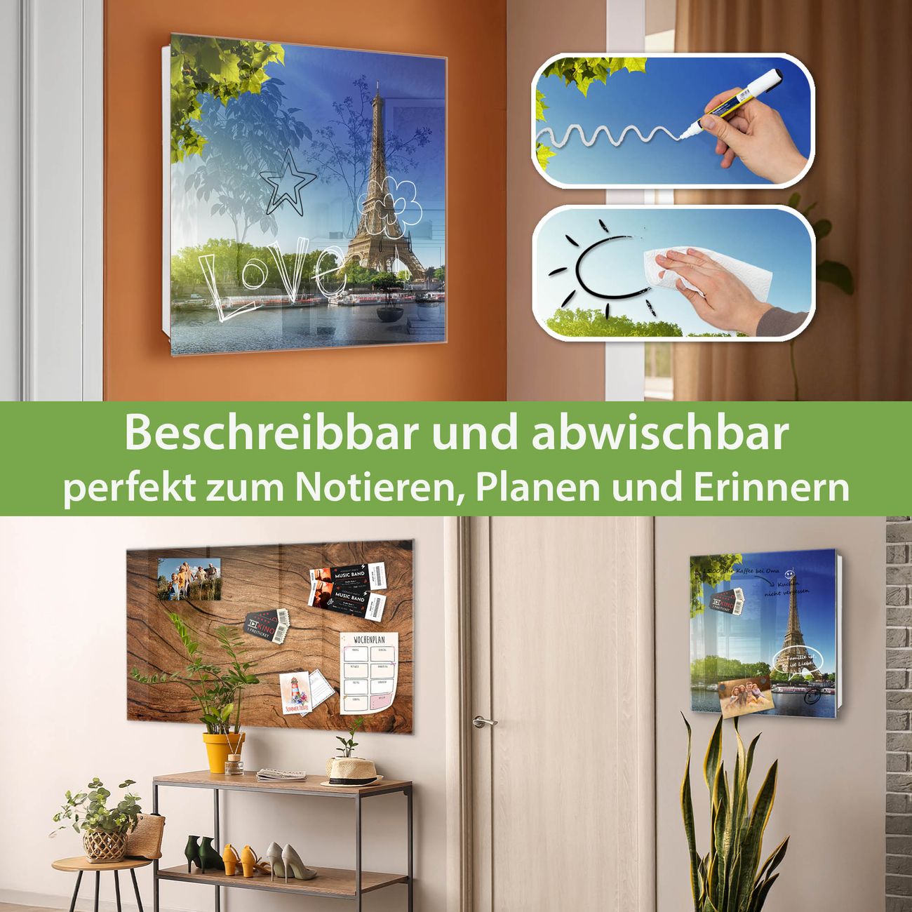 Bringe Ordnung und Eleganz in deinen Eingangsbereich mit dem banjado Schlüsselkasten Motiv Motiv Tour Eiffel. Die moderne Schlüsselbox kombiniert funktionales Design mit hochwertiger Verarbeitung und wird so zu einem echten Hingucker in Flur, Büro oder Ferienwohnung. ✅ Stilvolle Schlüsselaufbewahrung mit Glasfront im Motiv Motiv Tour Eiffel Der Design-Schlüsselkasten Motiv Motiv Tour Eiffel bietet Platz für bis zu 50 Schlüssel, die auf 5 stabilen Reihen mit je 10 Haken übersichtlich verstaut werden. Mit seinen kompakten Maßen von 30 x 30 x 5 cm passt die Schlüsselbox perfekt auch in kleinere Räume. Der weiß lackierte Stahlkorpus mit rechts angeschlagenem Türscharnier harmoniert mit der Glasfront und fügt sich nahtlos in jedes Wohnambiente ein. Ob als Schlüsselorganizer für Zuhause oder als praktische Lösung für Büros, Praxen und Gewerbe, der banjado Schlüsselkasten sorgt für Ordnung und Übersicht. Dank der magnetischen, mit Kreidestiften beschreibbaren Glasfront kannst du Notizen anheften oder Termine direkt auf der Oberfläche festhalten. Die Schlüsselbox Motiv Motiv Tour Eiffel zur Wandmontage wird inklusive Befestigungsmaterial geliefert und ist schnell angebracht. So hast du deine Schlüssel jederzeit griffbereit und zugleich stilvoll verstaut. Mit diesem banjado Schlüsselkasten Motiv Motiv Tour Eiffel kombinierst du praktische Aufbewahrung mit stilvollem Wohndesign. Ob privat oder geschäftlich, die Schlüsselbox sorgt für mehr Ordnung, Übersicht und ein wohnliches Ambiente.Vorteile im Überblick