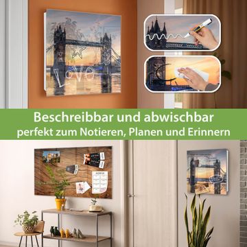 Bringe Ordnung und Eleganz in deinen Eingangsbereich mit dem banjado Schlüsselkasten Motiv Motiv Tower Bridge. Die moderne Schlüsselbox kombiniert funktionales Design mit hochwertiger Verarbeitung und wird so zu einem echten Hingucker in Flur, Büro oder Ferienwohnung. ✅ Stilvolle Schlüsselaufbewahrung mit Glasfront im Motiv Motiv Tower Bridge Der Design-Schlüsselkasten Motiv Motiv Tower Bridge bietet Platz für bis zu 50 Schlüssel, die auf 5 stabilen Reihen mit je 10 Haken übersichtlich verstaut werden. Mit seinen kompakten Maßen von 30 x 30 x 5 cm passt die Schlüsselbox perfekt auch in kleinere Räume. Der weiß lackierte Stahlkorpus mit rechts angeschlagenem Türscharnier harmoniert mit der Glasfront und fügt sich nahtlos in jedes Wohnambiente ein. Ob als Schlüsselorganizer für Zuhause oder als praktische Lösung für Büros, Praxen und Gewerbe, der banjado Schlüsselkasten sorgt für Ordnung und Übersicht. Dank der magnetischen, mit Kreidestiften beschreibbaren Glasfront kannst du Notizen anheften oder Termine direkt auf der Oberfläche festhalten. Die Schlüsselbox Motiv Motiv Tower Bridge zur Wandmontage wird inklusive Befestigungsmaterial geliefert und ist schnell angebracht. So hast du deine Schlüssel jederzeit griffbereit und zugleich stilvoll verstaut. Mit diesem banjado Schlüsselkasten Motiv Motiv Tower Bridge kombinierst du praktische Aufbewahrung mit stilvollem Wohndesign. Ob privat oder geschäftlich, die Schlüsselbox sorgt für mehr Ordnung, Übersicht und ein wohnliches Ambiente.Vorteile im Überblick