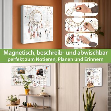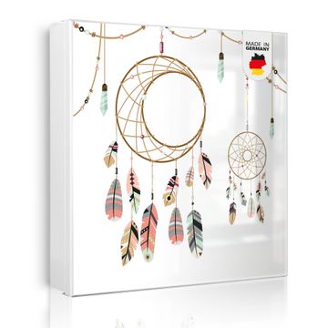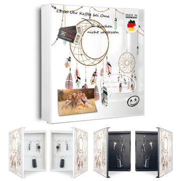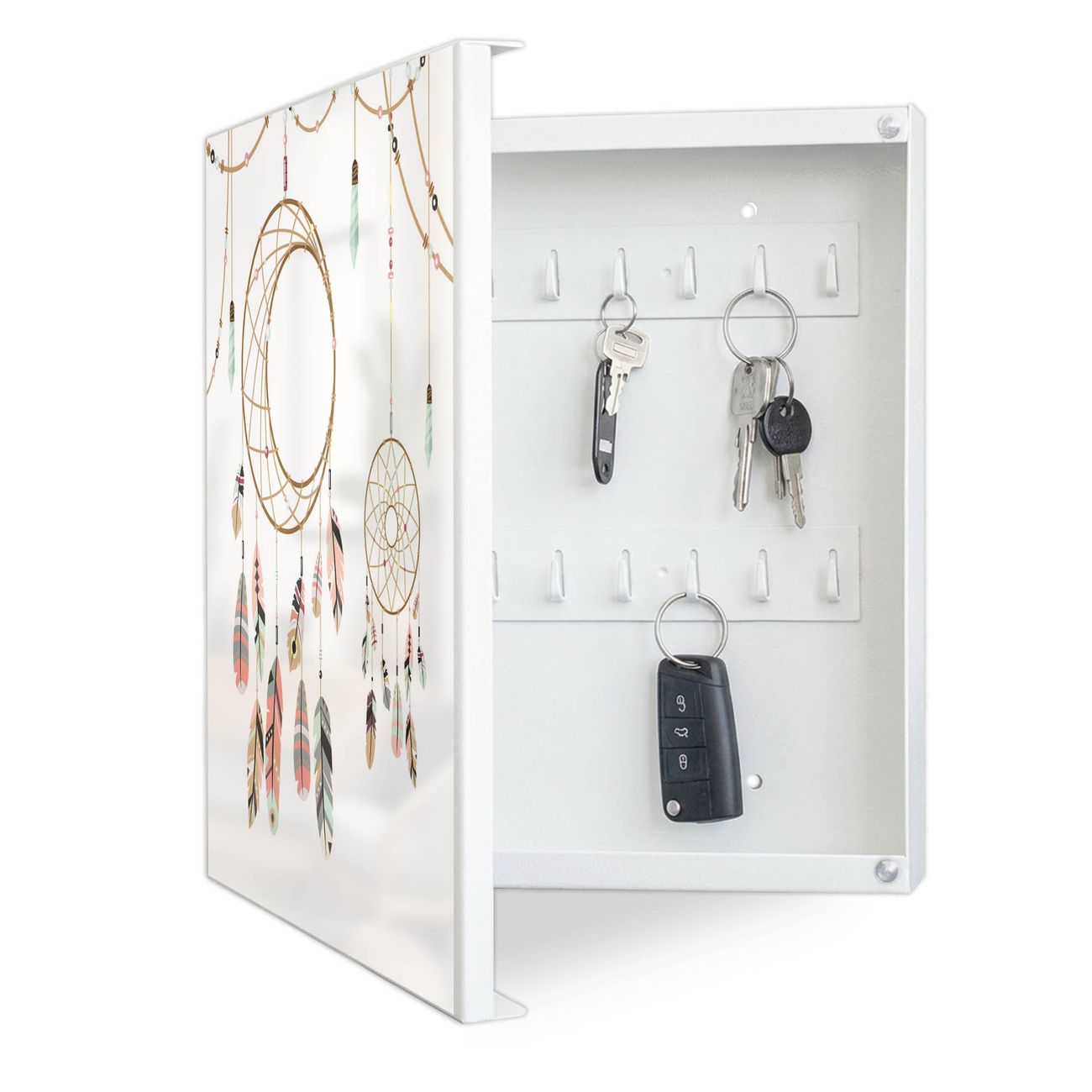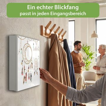 Bringe Ordnung und Eleganz in deinen Eingangsbereich mit dem banjado Schlüsselkasten Motiv Motiv Traumfänger Boho. Die moderne Schlüsselbox kombiniert funktionales Design mit hochwertiger Verarbeitung und wird so zu einem echten Hingucker in Flur, Büro oder Ferienwohnung. ✅ Stilvolle Schlüsselaufbewahrung mit Motiv Motiv Traumfänger Boho Der Design-Schlüsselkasten Motiv Motiv Traumfänger Boho bietet Platz für bis zu 32 Schlüssel, die auf 4 stabilen Reihen mit je 8 Haken übersichtlich verstaut werden. Mit seinen kompakten Maßen von 30 x 30 x 5 cm passt die Schlüsselbox perfekt auch in kleinere Räume. Der weiß lackierte Stahlkorpus mit links angeschlagenem Türscharnier harmoniert mit gedruckten Folie auf der Front und fügt sich nahtlos in jedes Wohnambiente ein. Ob als Schlüsselorganizer für Zuhause oder als praktische Lösung für Büros, Praxen und Gewerbe, der banjado Schlüsselkasten sorgt für Ordnung und Übersicht. Dank der magnetischen, mit Kreidestiften beschreibbaren Folie auf der Front kannst du Notizen anheften oder Termine direkt auf der Oberfläche festhalten. Die Schlüsselbox Motiv Motiv Traumfänger Boho zur Wandmontage wird inklusive Befestigungsmaterial geliefert und ist schnell angebracht. So hast du deine Schlüssel jederzeit griffbereit und zugleich stilvoll verstaut. Mit diesem banjado Schlüsselkasten Motiv Motiv Traumfänger Boho kombinierst du praktische Aufbewahrung mit stilvollem Wohndesign. Ob privat oder geschäftlich, die Schlüsselbox sorgt für mehr Ordnung, Übersicht und ein wohnliches Ambiente.Vorteile im Überblick