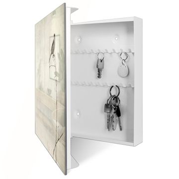 Bringe Ordnung und Eleganz in deinen Eingangsbereich mit dem banjado Schlüsselkasten Motiv Motiv Tristessa. Die moderne Schlüsselbox kombiniert funktionales Design mit hochwertiger Verarbeitung und wird so zu einem echten Hingucker in Flur, Büro oder Ferienwohnung. ✅ Stilvolle Schlüsselaufbewahrung mit Glasfront im Motiv Motiv Tristessa Der Design-Schlüsselkasten Motiv Motiv Tristessa bietet Platz für bis zu 50 Schlüssel, die auf 5 stabilen Reihen mit je 10 Haken übersichtlich verstaut werden. Mit seinen kompakten Maßen von 30 x 30 x 5 cm passt die Schlüsselbox perfekt auch in kleinere Räume. Der weiß lackierte Stahlkorpus mit rechts angeschlagenem Türscharnier harmoniert mit der Glasfront und fügt sich nahtlos in jedes Wohnambiente ein. Ob als Schlüsselorganizer für Zuhause oder als praktische Lösung für Büros, Praxen und Gewerbe, der banjado Schlüsselkasten sorgt für Ordnung und Übersicht. Dank der magnetischen, mit Kreidestiften beschreibbaren Glasfront kannst du Notizen anheften oder Termine direkt auf der Oberfläche festhalten. Die Schlüsselbox Motiv Motiv Tristessa zur Wandmontage wird inklusive Befestigungsmaterial geliefert und ist schnell angebracht. So hast du deine Schlüssel jederzeit griffbereit und zugleich stilvoll verstaut. Mit diesem banjado Schlüsselkasten Motiv Motiv Tristessa kombinierst du praktische Aufbewahrung mit stilvollem Wohndesign. Ob privat oder geschäftlich, die Schlüsselbox sorgt für mehr Ordnung, Übersicht und ein wohnliches Ambiente.Vorteile im Überblick