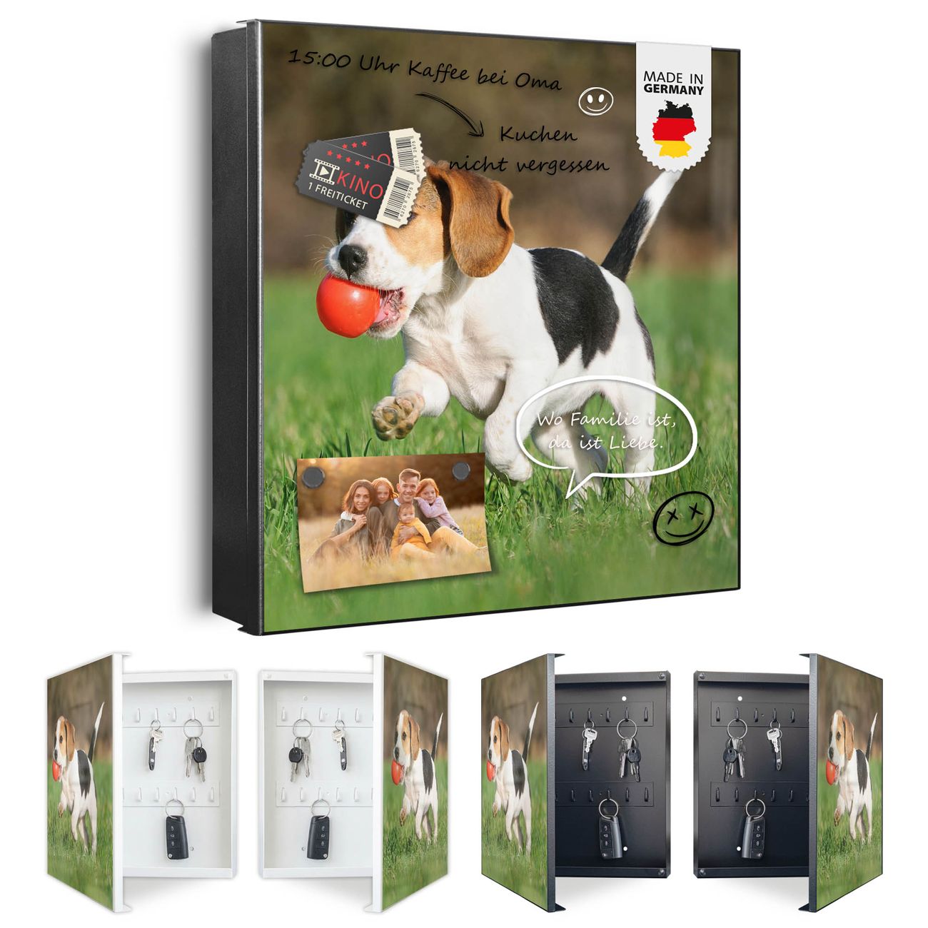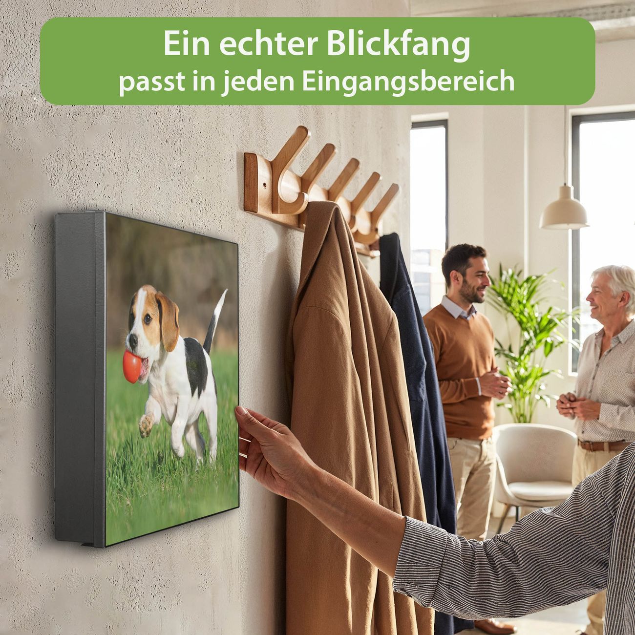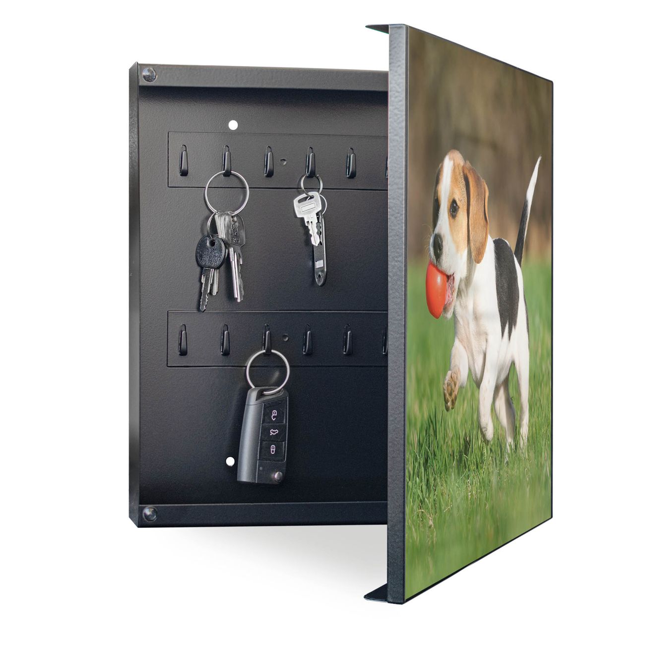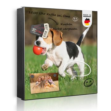 Bringe Ordnung und Eleganz in deinen Eingangsbereich mit dem banjado Schlüsselkasten Motiv Motiv Trixi. Die moderne Schlüsselbox kombiniert funktionales Design mit hochwertiger Verarbeitung und wird so zu einem echten Hingucker in Flur, Büro oder Ferienwohnung. ✅ Stilvolle Schlüsselaufbewahrung mit Motiv Motiv Trixi Der Design-Schlüsselkasten Motiv Motiv Trixi bietet Platz für bis zu 32 Schlüssel, die auf 4 stabilen Reihen mit je 8 Haken übersichtlich verstaut werden. Mit seinen kompakten Maßen von 30 x 30 x 5 cm passt die Schlüsselbox perfekt auch in kleinere Räume. Der schwarz lackierte Stahlkorpus mit rechts angeschlagenem Türscharnier harmoniert mit gedruckten Folie auf der Front und fügt sich nahtlos in jedes Wohnambiente ein. Ob als Schlüsselorganizer für Zuhause oder als praktische Lösung für Büros, Praxen und Gewerbe, der banjado Schlüsselkasten sorgt für Ordnung und Übersicht. Dank der magnetischen, mit Kreidestiften beschreibbaren Folie auf der Front kannst du Notizen anheften oder Termine direkt auf der Oberfläche festhalten. Die Schlüsselbox Motiv Motiv Trixi zur Wandmontage wird inklusive Befestigungsmaterial geliefert und ist schnell angebracht. So hast du deine Schlüssel jederzeit griffbereit und zugleich stilvoll verstaut. Mit diesem banjado Schlüsselkasten Motiv Motiv Trixi kombinierst du praktische Aufbewahrung mit stilvollem Wohndesign. Ob privat oder geschäftlich, die Schlüsselbox sorgt für mehr Ordnung, Übersicht und ein wohnliches Ambiente.Vorteile im Überblick