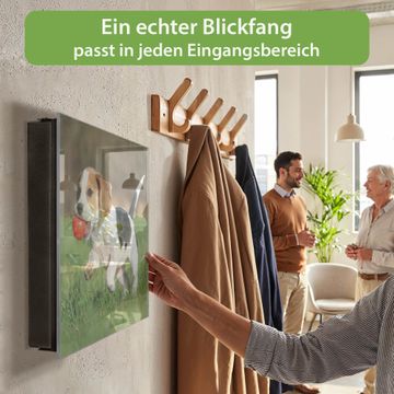 Bringe Ordnung und Eleganz in deinen Eingangsbereich mit dem banjado Schlüsselkasten Motiv Motiv Trixi. Die moderne Schlüsselbox kombiniert funktionales Design mit hochwertiger Verarbeitung und wird so zu einem echten Hingucker in Flur, Büro oder Ferienwohnung. ✅ Stilvolle Schlüsselaufbewahrung mit Glasfront im Motiv Motiv Trixi Der Design-Schlüsselkasten Motiv Motiv Trixi bietet Platz für bis zu 50 Schlüssel, die auf 5 stabilen Reihen mit je 10 Haken übersichtlich verstaut werden. Mit seinen kompakten Maßen von 30 x 30 x 5 cm passt die Schlüsselbox perfekt auch in kleinere Räume. Der schwarz lackierte Stahlkorpus mit rechts angeschlagenem Türscharnier harmoniert mit der Glasfront und fügt sich nahtlos in jedes Wohnambiente ein. Ob als Schlüsselorganizer für Zuhause oder als praktische Lösung für Büros, Praxen und Gewerbe, der banjado Schlüsselkasten sorgt für Ordnung und Übersicht. Dank der magnetischen, mit Kreidestiften beschreibbaren Glasfront kannst du Notizen anheften oder Termine direkt auf der Oberfläche festhalten. Die Schlüsselbox Motiv Motiv Trixi zur Wandmontage wird inklusive Befestigungsmaterial geliefert und ist schnell angebracht. So hast du deine Schlüssel jederzeit griffbereit und zugleich stilvoll verstaut. Mit diesem banjado Schlüsselkasten Motiv Motiv Trixi kombinierst du praktische Aufbewahrung mit stilvollem Wohndesign. Ob privat oder geschäftlich, die Schlüsselbox sorgt für mehr Ordnung, Übersicht und ein wohnliches Ambiente.Vorteile im Überblick
