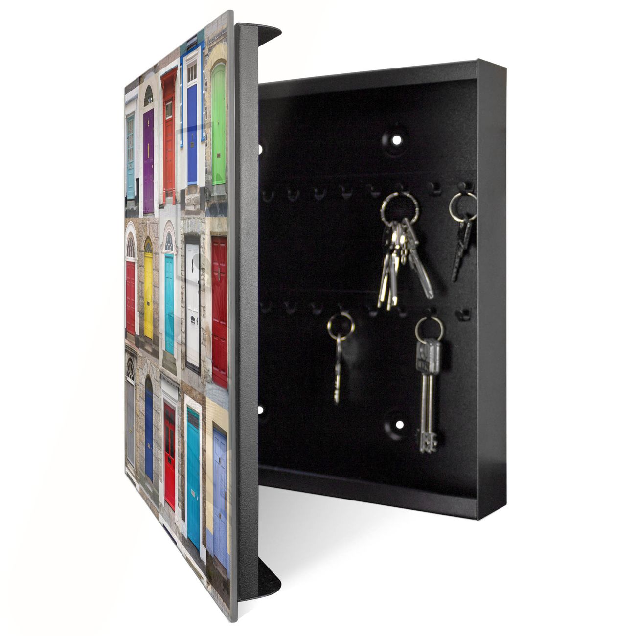 Bringe Ordnung und Eleganz in deinen Eingangsbereich mit dem banjado Schlüsselkasten Motiv Motiv Türen. Die moderne Schlüsselbox kombiniert funktionales Design mit hochwertiger Verarbeitung und wird so zu einem echten Hingucker in Flur, Büro oder Ferienwohnung. ✅ Stilvolle Schlüsselaufbewahrung mit Glasfront im Motiv Motiv Türen Der Design-Schlüsselkasten Motiv Motiv Türen bietet Platz für bis zu 50 Schlüssel, die auf 5 stabilen Reihen mit je 10 Haken übersichtlich verstaut werden. Mit seinen kompakten Maßen von 30 x 30 x 5 cm passt die Schlüsselbox perfekt auch in kleinere Räume. Der schwarz lackierte Stahlkorpus mit rechts angeschlagenem Türscharnier harmoniert mit der Glasfront und fügt sich nahtlos in jedes Wohnambiente ein. Ob als Schlüsselorganizer für Zuhause oder als praktische Lösung für Büros, Praxen und Gewerbe, der banjado Schlüsselkasten sorgt für Ordnung und Übersicht. Dank der magnetischen, mit Kreidestiften beschreibbaren Glasfront kannst du Notizen anheften oder Termine direkt auf der Oberfläche festhalten. Die Schlüsselbox Motiv Motiv Türen zur Wandmontage wird inklusive Befestigungsmaterial geliefert und ist schnell angebracht. So hast du deine Schlüssel jederzeit griffbereit und zugleich stilvoll verstaut. Mit diesem banjado Schlüsselkasten Motiv Motiv Türen kombinierst du praktische Aufbewahrung mit stilvollem Wohndesign. Ob privat oder geschäftlich, die Schlüsselbox sorgt für mehr Ordnung, Übersicht und ein wohnliches Ambiente.Vorteile im Überblick