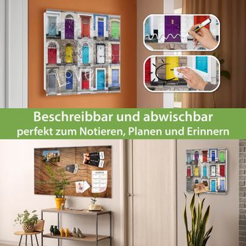 Bringe Ordnung und Eleganz in deinen Eingangsbereich mit dem banjado Schlüsselkasten Motiv Motiv Türen. Die moderne Schlüsselbox kombiniert funktionales Design mit hochwertiger Verarbeitung und wird so zu einem echten Hingucker in Flur, Büro oder Ferienwohnung. ✅ Stilvolle Schlüsselaufbewahrung mit Glasfront im Motiv Motiv Türen Der Design-Schlüsselkasten Motiv Motiv Türen bietet Platz für bis zu 50 Schlüssel, die auf 5 stabilen Reihen mit je 10 Haken übersichtlich verstaut werden. Mit seinen kompakten Maßen von 30 x 30 x 5 cm passt die Schlüsselbox perfekt auch in kleinere Räume. Der weiß lackierte Stahlkorpus mit rechts angeschlagenem Türscharnier harmoniert mit der Glasfront und fügt sich nahtlos in jedes Wohnambiente ein. Ob als Schlüsselorganizer für Zuhause oder als praktische Lösung für Büros, Praxen und Gewerbe, der banjado Schlüsselkasten sorgt für Ordnung und Übersicht. Dank der magnetischen, mit Kreidestiften beschreibbaren Glasfront kannst du Notizen anheften oder Termine direkt auf der Oberfläche festhalten. Die Schlüsselbox Motiv Motiv Türen zur Wandmontage wird inklusive Befestigungsmaterial geliefert und ist schnell angebracht. So hast du deine Schlüssel jederzeit griffbereit und zugleich stilvoll verstaut. Mit diesem banjado Schlüsselkasten Motiv Motiv Türen kombinierst du praktische Aufbewahrung mit stilvollem Wohndesign. Ob privat oder geschäftlich, die Schlüsselbox sorgt für mehr Ordnung, Übersicht und ein wohnliches Ambiente.Vorteile im Überblick