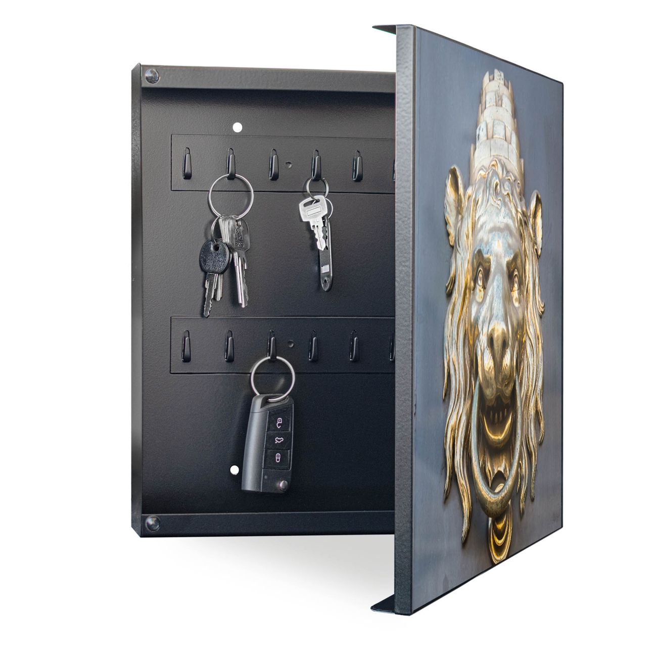 Bringe Ordnung und Eleganz in deinen Eingangsbereich mit dem banjado Schlüsselkasten Motiv Motiv Türklopfer Löwe. Die moderne Schlüsselbox kombiniert funktionales Design mit hochwertiger Verarbeitung und wird so zu einem echten Hingucker in Flur, Büro oder Ferienwohnung. ✅ Stilvolle Schlüsselaufbewahrung mit Motiv Motiv Türklopfer Löwe Der Design-Schlüsselkasten Motiv Motiv Türklopfer Löwe bietet Platz für bis zu 32 Schlüssel, die auf 4 stabilen Reihen mit je 8 Haken übersichtlich verstaut werden. Mit seinen kompakten Maßen von 30 x 30 x 5 cm passt die Schlüsselbox perfekt auch in kleinere Räume. Der schwarz lackierte Stahlkorpus mit rechts angeschlagenem Türscharnier harmoniert mit gedruckten Folie auf der Front und fügt sich nahtlos in jedes Wohnambiente ein. Ob als Schlüsselorganizer für Zuhause oder als praktische Lösung für Büros, Praxen und Gewerbe, der banjado Schlüsselkasten sorgt für Ordnung und Übersicht. Dank der magnetischen, mit Kreidestiften beschreibbaren Folie auf der Front kannst du Notizen anheften oder Termine direkt auf der Oberfläche festhalten. Die Schlüsselbox Motiv Motiv Türklopfer Löwe zur Wandmontage wird inklusive Befestigungsmaterial geliefert und ist schnell angebracht. So hast du deine Schlüssel jederzeit griffbereit und zugleich stilvoll verstaut. Mit diesem banjado Schlüsselkasten Motiv Motiv Türklopfer Löwe kombinierst du praktische Aufbewahrung mit stilvollem Wohndesign. Ob privat oder geschäftlich, die Schlüsselbox sorgt für mehr Ordnung, Übersicht und ein wohnliches Ambiente.Vorteile im Überblick