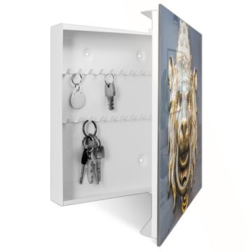 Bringe Ordnung und Eleganz in deinen Eingangsbereich mit dem banjado Schlüsselkasten Motiv Motiv Türklopfer Löwe. Die moderne Schlüsselbox kombiniert funktionales Design mit hochwertiger Verarbeitung und wird so zu einem echten Hingucker in Flur, Büro oder Ferienwohnung. ✅ Stilvolle Schlüsselaufbewahrung mit Glasfront im Motiv Motiv Türklopfer Löwe Der Design-Schlüsselkasten Motiv Motiv Türklopfer Löwe bietet Platz für bis zu 50 Schlüssel, die auf 5 stabilen Reihen mit je 10 Haken übersichtlich verstaut werden. Mit seinen kompakten Maßen von 30 x 30 x 5 cm passt die Schlüsselbox perfekt auch in kleinere Räume. Der weiß lackierte Stahlkorpus mit rechts angeschlagenem Türscharnier harmoniert mit der Glasfront und fügt sich nahtlos in jedes Wohnambiente ein. Ob als Schlüsselorganizer für Zuhause oder als praktische Lösung für Büros, Praxen und Gewerbe, der banjado Schlüsselkasten sorgt für Ordnung und Übersicht. Dank der magnetischen, mit Kreidestiften beschreibbaren Glasfront kannst du Notizen anheften oder Termine direkt auf der Oberfläche festhalten. Die Schlüsselbox Motiv Motiv Türklopfer Löwe zur Wandmontage wird inklusive Befestigungsmaterial geliefert und ist schnell angebracht. So hast du deine Schlüssel jederzeit griffbereit und zugleich stilvoll verstaut. Mit diesem banjado Schlüsselkasten Motiv Motiv Türklopfer Löwe kombinierst du praktische Aufbewahrung mit stilvollem Wohndesign. Ob privat oder geschäftlich, die Schlüsselbox sorgt für mehr Ordnung, Übersicht und ein wohnliches Ambiente.Vorteile im Überblick