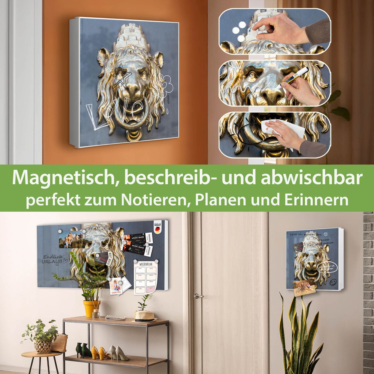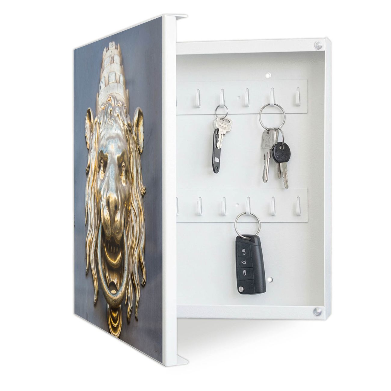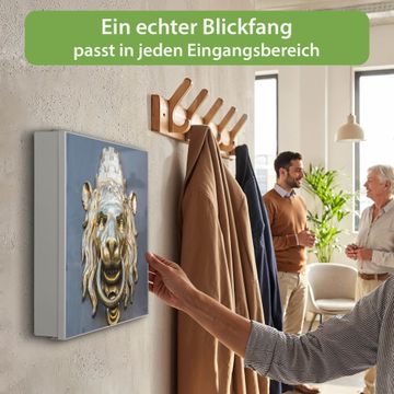 Bringe Ordnung und Eleganz in deinen Eingangsbereich mit dem banjado Schlüsselkasten Motiv Motiv Türklopfer Löwe. Die moderne Schlüsselbox kombiniert funktionales Design mit hochwertiger Verarbeitung und wird so zu einem echten Hingucker in Flur, Büro oder Ferienwohnung. ✅ Stilvolle Schlüsselaufbewahrung mit Motiv Motiv Türklopfer Löwe Der Design-Schlüsselkasten Motiv Motiv Türklopfer Löwe bietet Platz für bis zu 32 Schlüssel, die auf 4 stabilen Reihen mit je 8 Haken übersichtlich verstaut werden. Mit seinen kompakten Maßen von 30 x 30 x 5 cm passt die Schlüsselbox perfekt auch in kleinere Räume. Der weiß lackierte Stahlkorpus mit links angeschlagenem Türscharnier harmoniert mit gedruckten Folie auf der Front und fügt sich nahtlos in jedes Wohnambiente ein. Ob als Schlüsselorganizer für Zuhause oder als praktische Lösung für Büros, Praxen und Gewerbe, der banjado Schlüsselkasten sorgt für Ordnung und Übersicht. Dank der magnetischen, mit Kreidestiften beschreibbaren Folie auf der Front kannst du Notizen anheften oder Termine direkt auf der Oberfläche festhalten. Die Schlüsselbox Motiv Motiv Türklopfer Löwe zur Wandmontage wird inklusive Befestigungsmaterial geliefert und ist schnell angebracht. So hast du deine Schlüssel jederzeit griffbereit und zugleich stilvoll verstaut. Mit diesem banjado Schlüsselkasten Motiv Motiv Türklopfer Löwe kombinierst du praktische Aufbewahrung mit stilvollem Wohndesign. Ob privat oder geschäftlich, die Schlüsselbox sorgt für mehr Ordnung, Übersicht und ein wohnliches Ambiente.Vorteile im Überblick