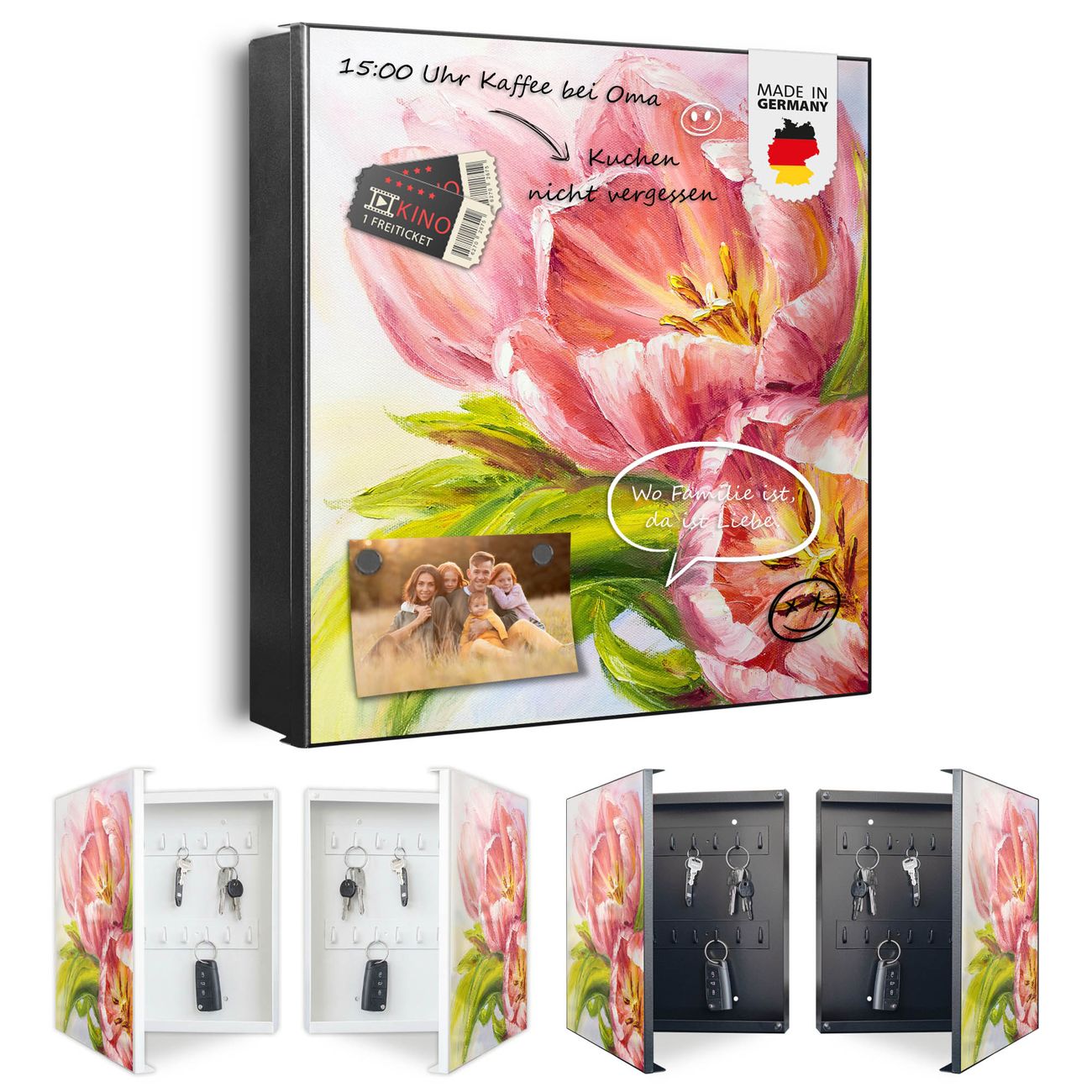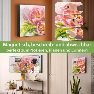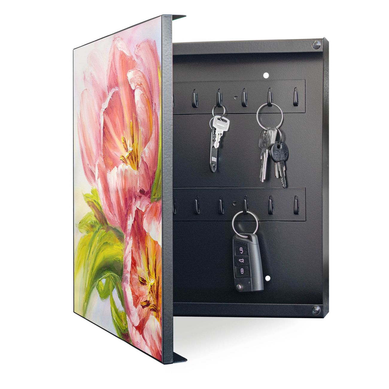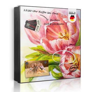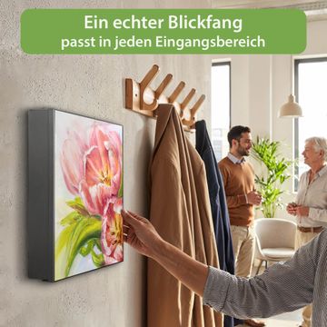Bringe Ordnung und Eleganz in deinen Eingangsbereich mit dem banjado Schlüsselkasten Motiv Motiv Tulpen Detail. Die moderne Schlüsselbox kombiniert funktionales Design mit hochwertiger Verarbeitung und wird so zu einem echten Hingucker in Flur, Büro oder Ferienwohnung. ✅ Stilvolle Schlüsselaufbewahrung mit Motiv Motiv Tulpen Detail Der Design-Schlüsselkasten Motiv Motiv Tulpen Detail bietet Platz für bis zu 32 Schlüssel, die auf 4 stabilen Reihen mit je 8 Haken übersichtlich verstaut werden. Mit seinen kompakten Maßen von 30 x 30 x 5 cm passt die Schlüsselbox perfekt auch in kleinere Räume. Der schwarz lackierte Stahlkorpus mit links angeschlagenem Türscharnier harmoniert mit gedruckten Folie auf der Front und fügt sich nahtlos in jedes Wohnambiente ein. Ob als Schlüsselorganizer für Zuhause oder als praktische Lösung für Büros, Praxen und Gewerbe, der banjado Schlüsselkasten sorgt für Ordnung und Übersicht. Dank der magnetischen, mit Kreidestiften beschreibbaren Folie auf der Front kannst du Notizen anheften oder Termine direkt auf der Oberfläche festhalten. Die Schlüsselbox Motiv Motiv Tulpen Detail zur Wandmontage wird inklusive Befestigungsmaterial geliefert und ist schnell angebracht. So hast du deine Schlüssel jederzeit griffbereit und zugleich stilvoll verstaut. Mit diesem banjado Schlüsselkasten Motiv Motiv Tulpen Detail kombinierst du praktische Aufbewahrung mit stilvollem Wohndesign. Ob privat oder geschäftlich, die Schlüsselbox sorgt für mehr Ordnung, Übersicht und ein wohnliches Ambiente.Vorteile im Überblick