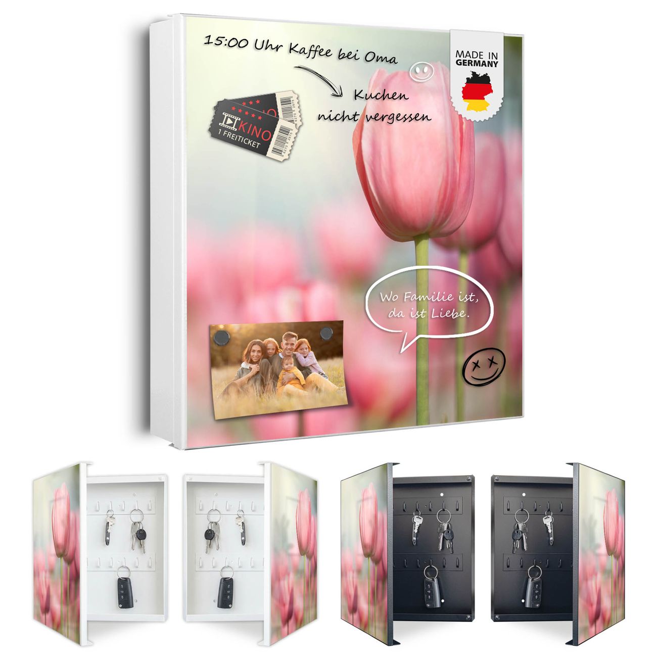 Bringe Ordnung und Eleganz in deinen Eingangsbereich mit dem banjado Schlüsselkasten Motiv Motiv Tulpen. Die moderne Schlüsselbox kombiniert funktionales Design mit hochwertiger Verarbeitung und wird so zu einem echten Hingucker in Flur, Büro oder Ferienwohnung. ✅ Stilvolle Schlüsselaufbewahrung mit Motiv Motiv Tulpen Der Design-Schlüsselkasten Motiv Motiv Tulpen bietet Platz für bis zu 32 Schlüssel, die auf 4 stabilen Reihen mit je 8 Haken übersichtlich verstaut werden. Mit seinen kompakten Maßen von 30 x 30 x 5 cm passt die Schlüsselbox perfekt auch in kleinere Räume. Der weiß lackierte Stahlkorpus mit rechts angeschlagenem Türscharnier harmoniert mit gedruckten Folie auf der Front und fügt sich nahtlos in jedes Wohnambiente ein. Ob als Schlüsselorganizer für Zuhause oder als praktische Lösung für Büros, Praxen und Gewerbe, der banjado Schlüsselkasten sorgt für Ordnung und Übersicht. Dank der magnetischen, mit Kreidestiften beschreibbaren Folie auf der Front kannst du Notizen anheften oder Termine direkt auf der Oberfläche festhalten. Die Schlüsselbox Motiv Motiv Tulpen zur Wandmontage wird inklusive Befestigungsmaterial geliefert und ist schnell angebracht. So hast du deine Schlüssel jederzeit griffbereit und zugleich stilvoll verstaut. Mit diesem banjado Schlüsselkasten Motiv Motiv Tulpen kombinierst du praktische Aufbewahrung mit stilvollem Wohndesign. Ob privat oder geschäftlich, die Schlüsselbox sorgt für mehr Ordnung, Übersicht und ein wohnliches Ambiente.Vorteile im Überblick