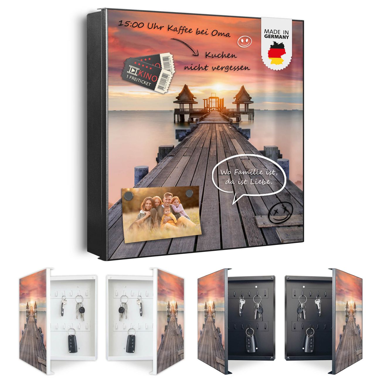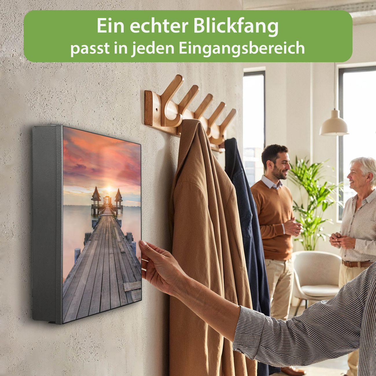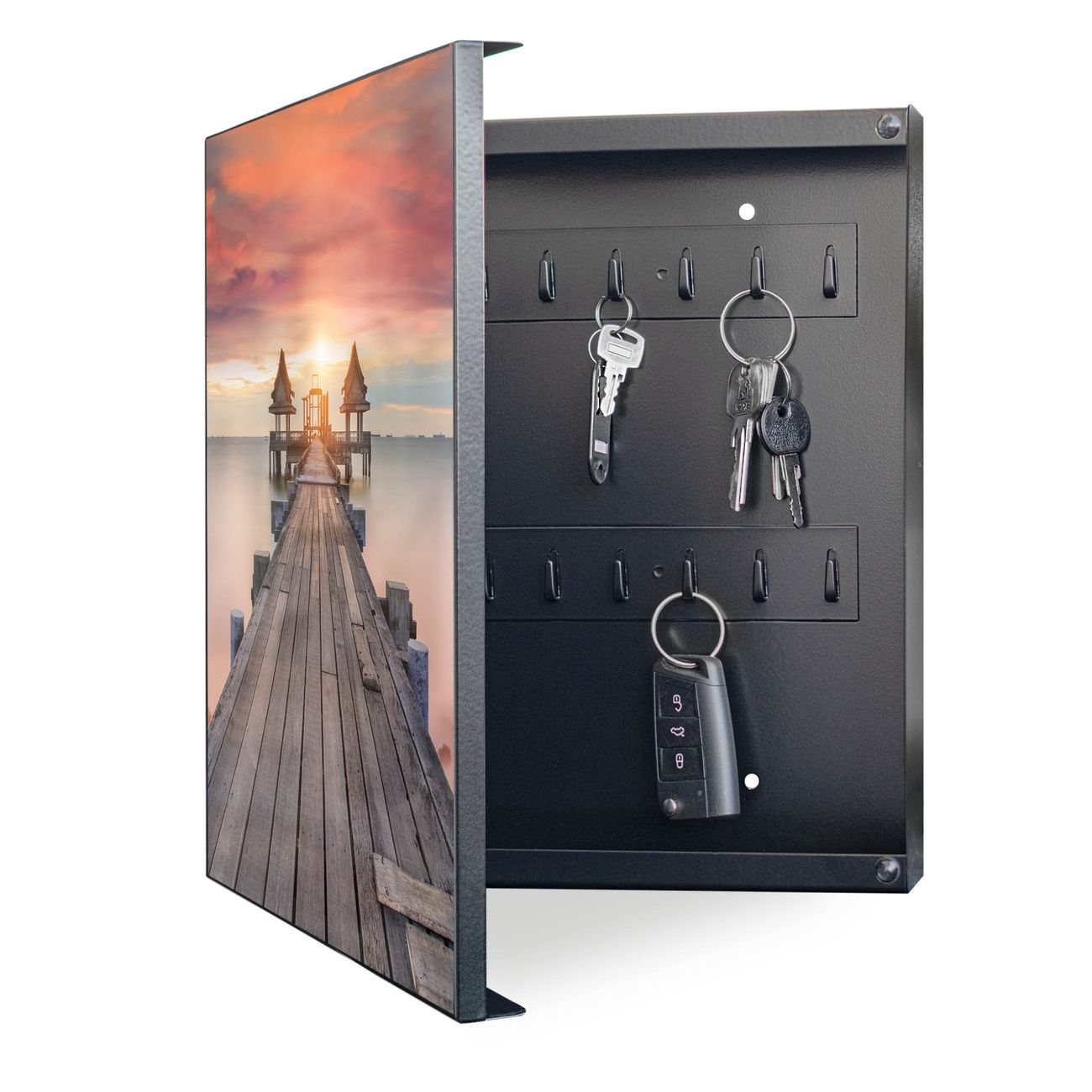 Bringe Ordnung und Eleganz in deinen Eingangsbereich mit dem banjado Schlüsselkasten Motiv Motiv Überm Nebelmeer. Die moderne Schlüsselbox kombiniert funktionales Design mit hochwertiger Verarbeitung und wird so zu einem echten Hingucker in Flur, Büro oder Ferienwohnung. ✅ Stilvolle Schlüsselaufbewahrung mit Motiv Motiv Überm Nebelmeer Der Design-Schlüsselkasten Motiv Motiv Überm Nebelmeer bietet Platz für bis zu 32 Schlüssel, die auf 4 stabilen Reihen mit je 8 Haken übersichtlich verstaut werden. Mit seinen kompakten Maßen von 30 x 30 x 5 cm passt die Schlüsselbox perfekt auch in kleinere Räume. Der schwarz lackierte Stahlkorpus mit links angeschlagenem Türscharnier harmoniert mit gedruckten Folie auf der Front und fügt sich nahtlos in jedes Wohnambiente ein. Ob als Schlüsselorganizer für Zuhause oder als praktische Lösung für Büros, Praxen und Gewerbe, der banjado Schlüsselkasten sorgt für Ordnung und Übersicht. Dank der magnetischen, mit Kreidestiften beschreibbaren Folie auf der Front kannst du Notizen anheften oder Termine direkt auf der Oberfläche festhalten. Die Schlüsselbox Motiv Motiv Überm Nebelmeer zur Wandmontage wird inklusive Befestigungsmaterial geliefert und ist schnell angebracht. So hast du deine Schlüssel jederzeit griffbereit und zugleich stilvoll verstaut. Mit diesem banjado Schlüsselkasten Motiv Motiv Überm Nebelmeer kombinierst du praktische Aufbewahrung mit stilvollem Wohndesign. Ob privat oder geschäftlich, die Schlüsselbox sorgt für mehr Ordnung, Übersicht und ein wohnliches Ambiente.Vorteile im Überblick