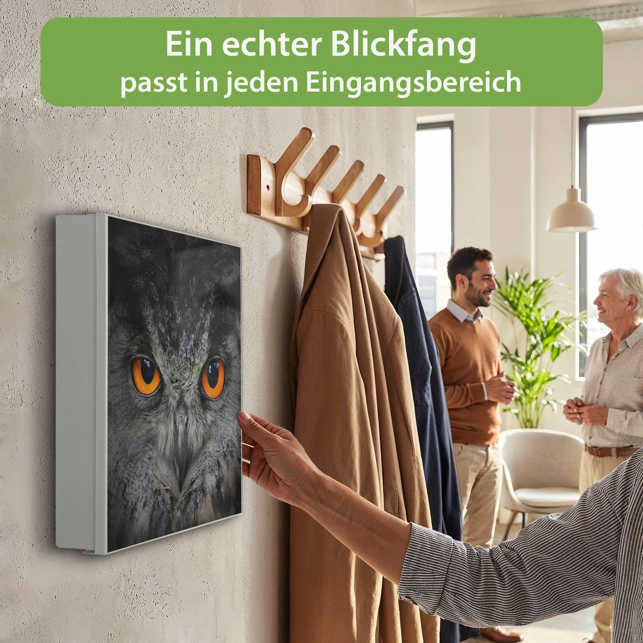 Bringe Ordnung und Eleganz in deinen Eingangsbereich mit dem banjado Schlüsselkasten Motiv Motiv Uhu. Die moderne Schlüsselbox kombiniert funktionales Design mit hochwertiger Verarbeitung und wird so zu einem echten Hingucker in Flur, Büro oder Ferienwohnung. ✅ Stilvolle Schlüsselaufbewahrung mit Motiv Motiv Uhu Der Design-Schlüsselkasten Motiv Motiv Uhu bietet Platz für bis zu 32 Schlüssel, die auf 4 stabilen Reihen mit je 8 Haken übersichtlich verstaut werden. Mit seinen kompakten Maßen von 30 x 30 x 5 cm passt die Schlüsselbox perfekt auch in kleinere Räume. Der weiß lackierte Stahlkorpus mit links angeschlagenem Türscharnier harmoniert mit gedruckten Folie auf der Front und fügt sich nahtlos in jedes Wohnambiente ein. Ob als Schlüsselorganizer für Zuhause oder als praktische Lösung für Büros, Praxen und Gewerbe, der banjado Schlüsselkasten sorgt für Ordnung und Übersicht. Dank der magnetischen, mit Kreidestiften beschreibbaren Folie auf der Front kannst du Notizen anheften oder Termine direkt auf der Oberfläche festhalten. Die Schlüsselbox Motiv Motiv Uhu zur Wandmontage wird inklusive Befestigungsmaterial geliefert und ist schnell angebracht. So hast du deine Schlüssel jederzeit griffbereit und zugleich stilvoll verstaut. Mit diesem banjado Schlüsselkasten Motiv Motiv Uhu kombinierst du praktische Aufbewahrung mit stilvollem Wohndesign. Ob privat oder geschäftlich, die Schlüsselbox sorgt für mehr Ordnung, Übersicht und ein wohnliches Ambiente.Vorteile im Überblick