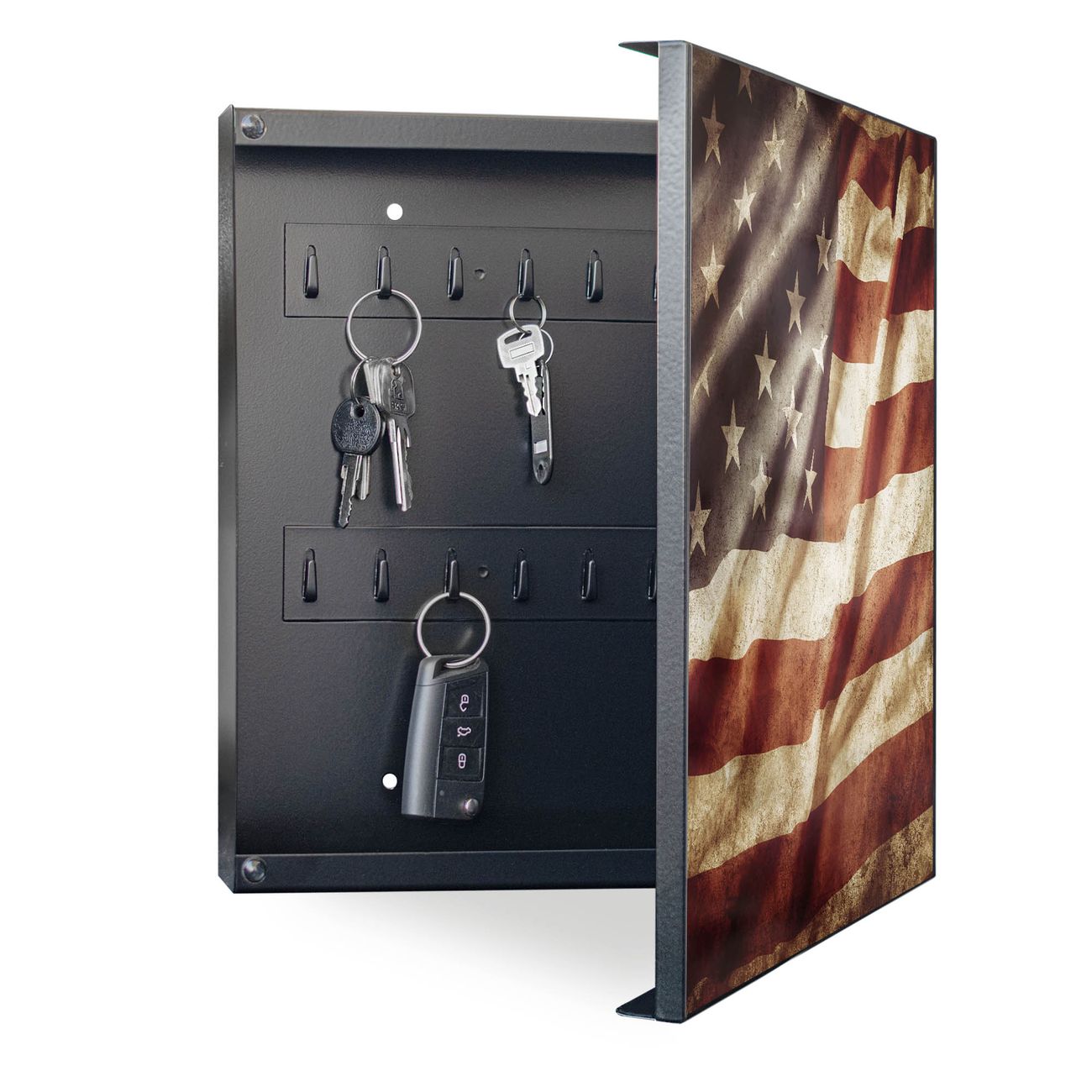 Bringe Ordnung und Eleganz in deinen Eingangsbereich mit dem banjado Schlüsselkasten Motiv Motiv United States. Die moderne Schlüsselbox kombiniert funktionales Design mit hochwertiger Verarbeitung und wird so zu einem echten Hingucker in Flur, Büro oder Ferienwohnung. ✅ Stilvolle Schlüsselaufbewahrung mit Motiv Motiv United States Der Design-Schlüsselkasten Motiv Motiv United States bietet Platz für bis zu 32 Schlüssel, die auf 4 stabilen Reihen mit je 8 Haken übersichtlich verstaut werden. Mit seinen kompakten Maßen von 30 x 30 x 5 cm passt die Schlüsselbox perfekt auch in kleinere Räume. Der schwarz lackierte Stahlkorpus mit rechts angeschlagenem Türscharnier harmoniert mit gedruckten Folie auf der Front und fügt sich nahtlos in jedes Wohnambiente ein. Ob als Schlüsselorganizer für Zuhause oder als praktische Lösung für Büros, Praxen und Gewerbe, der banjado Schlüsselkasten sorgt für Ordnung und Übersicht. Dank der magnetischen, mit Kreidestiften beschreibbaren Folie auf der Front kannst du Notizen anheften oder Termine direkt auf der Oberfläche festhalten. Die Schlüsselbox Motiv Motiv United States zur Wandmontage wird inklusive Befestigungsmaterial geliefert und ist schnell angebracht. So hast du deine Schlüssel jederzeit griffbereit und zugleich stilvoll verstaut. Mit diesem banjado Schlüsselkasten Motiv Motiv United States kombinierst du praktische Aufbewahrung mit stilvollem Wohndesign. Ob privat oder geschäftlich, die Schlüsselbox sorgt für mehr Ordnung, Übersicht und ein wohnliches Ambiente.Vorteile im Überblick