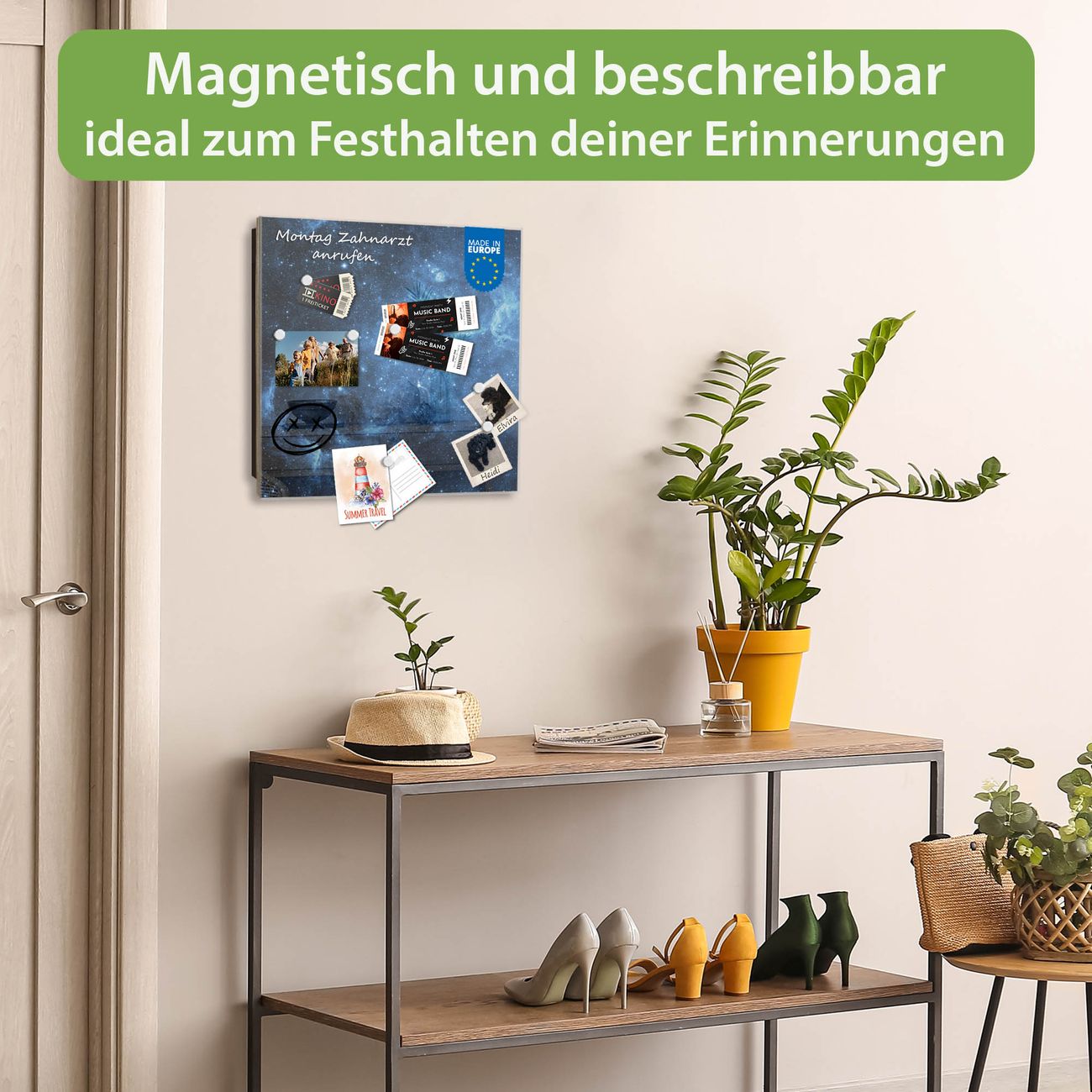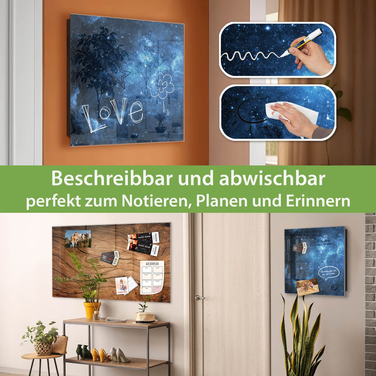 Bringe Ordnung und Eleganz in deinen Eingangsbereich mit dem banjado Schlüsselkasten Motiv Motiv Universum. Die moderne Schlüsselbox kombiniert funktionales Design mit hochwertiger Verarbeitung und wird so zu einem echten Hingucker in Flur, Büro oder Ferienwohnung. ✅ Stilvolle Schlüsselaufbewahrung mit Glasfront im Motiv Motiv Universum Der Design-Schlüsselkasten Motiv Motiv Universum bietet Platz für bis zu 50 Schlüssel, die auf 5 stabilen Reihen mit je 10 Haken übersichtlich verstaut werden. Mit seinen kompakten Maßen von 30 x 30 x 5 cm passt die Schlüsselbox perfekt auch in kleinere Räume. Der schwarz lackierte Stahlkorpus mit rechts angeschlagenem Türscharnier harmoniert mit der Glasfront und fügt sich nahtlos in jedes Wohnambiente ein. Ob als Schlüsselorganizer für Zuhause oder als praktische Lösung für Büros, Praxen und Gewerbe, der banjado Schlüsselkasten sorgt für Ordnung und Übersicht. Dank der magnetischen, mit Kreidestiften beschreibbaren Glasfront kannst du Notizen anheften oder Termine direkt auf der Oberfläche festhalten. Die Schlüsselbox Motiv Motiv Universum zur Wandmontage wird inklusive Befestigungsmaterial geliefert und ist schnell angebracht. So hast du deine Schlüssel jederzeit griffbereit und zugleich stilvoll verstaut. Mit diesem banjado Schlüsselkasten Motiv Motiv Universum kombinierst du praktische Aufbewahrung mit stilvollem Wohndesign. Ob privat oder geschäftlich, die Schlüsselbox sorgt für mehr Ordnung, Übersicht und ein wohnliches Ambiente.Vorteile im Überblick