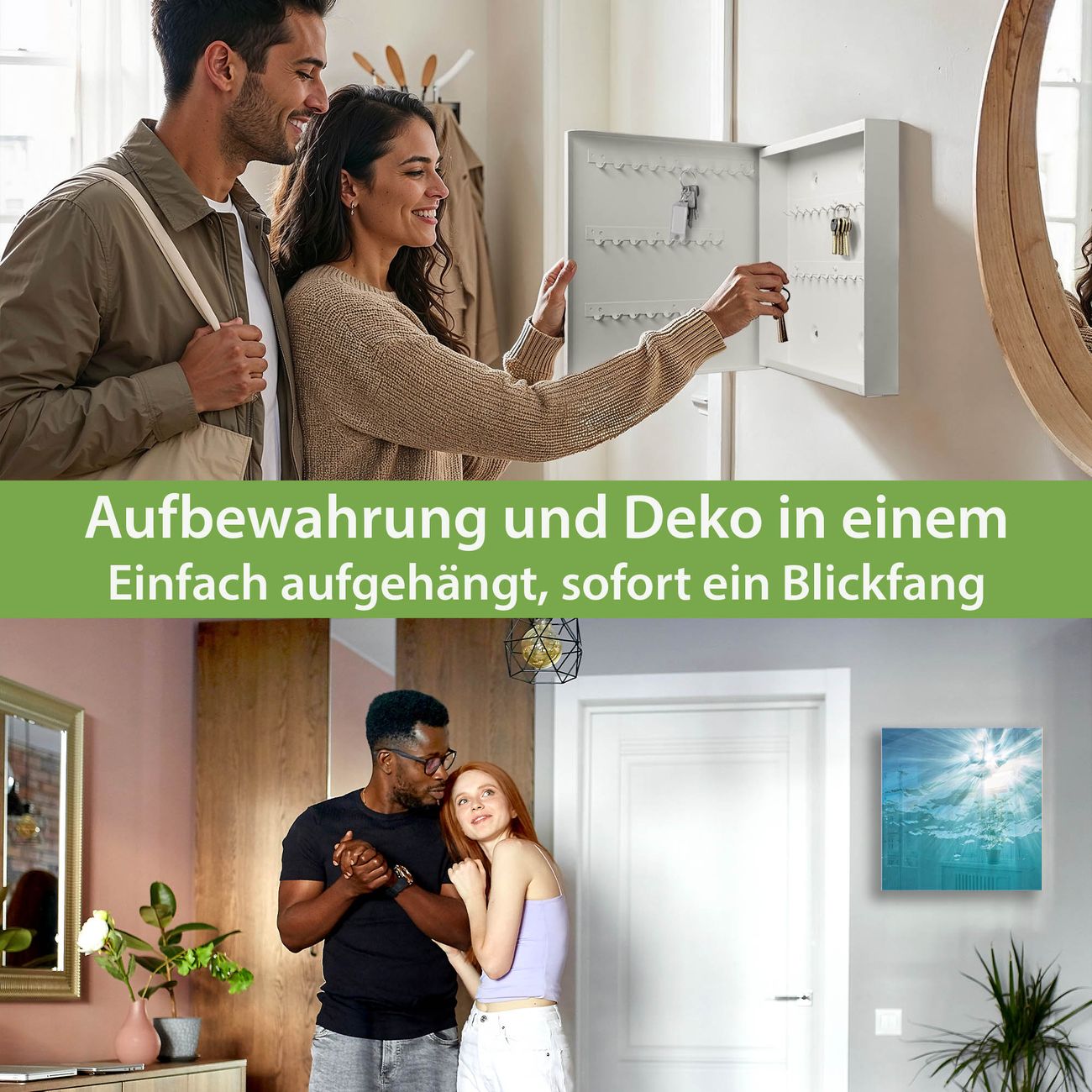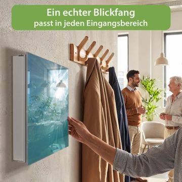 Bringe Ordnung und Eleganz in deinen Eingangsbereich mit dem banjado Schlüsselkasten Motiv Motiv Unter der Oberfläche. Die moderne Schlüsselbox kombiniert funktionales Design mit hochwertiger Verarbeitung und wird so zu einem echten Hingucker in Flur, Büro oder Ferienwohnung. ✅ Stilvolle Schlüsselaufbewahrung mit Glasfront im Motiv Motiv Unter der Oberfläche Der Design-Schlüsselkasten Motiv Motiv Unter der Oberfläche bietet Platz für bis zu 50 Schlüssel, die auf 5 stabilen Reihen mit je 10 Haken übersichtlich verstaut werden. Mit seinen kompakten Maßen von 30 x 30 x 5 cm passt die Schlüsselbox perfekt auch in kleinere Räume. Der weiß lackierte Stahlkorpus mit rechts angeschlagenem Türscharnier harmoniert mit der Glasfront und fügt sich nahtlos in jedes Wohnambiente ein. Ob als Schlüsselorganizer für Zuhause oder als praktische Lösung für Büros, Praxen und Gewerbe, der banjado Schlüsselkasten sorgt für Ordnung und Übersicht. Dank der magnetischen, mit Kreidestiften beschreibbaren Glasfront kannst du Notizen anheften oder Termine direkt auf der Oberfläche festhalten. Die Schlüsselbox Motiv Motiv Unter der Oberfläche zur Wandmontage wird inklusive Befestigungsmaterial geliefert und ist schnell angebracht. So hast du deine Schlüssel jederzeit griffbereit und zugleich stilvoll verstaut. Mit diesem banjado Schlüsselkasten Motiv Motiv Unter der Oberfläche kombinierst du praktische Aufbewahrung mit stilvollem Wohndesign. Ob privat oder geschäftlich, die Schlüsselbox sorgt für mehr Ordnung, Übersicht und ein wohnliches Ambiente.Vorteile im Überblick