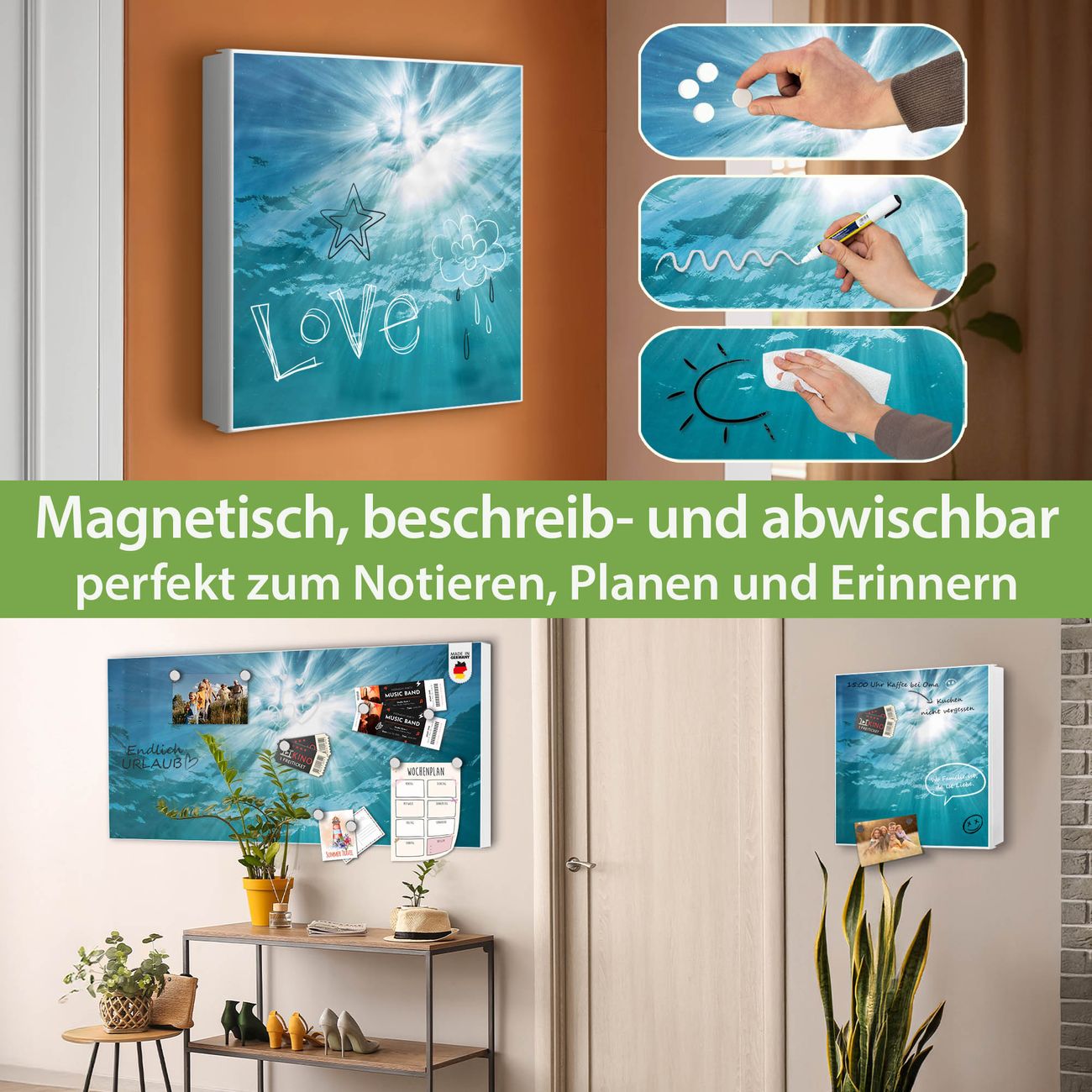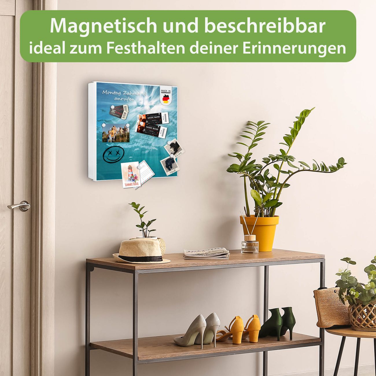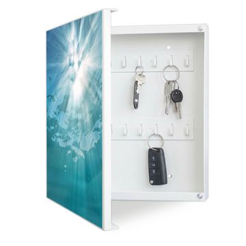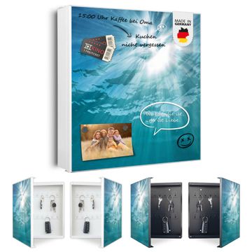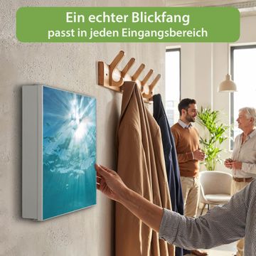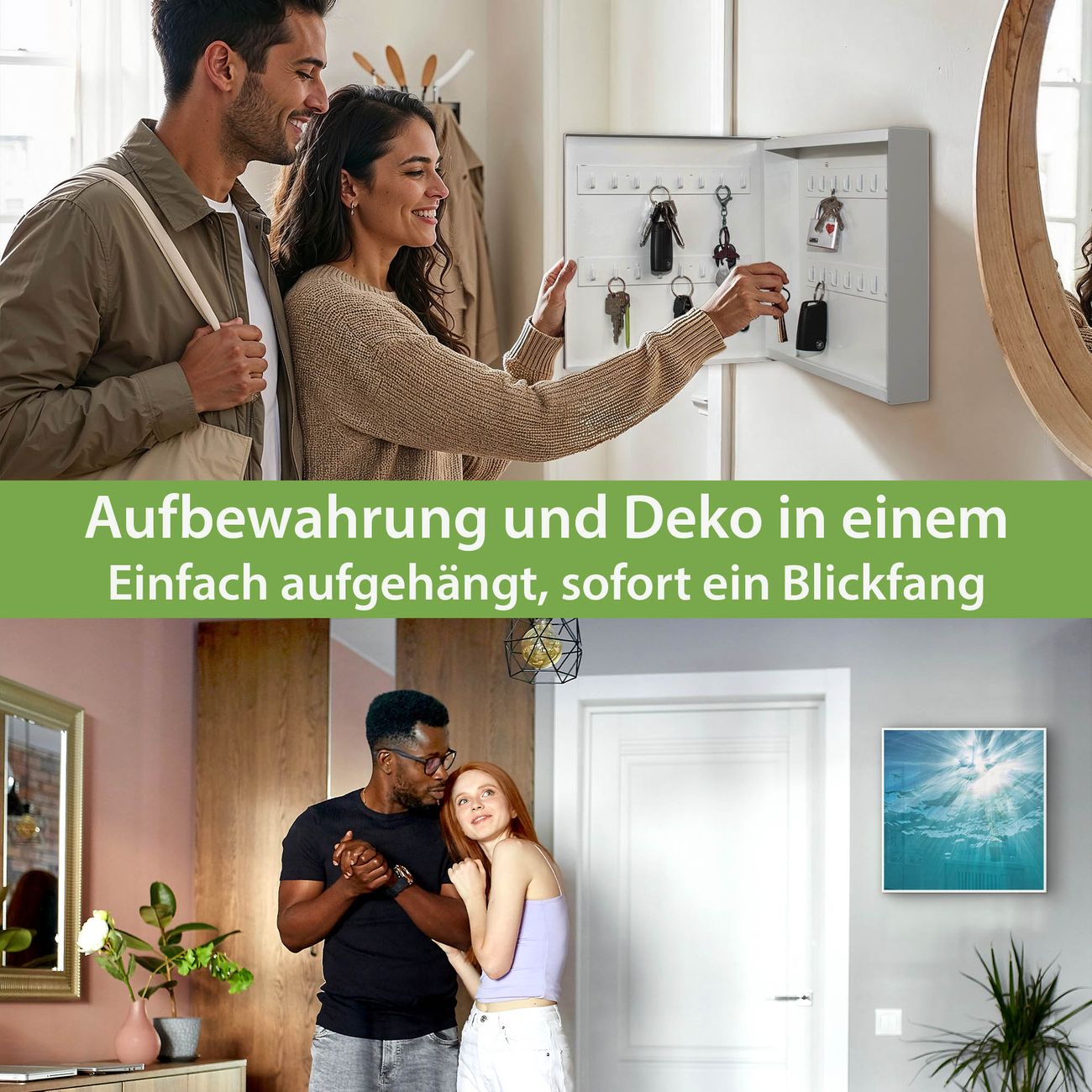 Bringe Ordnung und Eleganz in deinen Eingangsbereich mit dem banjado Schlüsselkasten Motiv Motiv Unter der Oberfläche. Die moderne Schlüsselbox kombiniert funktionales Design mit hochwertiger Verarbeitung und wird so zu einem echten Hingucker in Flur, Büro oder Ferienwohnung. ✅ Stilvolle Schlüsselaufbewahrung mit Motiv Motiv Unter der Oberfläche Der Design-Schlüsselkasten Motiv Motiv Unter der Oberfläche bietet Platz für bis zu 32 Schlüssel, die auf 4 stabilen Reihen mit je 8 Haken übersichtlich verstaut werden. Mit seinen kompakten Maßen von 30 x 30 x 5 cm passt die Schlüsselbox perfekt auch in kleinere Räume. Der weiß lackierte Stahlkorpus mit links angeschlagenem Türscharnier harmoniert mit gedruckten Folie auf der Front und fügt sich nahtlos in jedes Wohnambiente ein. Ob als Schlüsselorganizer für Zuhause oder als praktische Lösung für Büros, Praxen und Gewerbe, der banjado Schlüsselkasten sorgt für Ordnung und Übersicht. Dank der magnetischen, mit Kreidestiften beschreibbaren Folie auf der Front kannst du Notizen anheften oder Termine direkt auf der Oberfläche festhalten. Die Schlüsselbox Motiv Motiv Unter der Oberfläche zur Wandmontage wird inklusive Befestigungsmaterial geliefert und ist schnell angebracht. So hast du deine Schlüssel jederzeit griffbereit und zugleich stilvoll verstaut. Mit diesem banjado Schlüsselkasten Motiv Motiv Unter der Oberfläche kombinierst du praktische Aufbewahrung mit stilvollem Wohndesign. Ob privat oder geschäftlich, die Schlüsselbox sorgt für mehr Ordnung, Übersicht und ein wohnliches Ambiente.Vorteile im Überblick