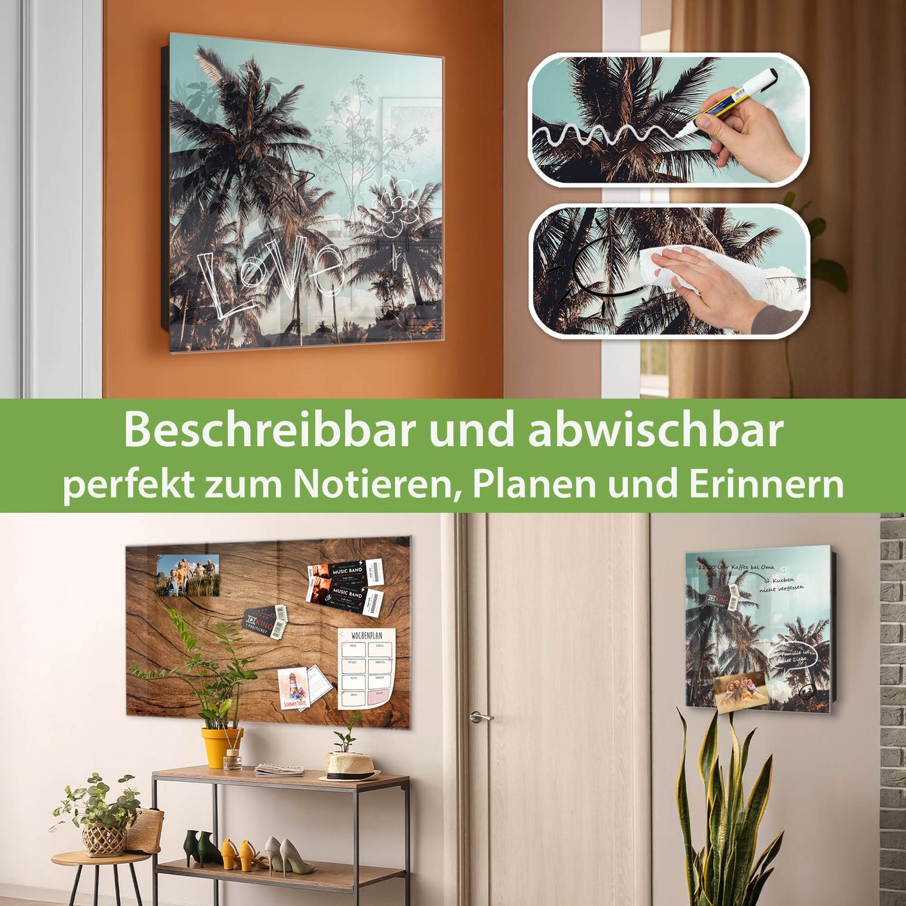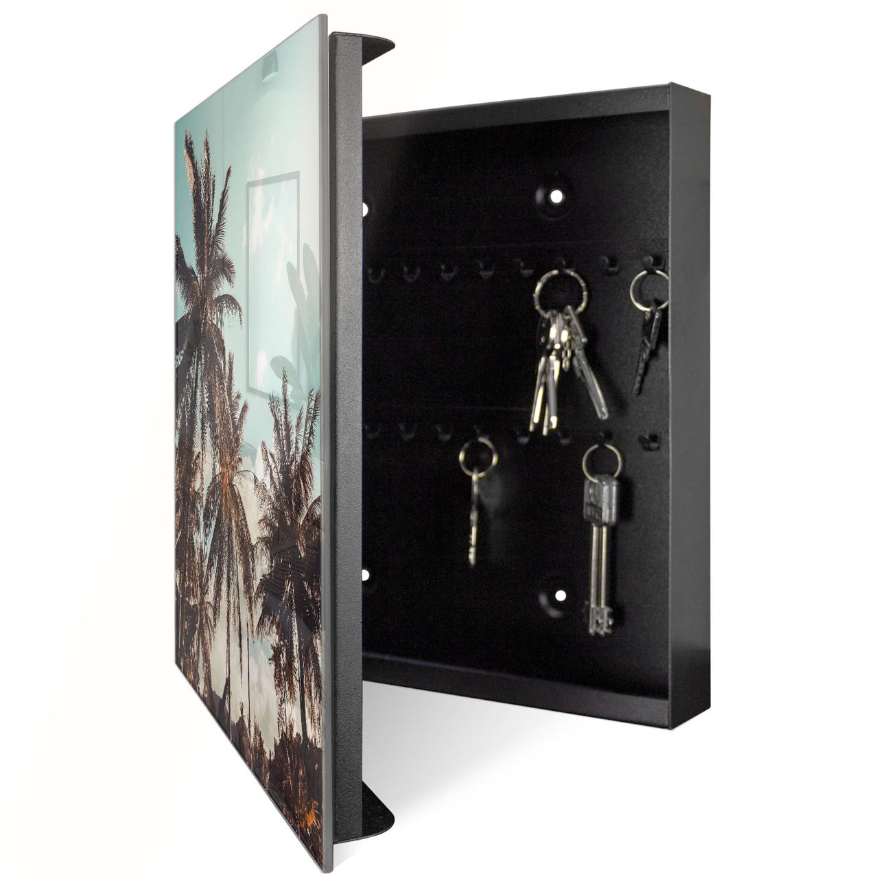 Bringe Ordnung und Eleganz in deinen Eingangsbereich mit dem banjado Schlüsselkasten Motiv Motiv Unter Palmen. Die moderne Schlüsselbox kombiniert funktionales Design mit hochwertiger Verarbeitung und wird so zu einem echten Hingucker in Flur, Büro oder Ferienwohnung. ✅ Stilvolle Schlüsselaufbewahrung mit Glasfront im Motiv Motiv Unter Palmen Der Design-Schlüsselkasten Motiv Motiv Unter Palmen bietet Platz für bis zu 50 Schlüssel, die auf 5 stabilen Reihen mit je 10 Haken übersichtlich verstaut werden. Mit seinen kompakten Maßen von 30 x 30 x 5 cm passt die Schlüsselbox perfekt auch in kleinere Räume. Der schwarz lackierte Stahlkorpus mit rechts angeschlagenem Türscharnier harmoniert mit der Glasfront und fügt sich nahtlos in jedes Wohnambiente ein. Ob als Schlüsselorganizer für Zuhause oder als praktische Lösung für Büros, Praxen und Gewerbe, der banjado Schlüsselkasten sorgt für Ordnung und Übersicht. Dank der magnetischen, mit Kreidestiften beschreibbaren Glasfront kannst du Notizen anheften oder Termine direkt auf der Oberfläche festhalten. Die Schlüsselbox Motiv Motiv Unter Palmen zur Wandmontage wird inklusive Befestigungsmaterial geliefert und ist schnell angebracht. So hast du deine Schlüssel jederzeit griffbereit und zugleich stilvoll verstaut. Mit diesem banjado Schlüsselkasten Motiv Motiv Unter Palmen kombinierst du praktische Aufbewahrung mit stilvollem Wohndesign. Ob privat oder geschäftlich, die Schlüsselbox sorgt für mehr Ordnung, Übersicht und ein wohnliches Ambiente.Vorteile im Überblick
