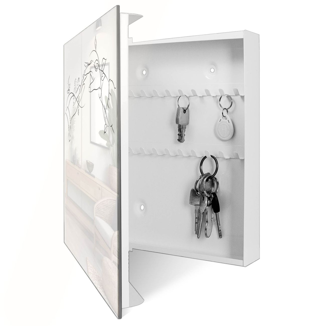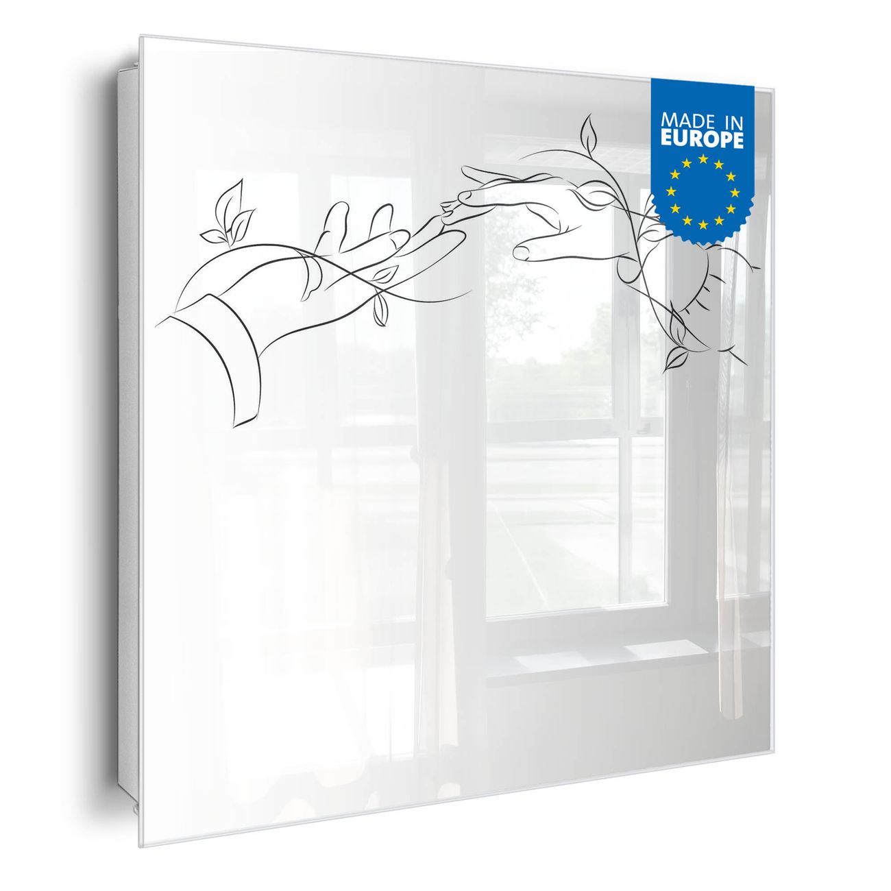 Bringe Ordnung und Eleganz in deinen Eingangsbereich mit dem banjado Schlüsselkasten Motiv Motiv Verbindende Hände. Die moderne Schlüsselbox kombiniert funktionales Design mit hochwertiger Verarbeitung und wird so zu einem echten Hingucker in Flur, Büro oder Ferienwohnung. ✅ Stilvolle Schlüsselaufbewahrung mit Glasfront im Motiv Motiv Verbindende Hände Der Design-Schlüsselkasten Motiv Motiv Verbindende Hände bietet Platz für bis zu 50 Schlüssel, die auf 5 stabilen Reihen mit je 10 Haken übersichtlich verstaut werden. Mit seinen kompakten Maßen von 30 x 30 x 5 cm passt die Schlüsselbox perfekt auch in kleinere Räume. Der weiß lackierte Stahlkorpus mit rechts angeschlagenem Türscharnier harmoniert mit der Glasfront und fügt sich nahtlos in jedes Wohnambiente ein. Ob als Schlüsselorganizer für Zuhause oder als praktische Lösung für Büros, Praxen und Gewerbe, der banjado Schlüsselkasten sorgt für Ordnung und Übersicht. Dank der magnetischen, mit Kreidestiften beschreibbaren Glasfront kannst du Notizen anheften oder Termine direkt auf der Oberfläche festhalten. Die Schlüsselbox Motiv Motiv Verbindende Hände zur Wandmontage wird inklusive Befestigungsmaterial geliefert und ist schnell angebracht. So hast du deine Schlüssel jederzeit griffbereit und zugleich stilvoll verstaut. Mit diesem banjado Schlüsselkasten Motiv Motiv Verbindende Hände kombinierst du praktische Aufbewahrung mit stilvollem Wohndesign. Ob privat oder geschäftlich, die Schlüsselbox sorgt für mehr Ordnung, Übersicht und ein wohnliches Ambiente.Vorteile im Überblick