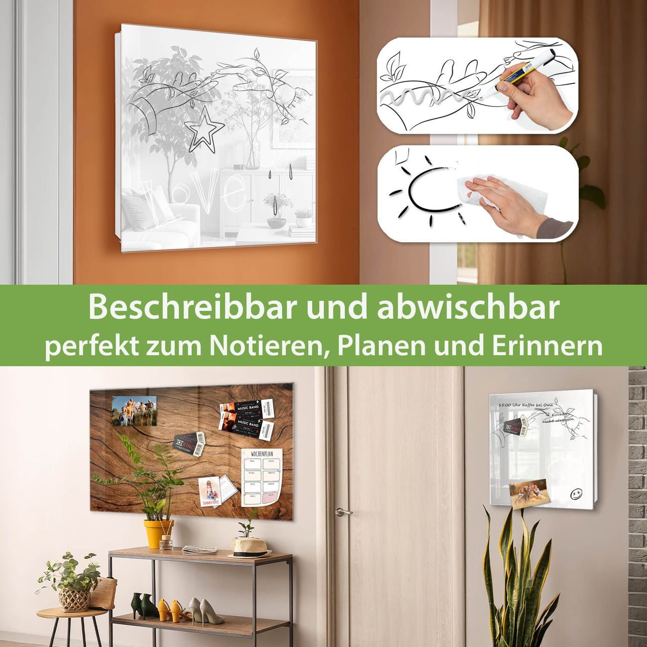 ✅ Magnetisch und mit Kreidestift beschreibbar, gehärtetes Glas, links angeschlagene TürOrdnung und Design in einem