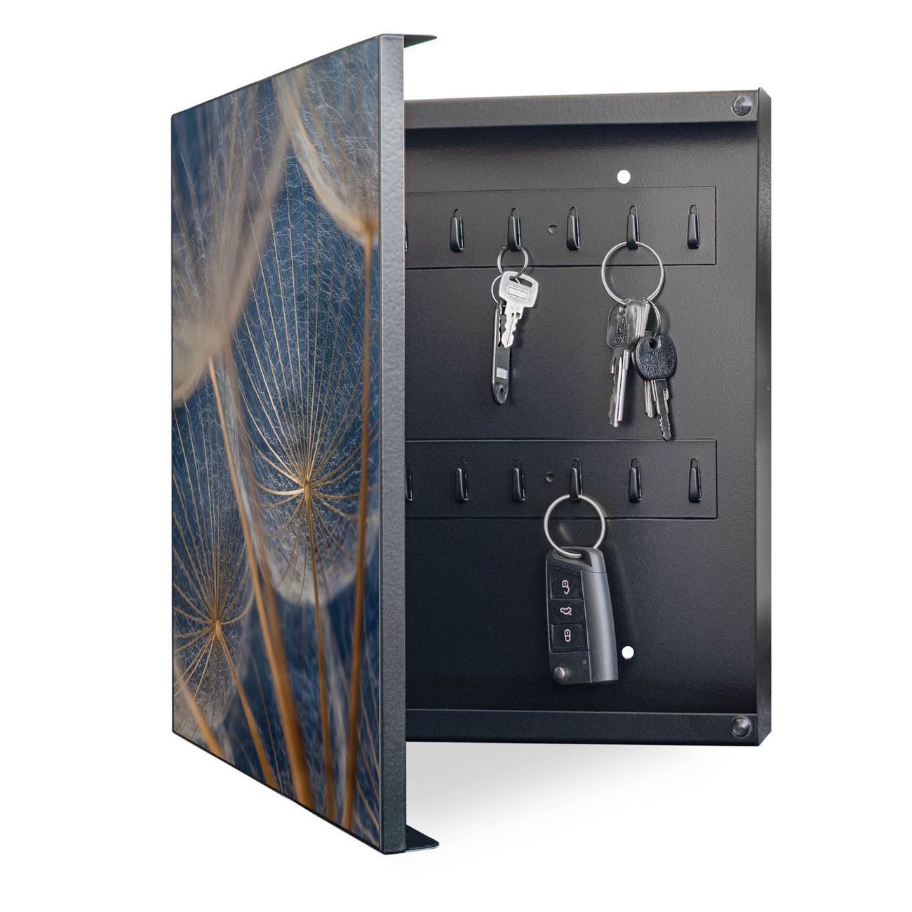 Bringe Ordnung und Eleganz in deinen Eingangsbereich mit dem banjado Schlüsselkasten Motiv Motiv Verblüht. Die moderne Schlüsselbox kombiniert funktionales Design mit hochwertiger Verarbeitung und wird so zu einem echten Hingucker in Flur, Büro oder Ferienwohnung. ✅ Stilvolle Schlüsselaufbewahrung mit Motiv Motiv Verblüht Der Design-Schlüsselkasten Motiv Motiv Verblüht bietet Platz für bis zu 32 Schlüssel, die auf 4 stabilen Reihen mit je 8 Haken übersichtlich verstaut werden. Mit seinen kompakten Maßen von 30 x 30 x 5 cm passt die Schlüsselbox perfekt auch in kleinere Räume. Der schwarz lackierte Stahlkorpus mit links angeschlagenem Türscharnier harmoniert mit gedruckten Folie auf der Front und fügt sich nahtlos in jedes Wohnambiente ein. Ob als Schlüsselorganizer für Zuhause oder als praktische Lösung für Büros, Praxen und Gewerbe, der banjado Schlüsselkasten sorgt für Ordnung und Übersicht. Dank der magnetischen, mit Kreidestiften beschreibbaren Folie auf der Front kannst du Notizen anheften oder Termine direkt auf der Oberfläche festhalten. Die Schlüsselbox Motiv Motiv Verblüht zur Wandmontage wird inklusive Befestigungsmaterial geliefert und ist schnell angebracht. So hast du deine Schlüssel jederzeit griffbereit und zugleich stilvoll verstaut. Mit diesem banjado Schlüsselkasten Motiv Motiv Verblüht kombinierst du praktische Aufbewahrung mit stilvollem Wohndesign. Ob privat oder geschäftlich, die Schlüsselbox sorgt für mehr Ordnung, Übersicht und ein wohnliches Ambiente.Vorteile im Überblick