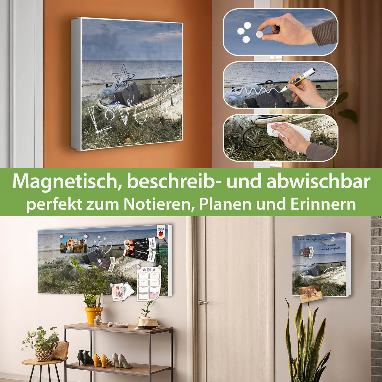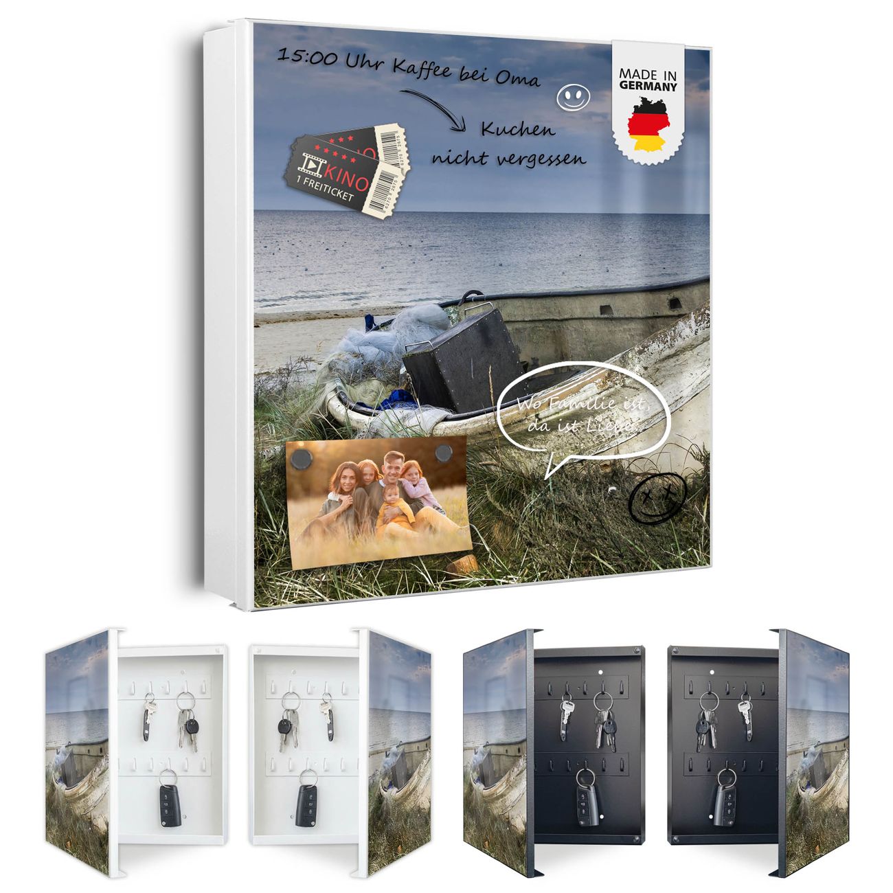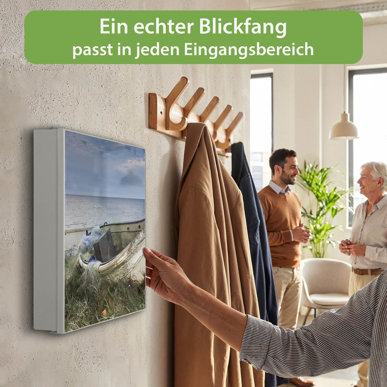 Bringe Ordnung und Eleganz in deinen Eingangsbereich mit dem banjado Schlüsselkasten Motiv Motiv Vergessenes Fischerboot. Die moderne Schlüsselbox kombiniert funktionales Design mit hochwertiger Verarbeitung und wird so zu einem echten Hingucker in Flur, Büro oder Ferienwohnung. ✅ Stilvolle Schlüsselaufbewahrung mit Motiv Motiv Vergessenes Fischerboot Der Design-Schlüsselkasten Motiv Motiv Vergessenes Fischerboot bietet Platz für bis zu 32 Schlüssel, die auf 4 stabilen Reihen mit je 8 Haken übersichtlich verstaut werden. Mit seinen kompakten Maßen von 30 x 30 x 5 cm passt die Schlüsselbox perfekt auch in kleinere Räume. Der weiß lackierte Stahlkorpus mit links angeschlagenem Türscharnier harmoniert mit gedruckten Folie auf der Front und fügt sich nahtlos in jedes Wohnambiente ein. Ob als Schlüsselorganizer für Zuhause oder als praktische Lösung für Büros, Praxen und Gewerbe, der banjado Schlüsselkasten sorgt für Ordnung und Übersicht. Dank der magnetischen, mit Kreidestiften beschreibbaren Folie auf der Front kannst du Notizen anheften oder Termine direkt auf der Oberfläche festhalten. Die Schlüsselbox Motiv Motiv Vergessenes Fischerboot zur Wandmontage wird inklusive Befestigungsmaterial geliefert und ist schnell angebracht. So hast du deine Schlüssel jederzeit griffbereit und zugleich stilvoll verstaut. Mit diesem banjado Schlüsselkasten Motiv Motiv Vergessenes Fischerboot kombinierst du praktische Aufbewahrung mit stilvollem Wohndesign. Ob privat oder geschäftlich, die Schlüsselbox sorgt für mehr Ordnung, Übersicht und ein wohnliches Ambiente.Vorteile im Überblick