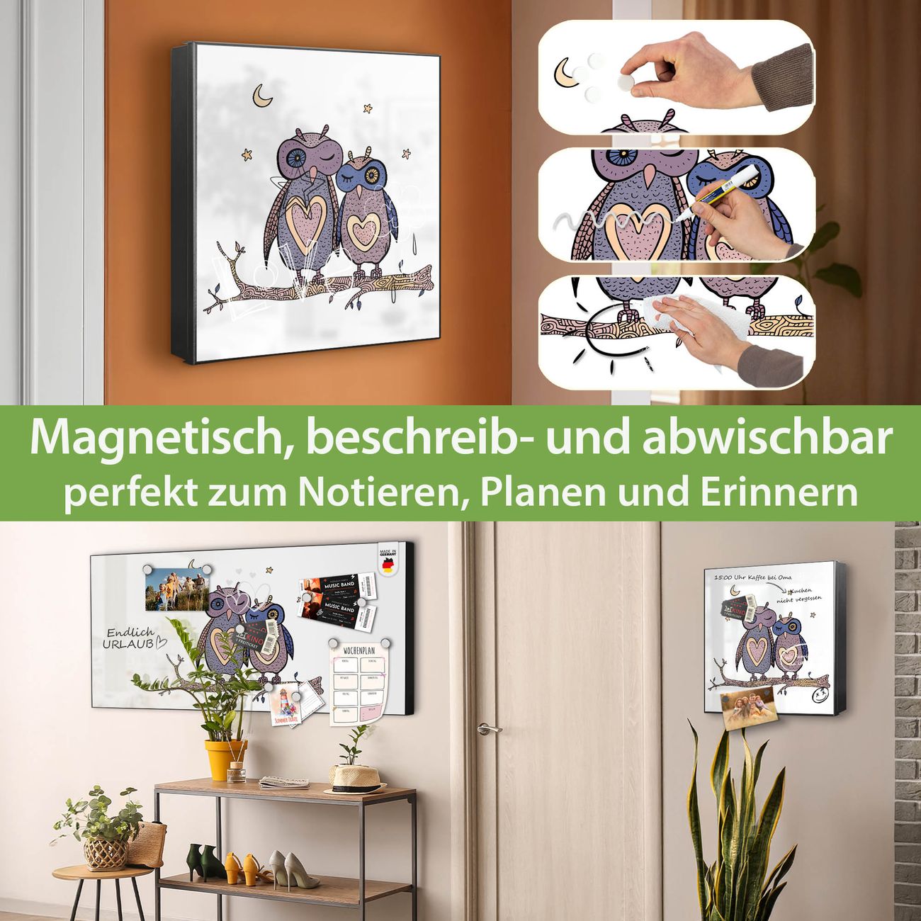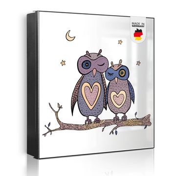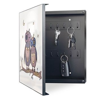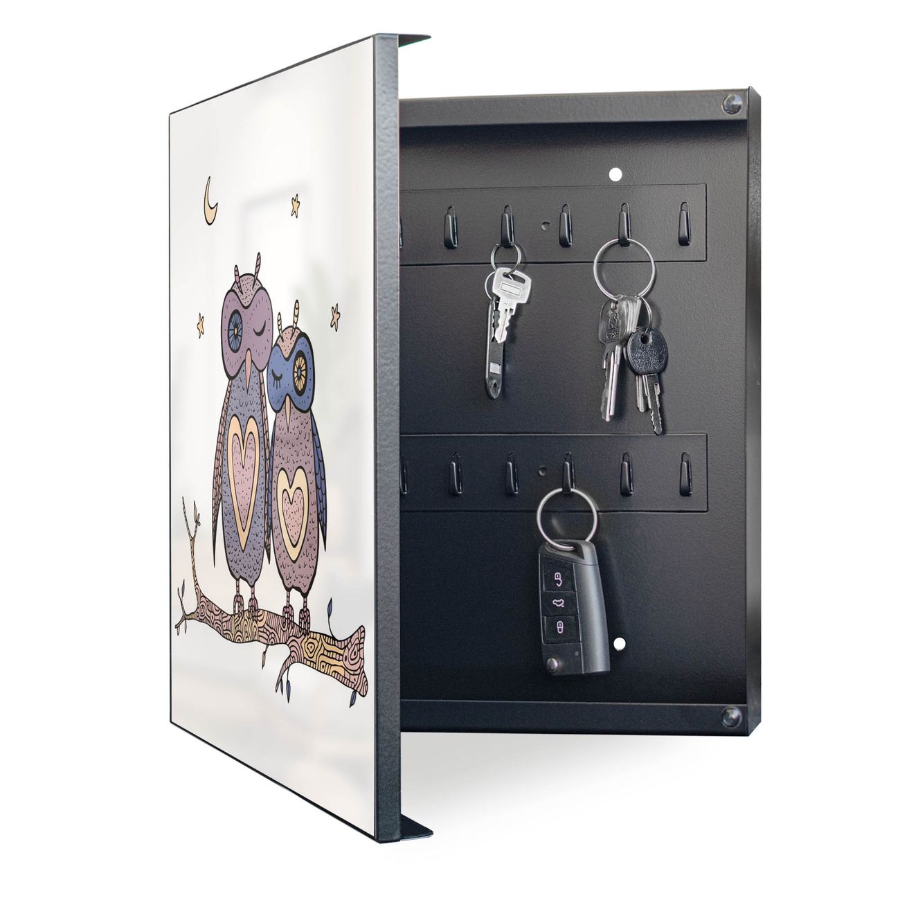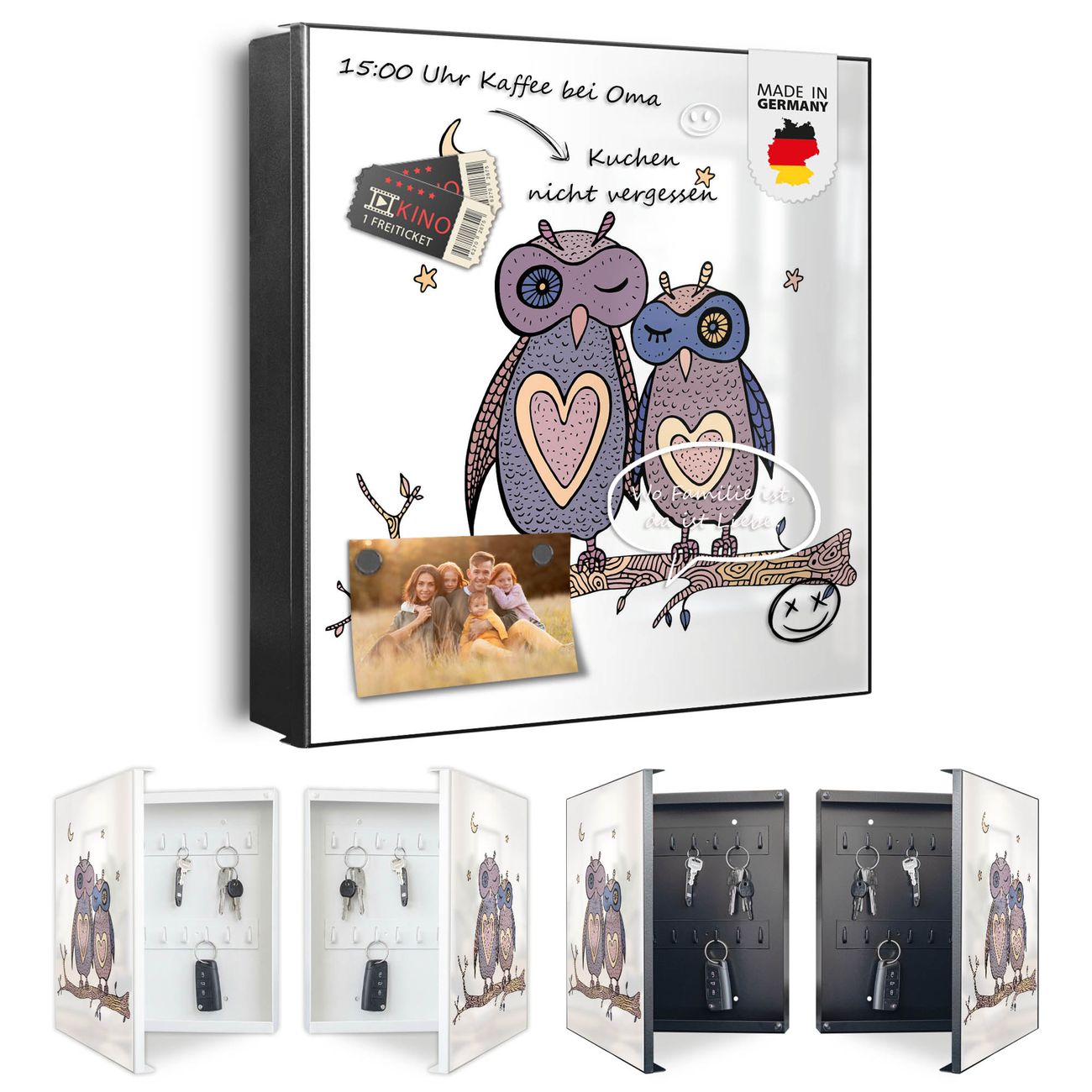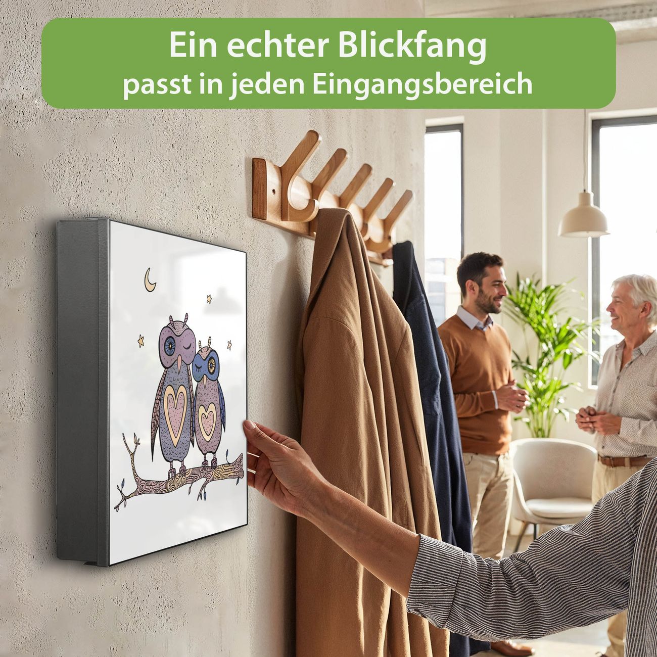 Bringe Ordnung und Eleganz in deinen Eingangsbereich mit dem banjado Schlüsselkasten Motiv Motiv Verliebte Eulen. Die moderne Schlüsselbox kombiniert funktionales Design mit hochwertiger Verarbeitung und wird so zu einem echten Hingucker in Flur, Büro oder Ferienwohnung. ✅ Stilvolle Schlüsselaufbewahrung mit Motiv Motiv Verliebte Eulen Der Design-Schlüsselkasten Motiv Motiv Verliebte Eulen bietet Platz für bis zu 32 Schlüssel, die auf 4 stabilen Reihen mit je 8 Haken übersichtlich verstaut werden. Mit seinen kompakten Maßen von 30 x 30 x 5 cm passt die Schlüsselbox perfekt auch in kleinere Räume. Der schwarz lackierte Stahlkorpus mit links angeschlagenem Türscharnier harmoniert mit gedruckten Folie auf der Front und fügt sich nahtlos in jedes Wohnambiente ein. Ob als Schlüsselorganizer für Zuhause oder als praktische Lösung für Büros, Praxen und Gewerbe, der banjado Schlüsselkasten sorgt für Ordnung und Übersicht. Dank der magnetischen, mit Kreidestiften beschreibbaren Folie auf der Front kannst du Notizen anheften oder Termine direkt auf der Oberfläche festhalten. Die Schlüsselbox Motiv Motiv Verliebte Eulen zur Wandmontage wird inklusive Befestigungsmaterial geliefert und ist schnell angebracht. So hast du deine Schlüssel jederzeit griffbereit und zugleich stilvoll verstaut. Mit diesem banjado Schlüsselkasten Motiv Motiv Verliebte Eulen kombinierst du praktische Aufbewahrung mit stilvollem Wohndesign. Ob privat oder geschäftlich, die Schlüsselbox sorgt für mehr Ordnung, Übersicht und ein wohnliches Ambiente.Vorteile im Überblick
