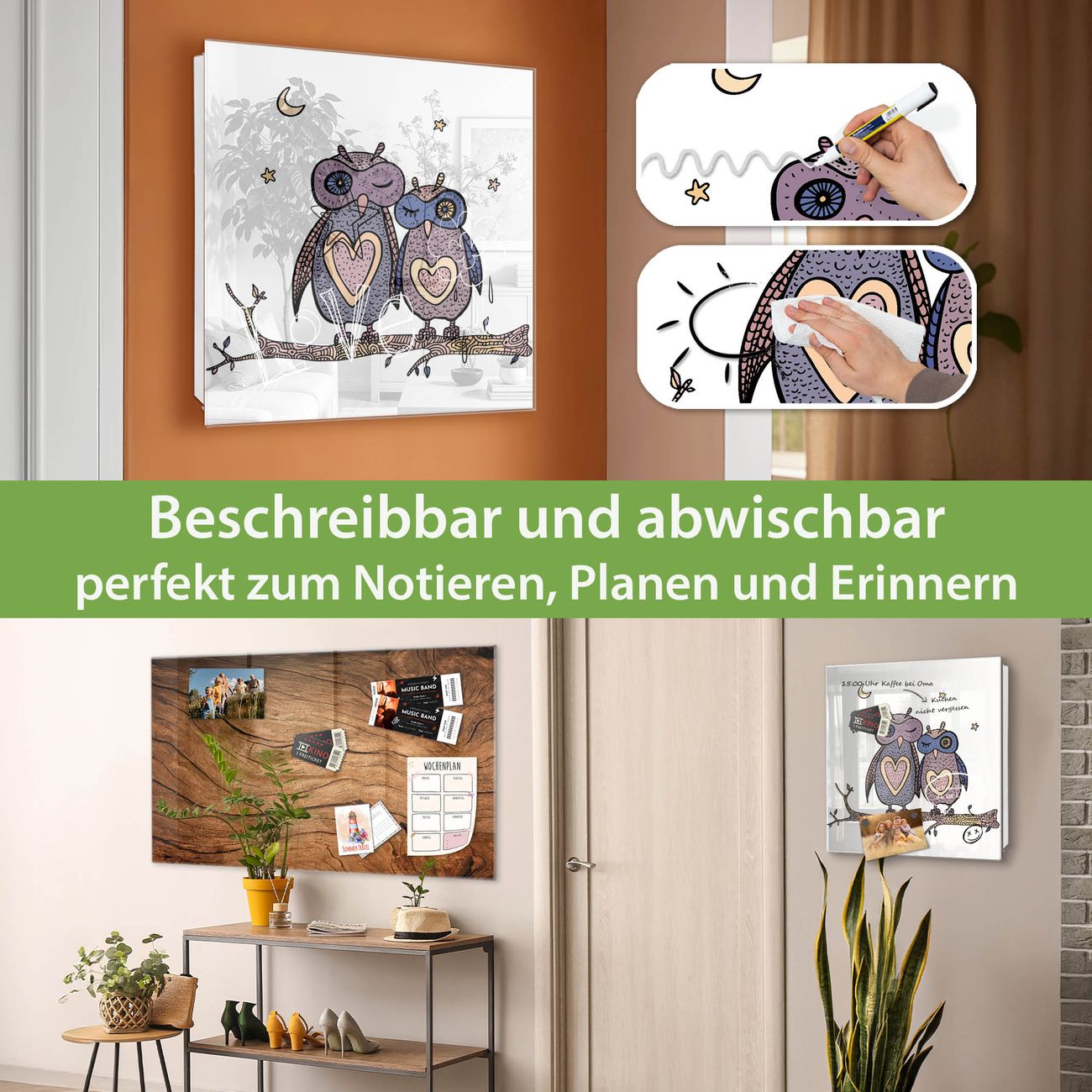 Bringe Ordnung und Eleganz in deinen Eingangsbereich mit dem banjado Schlüsselkasten Motiv Motiv Verliebte Eulen. Die moderne Schlüsselbox kombiniert funktionales Design mit hochwertiger Verarbeitung und wird so zu einem echten Hingucker in Flur, Büro oder Ferienwohnung. ✅ Stilvolle Schlüsselaufbewahrung mit Glasfront im Motiv Motiv Verliebte Eulen Der Design-Schlüsselkasten Motiv Motiv Verliebte Eulen bietet Platz für bis zu 50 Schlüssel, die auf 5 stabilen Reihen mit je 10 Haken übersichtlich verstaut werden. Mit seinen kompakten Maßen von 30 x 30 x 5 cm passt die Schlüsselbox perfekt auch in kleinere Räume. Der weiß lackierte Stahlkorpus mit rechts angeschlagenem Türscharnier harmoniert mit der Glasfront und fügt sich nahtlos in jedes Wohnambiente ein. Ob als Schlüsselorganizer für Zuhause oder als praktische Lösung für Büros, Praxen und Gewerbe, der banjado Schlüsselkasten sorgt für Ordnung und Übersicht. Dank der magnetischen, mit Kreidestiften beschreibbaren Glasfront kannst du Notizen anheften oder Termine direkt auf der Oberfläche festhalten. Die Schlüsselbox Motiv Motiv Verliebte Eulen zur Wandmontage wird inklusive Befestigungsmaterial geliefert und ist schnell angebracht. So hast du deine Schlüssel jederzeit griffbereit und zugleich stilvoll verstaut. Mit diesem banjado Schlüsselkasten Motiv Motiv Verliebte Eulen kombinierst du praktische Aufbewahrung mit stilvollem Wohndesign. Ob privat oder geschäftlich, die Schlüsselbox sorgt für mehr Ordnung, Übersicht und ein wohnliches Ambiente.Vorteile im Überblick