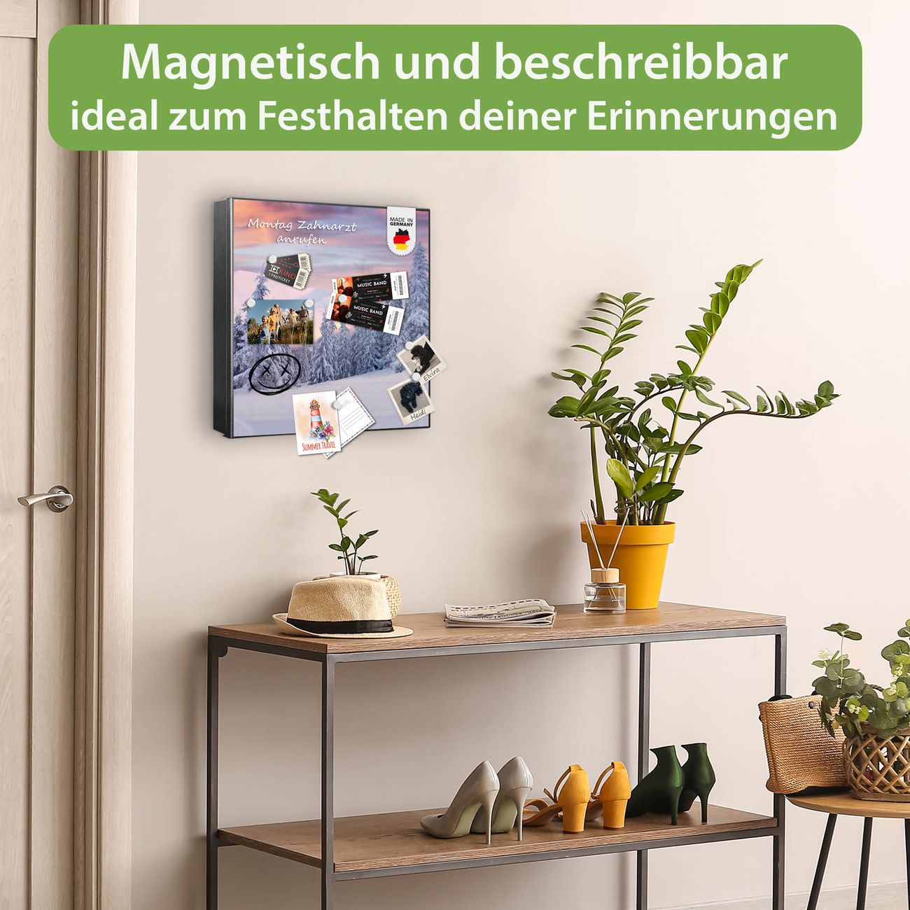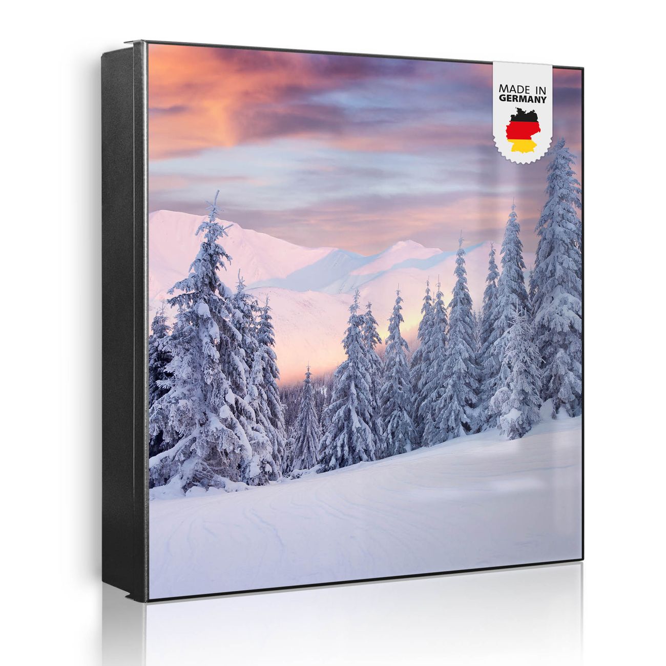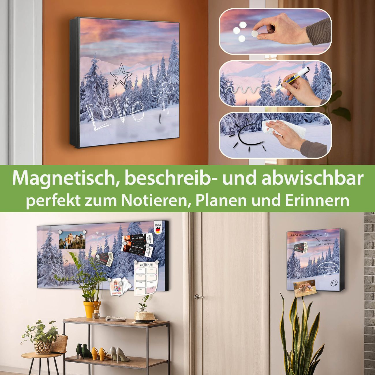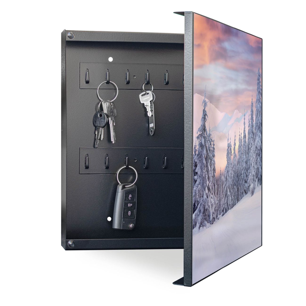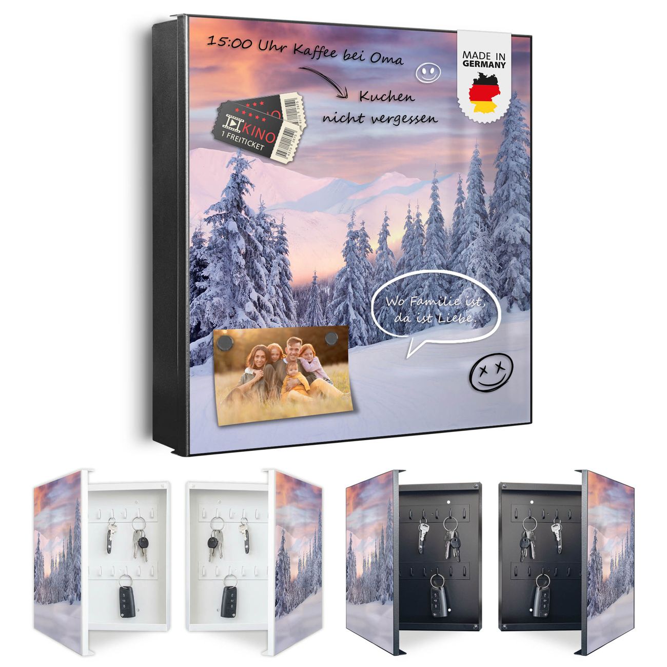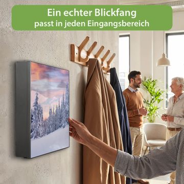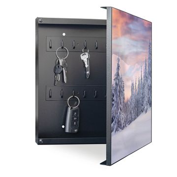 Bringe Ordnung und Eleganz in deinen Eingangsbereich mit dem banjado Schlüsselkasten Motiv Motiv Verschneite Berge. Die moderne Schlüsselbox kombiniert funktionales Design mit hochwertiger Verarbeitung und wird so zu einem echten Hingucker in Flur, Büro oder Ferienwohnung. ✅ Stilvolle Schlüsselaufbewahrung mit Motiv Motiv Verschneite Berge Der Design-Schlüsselkasten Motiv Motiv Verschneite Berge bietet Platz für bis zu 32 Schlüssel, die auf 4 stabilen Reihen mit je 8 Haken übersichtlich verstaut werden. Mit seinen kompakten Maßen von 30 x 30 x 5 cm passt die Schlüsselbox perfekt auch in kleinere Räume. Der schwarz lackierte Stahlkorpus mit rechts angeschlagenem Türscharnier harmoniert mit gedruckten Folie auf der Front und fügt sich nahtlos in jedes Wohnambiente ein. Ob als Schlüsselorganizer für Zuhause oder als praktische Lösung für Büros, Praxen und Gewerbe, der banjado Schlüsselkasten sorgt für Ordnung und Übersicht. Dank der magnetischen, mit Kreidestiften beschreibbaren Folie auf der Front kannst du Notizen anheften oder Termine direkt auf der Oberfläche festhalten. Die Schlüsselbox Motiv Motiv Verschneite Berge zur Wandmontage wird inklusive Befestigungsmaterial geliefert und ist schnell angebracht. So hast du deine Schlüssel jederzeit griffbereit und zugleich stilvoll verstaut. Mit diesem banjado Schlüsselkasten Motiv Motiv Verschneite Berge kombinierst du praktische Aufbewahrung mit stilvollem Wohndesign. Ob privat oder geschäftlich, die Schlüsselbox sorgt für mehr Ordnung, Übersicht und ein wohnliches Ambiente.Vorteile im Überblick
