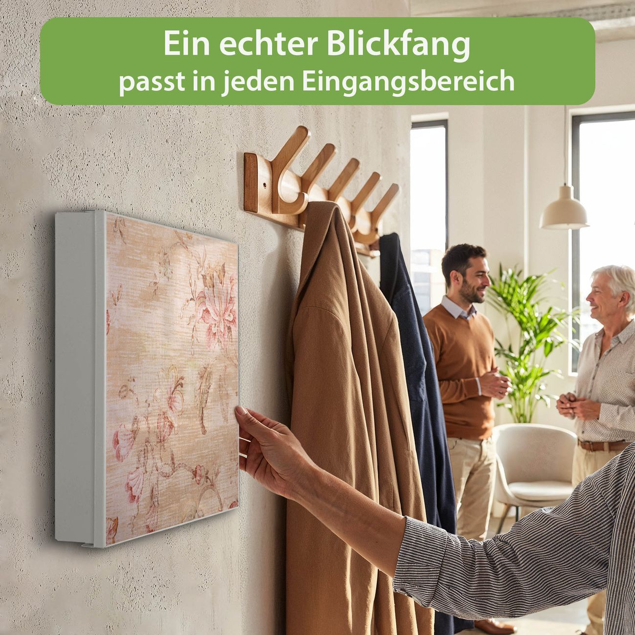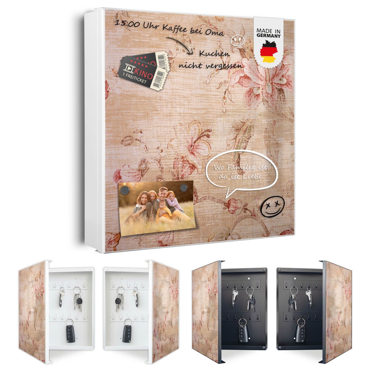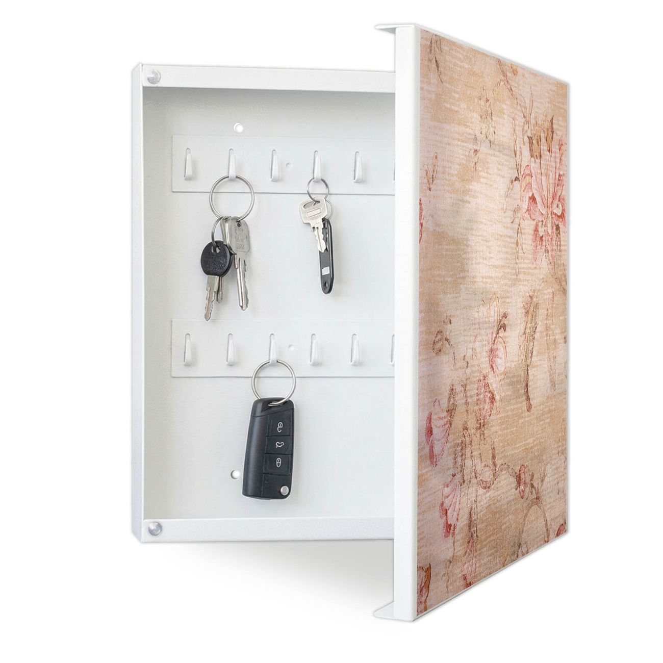 Bringe Ordnung und Eleganz in deinen Eingangsbereich mit dem banjado Schlüsselkasten Motiv Motiv Verschwindend. Die moderne Schlüsselbox kombiniert funktionales Design mit hochwertiger Verarbeitung und wird so zu einem echten Hingucker in Flur, Büro oder Ferienwohnung. ✅ Stilvolle Schlüsselaufbewahrung mit Motiv Motiv Verschwindend Der Design-Schlüsselkasten Motiv Motiv Verschwindend bietet Platz für bis zu 32 Schlüssel, die auf 4 stabilen Reihen mit je 8 Haken übersichtlich verstaut werden. Mit seinen kompakten Maßen von 30 x 30 x 5 cm passt die Schlüsselbox perfekt auch in kleinere Räume. Der weiß lackierte Stahlkorpus mit rechts angeschlagenem Türscharnier harmoniert mit gedruckten Folie auf der Front und fügt sich nahtlos in jedes Wohnambiente ein. Ob als Schlüsselorganizer für Zuhause oder als praktische Lösung für Büros, Praxen und Gewerbe, der banjado Schlüsselkasten sorgt für Ordnung und Übersicht. Dank der magnetischen, mit Kreidestiften beschreibbaren Folie auf der Front kannst du Notizen anheften oder Termine direkt auf der Oberfläche festhalten. Die Schlüsselbox Motiv Motiv Verschwindend zur Wandmontage wird inklusive Befestigungsmaterial geliefert und ist schnell angebracht. So hast du deine Schlüssel jederzeit griffbereit und zugleich stilvoll verstaut. Mit diesem banjado Schlüsselkasten Motiv Motiv Verschwindend kombinierst du praktische Aufbewahrung mit stilvollem Wohndesign. Ob privat oder geschäftlich, die Schlüsselbox sorgt für mehr Ordnung, Übersicht und ein wohnliches Ambiente.Vorteile im Überblick