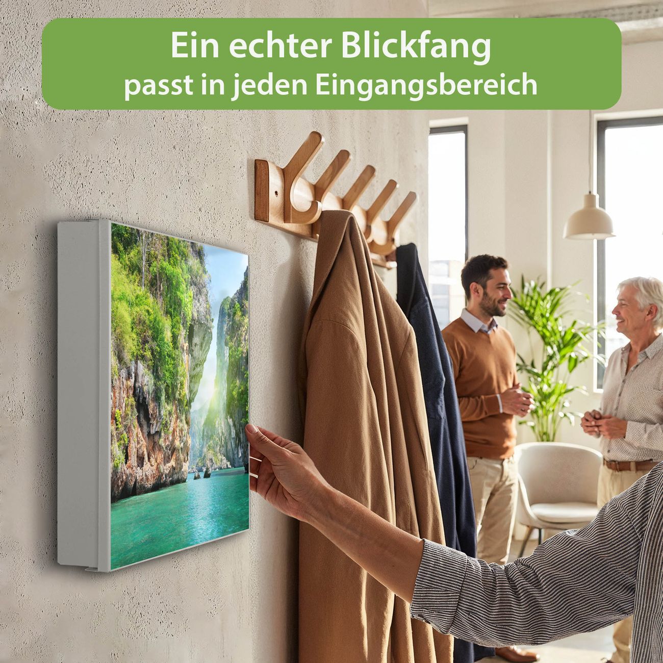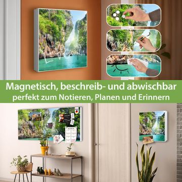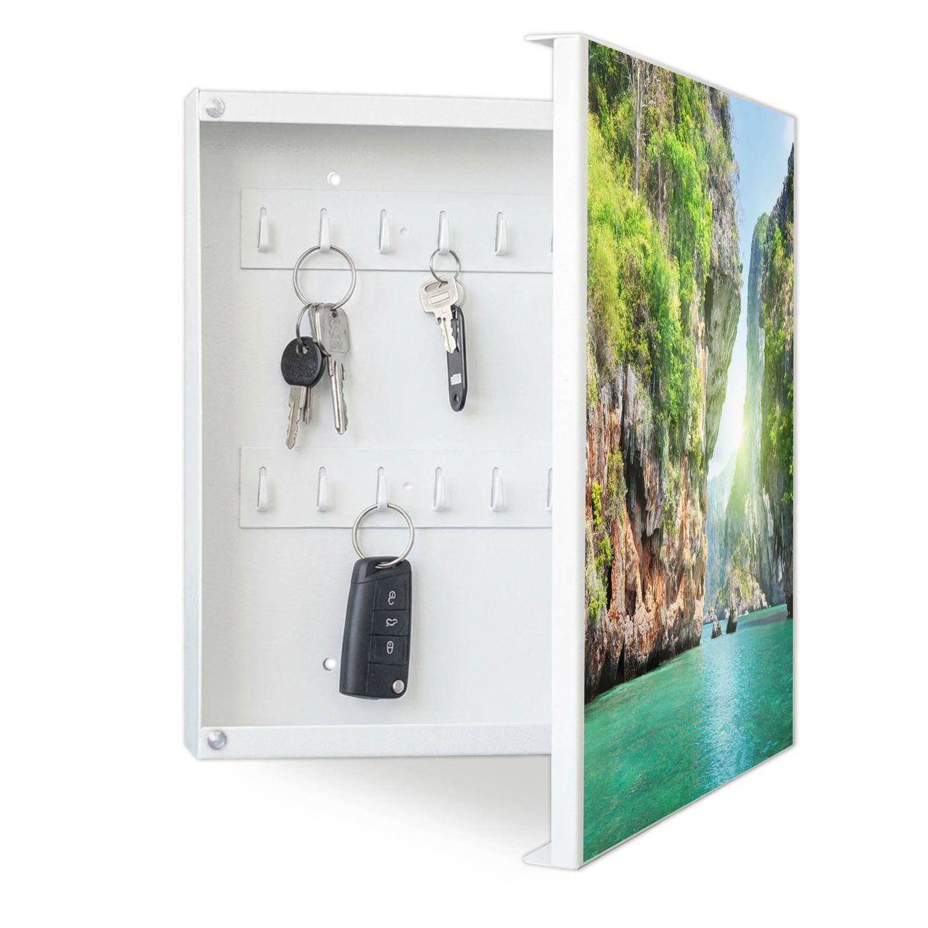 Bringe Ordnung und Eleganz in deinen Eingangsbereich mit dem banjado Schlüsselkasten Motiv Motiv Versteckte Bucht. Die moderne Schlüsselbox kombiniert funktionales Design mit hochwertiger Verarbeitung und wird so zu einem echten Hingucker in Flur, Büro oder Ferienwohnung. ✅ Stilvolle Schlüsselaufbewahrung mit Motiv Motiv Versteckte Bucht Der Design-Schlüsselkasten Motiv Motiv Versteckte Bucht bietet Platz für bis zu 32 Schlüssel, die auf 4 stabilen Reihen mit je 8 Haken übersichtlich verstaut werden. Mit seinen kompakten Maßen von 30 x 30 x 5 cm passt die Schlüsselbox perfekt auch in kleinere Räume. Der weiß lackierte Stahlkorpus mit rechts angeschlagenem Türscharnier harmoniert mit gedruckten Folie auf der Front und fügt sich nahtlos in jedes Wohnambiente ein. Ob als Schlüsselorganizer für Zuhause oder als praktische Lösung für Büros, Praxen und Gewerbe, der banjado Schlüsselkasten sorgt für Ordnung und Übersicht. Dank der magnetischen, mit Kreidestiften beschreibbaren Folie auf der Front kannst du Notizen anheften oder Termine direkt auf der Oberfläche festhalten. Die Schlüsselbox Motiv Motiv Versteckte Bucht zur Wandmontage wird inklusive Befestigungsmaterial geliefert und ist schnell angebracht. So hast du deine Schlüssel jederzeit griffbereit und zugleich stilvoll verstaut. Mit diesem banjado Schlüsselkasten Motiv Motiv Versteckte Bucht kombinierst du praktische Aufbewahrung mit stilvollem Wohndesign. Ob privat oder geschäftlich, die Schlüsselbox sorgt für mehr Ordnung, Übersicht und ein wohnliches Ambiente.Vorteile im Überblick