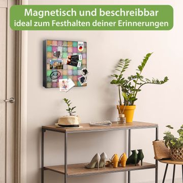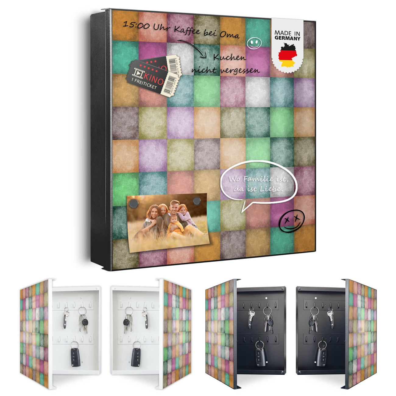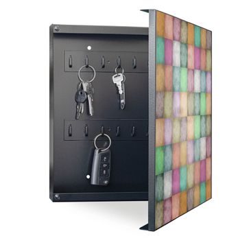 Bringe Ordnung und Eleganz in deinen Eingangsbereich mit dem banjado Schlüsselkasten Motiv Motiv Verwaschene Quadrate. Die moderne Schlüsselbox kombiniert funktionales Design mit hochwertiger Verarbeitung und wird so zu einem echten Hingucker in Flur, Büro oder Ferienwohnung. ✅ Stilvolle Schlüsselaufbewahrung mit Motiv Motiv Verwaschene Quadrate Der Design-Schlüsselkasten Motiv Motiv Verwaschene Quadrate bietet Platz für bis zu 32 Schlüssel, die auf 4 stabilen Reihen mit je 8 Haken übersichtlich verstaut werden. Mit seinen kompakten Maßen von 30 x 30 x 5 cm passt die Schlüsselbox perfekt auch in kleinere Räume. Der schwarz lackierte Stahlkorpus mit rechts angeschlagenem Türscharnier harmoniert mit gedruckten Folie auf der Front und fügt sich nahtlos in jedes Wohnambiente ein. Ob als Schlüsselorganizer für Zuhause oder als praktische Lösung für Büros, Praxen und Gewerbe, der banjado Schlüsselkasten sorgt für Ordnung und Übersicht. Dank der magnetischen, mit Kreidestiften beschreibbaren Folie auf der Front kannst du Notizen anheften oder Termine direkt auf der Oberfläche festhalten. Die Schlüsselbox Motiv Motiv Verwaschene Quadrate zur Wandmontage wird inklusive Befestigungsmaterial geliefert und ist schnell angebracht. So hast du deine Schlüssel jederzeit griffbereit und zugleich stilvoll verstaut. Mit diesem banjado Schlüsselkasten Motiv Motiv Verwaschene Quadrate kombinierst du praktische Aufbewahrung mit stilvollem Wohndesign. Ob privat oder geschäftlich, die Schlüsselbox sorgt für mehr Ordnung, Übersicht und ein wohnliches Ambiente.Vorteile im Überblick