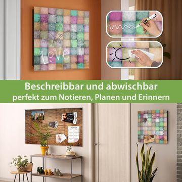 Bringe Ordnung und Eleganz in deinen Eingangsbereich mit dem banjado Schlüsselkasten Motiv Motiv Verwaschene Quadrate. Die moderne Schlüsselbox kombiniert funktionales Design mit hochwertiger Verarbeitung und wird so zu einem echten Hingucker in Flur, Büro oder Ferienwohnung. ✅ Stilvolle Schlüsselaufbewahrung mit Glasfront im Motiv Motiv Verwaschene Quadrate Der Design-Schlüsselkasten Motiv Motiv Verwaschene Quadrate bietet Platz für bis zu 50 Schlüssel, die auf 5 stabilen Reihen mit je 10 Haken übersichtlich verstaut werden. Mit seinen kompakten Maßen von 30 x 30 x 5 cm passt die Schlüsselbox perfekt auch in kleinere Räume. Der schwarz lackierte Stahlkorpus mit rechts angeschlagenem Türscharnier harmoniert mit der Glasfront und fügt sich nahtlos in jedes Wohnambiente ein. Ob als Schlüsselorganizer für Zuhause oder als praktische Lösung für Büros, Praxen und Gewerbe, der banjado Schlüsselkasten sorgt für Ordnung und Übersicht. Dank der magnetischen, mit Kreidestiften beschreibbaren Glasfront kannst du Notizen anheften oder Termine direkt auf der Oberfläche festhalten. Die Schlüsselbox Motiv Motiv Verwaschene Quadrate zur Wandmontage wird inklusive Befestigungsmaterial geliefert und ist schnell angebracht. So hast du deine Schlüssel jederzeit griffbereit und zugleich stilvoll verstaut. Mit diesem banjado Schlüsselkasten Motiv Motiv Verwaschene Quadrate kombinierst du praktische Aufbewahrung mit stilvollem Wohndesign. Ob privat oder geschäftlich, die Schlüsselbox sorgt für mehr Ordnung, Übersicht und ein wohnliches Ambiente.Vorteile im Überblick