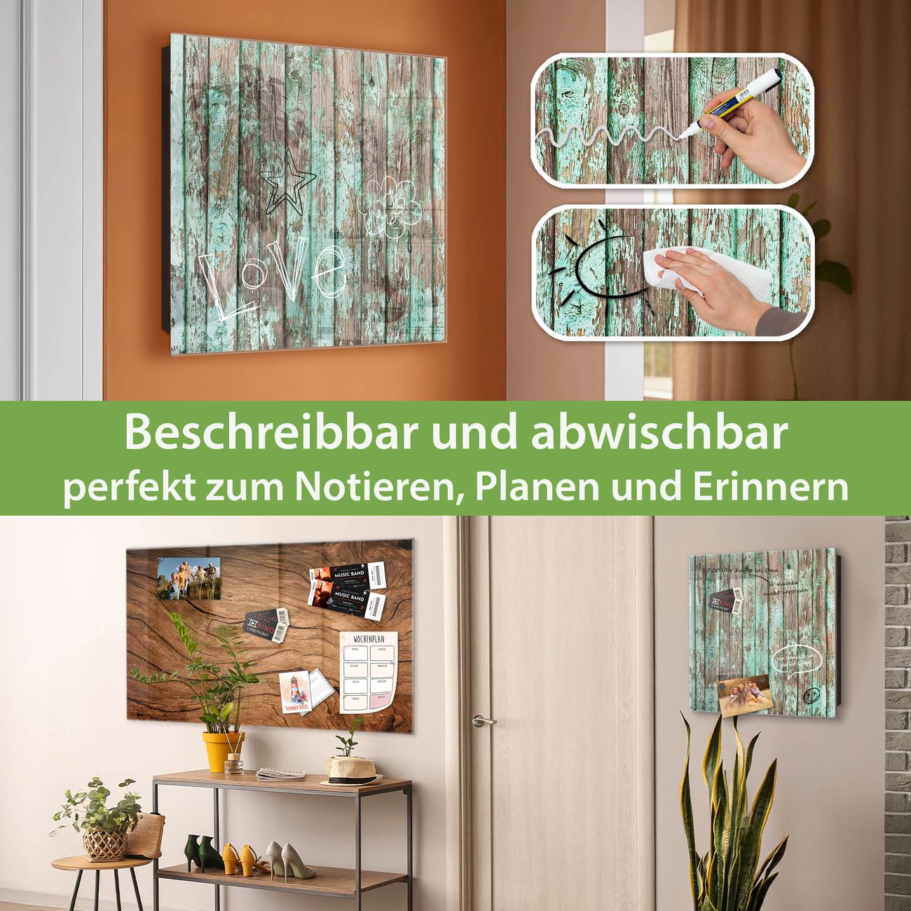 Bringe Ordnung und Eleganz in deinen Eingangsbereich mit dem banjado Schlüsselkasten Motiv Motiv Verwittertes Holz. Die moderne Schlüsselbox kombiniert funktionales Design mit hochwertiger Verarbeitung und wird so zu einem echten Hingucker in Flur, Büro oder Ferienwohnung. ✅ Stilvolle Schlüsselaufbewahrung mit Glasfront im Motiv Motiv Verwittertes Holz Der Design-Schlüsselkasten Motiv Motiv Verwittertes Holz bietet Platz für bis zu 50 Schlüssel, die auf 5 stabilen Reihen mit je 10 Haken übersichtlich verstaut werden. Mit seinen kompakten Maßen von 30 x 30 x 5 cm passt die Schlüsselbox perfekt auch in kleinere Räume. Der schwarz lackierte Stahlkorpus mit rechts angeschlagenem Türscharnier harmoniert mit der Glasfront und fügt sich nahtlos in jedes Wohnambiente ein. Ob als Schlüsselorganizer für Zuhause oder als praktische Lösung für Büros, Praxen und Gewerbe, der banjado Schlüsselkasten sorgt für Ordnung und Übersicht. Dank der magnetischen, mit Kreidestiften beschreibbaren Glasfront kannst du Notizen anheften oder Termine direkt auf der Oberfläche festhalten. Die Schlüsselbox Motiv Motiv Verwittertes Holz zur Wandmontage wird inklusive Befestigungsmaterial geliefert und ist schnell angebracht. So hast du deine Schlüssel jederzeit griffbereit und zugleich stilvoll verstaut. Mit diesem banjado Schlüsselkasten Motiv Motiv Verwittertes Holz kombinierst du praktische Aufbewahrung mit stilvollem Wohndesign. Ob privat oder geschäftlich, die Schlüsselbox sorgt für mehr Ordnung, Übersicht und ein wohnliches Ambiente.Vorteile im Überblick