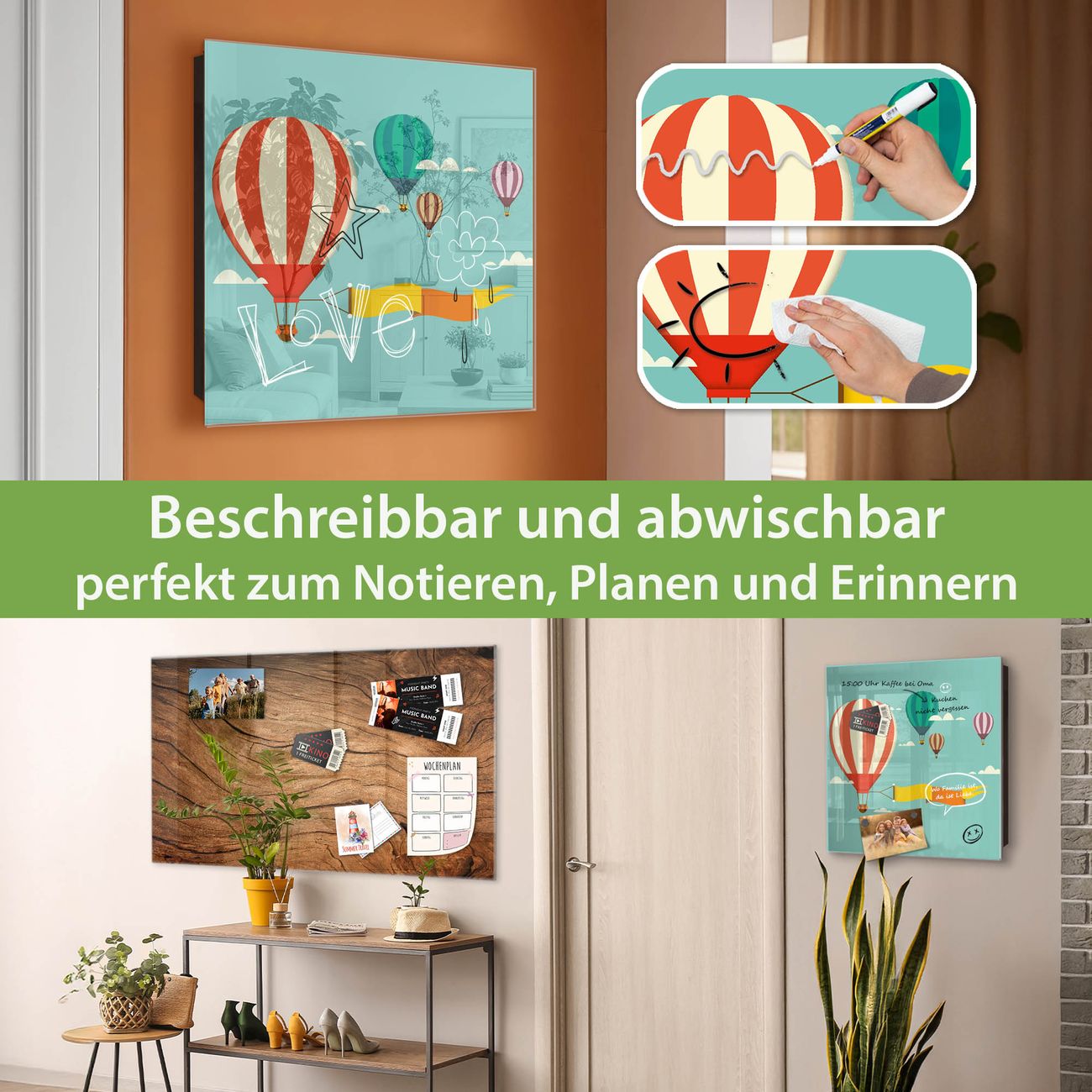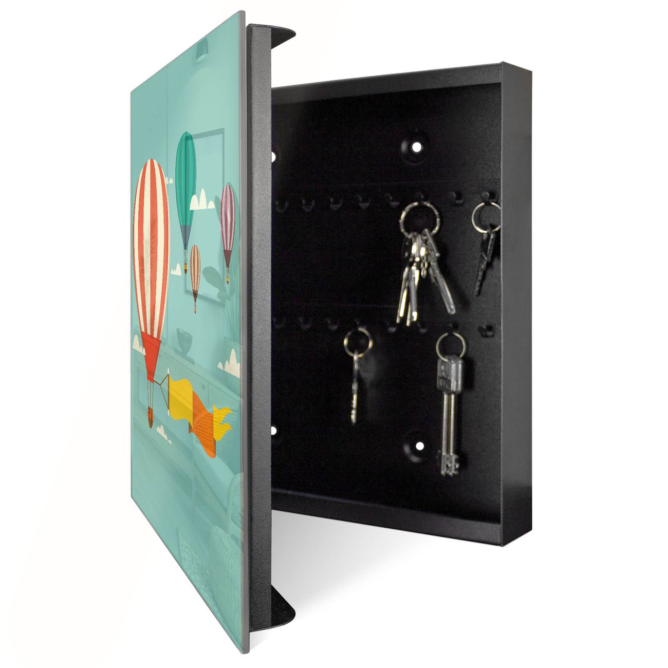 Bringe Ordnung und Eleganz in deinen Eingangsbereich mit dem banjado Schlüsselkasten Motiv Motiv Vier Ballons. Die moderne Schlüsselbox kombiniert funktionales Design mit hochwertiger Verarbeitung und wird so zu einem echten Hingucker in Flur, Büro oder Ferienwohnung. ✅ Stilvolle Schlüsselaufbewahrung mit Glasfront im Motiv Motiv Vier Ballons Der Design-Schlüsselkasten Motiv Motiv Vier Ballons bietet Platz für bis zu 50 Schlüssel, die auf 5 stabilen Reihen mit je 10 Haken übersichtlich verstaut werden. Mit seinen kompakten Maßen von 30 x 30 x 5 cm passt die Schlüsselbox perfekt auch in kleinere Räume. Der schwarz lackierte Stahlkorpus mit rechts angeschlagenem Türscharnier harmoniert mit der Glasfront und fügt sich nahtlos in jedes Wohnambiente ein. Ob als Schlüsselorganizer für Zuhause oder als praktische Lösung für Büros, Praxen und Gewerbe, der banjado Schlüsselkasten sorgt für Ordnung und Übersicht. Dank der magnetischen, mit Kreidestiften beschreibbaren Glasfront kannst du Notizen anheften oder Termine direkt auf der Oberfläche festhalten. Die Schlüsselbox Motiv Motiv Vier Ballons zur Wandmontage wird inklusive Befestigungsmaterial geliefert und ist schnell angebracht. So hast du deine Schlüssel jederzeit griffbereit und zugleich stilvoll verstaut. Mit diesem banjado Schlüsselkasten Motiv Motiv Vier Ballons kombinierst du praktische Aufbewahrung mit stilvollem Wohndesign. Ob privat oder geschäftlich, die Schlüsselbox sorgt für mehr Ordnung, Übersicht und ein wohnliches Ambiente.Vorteile im Überblick