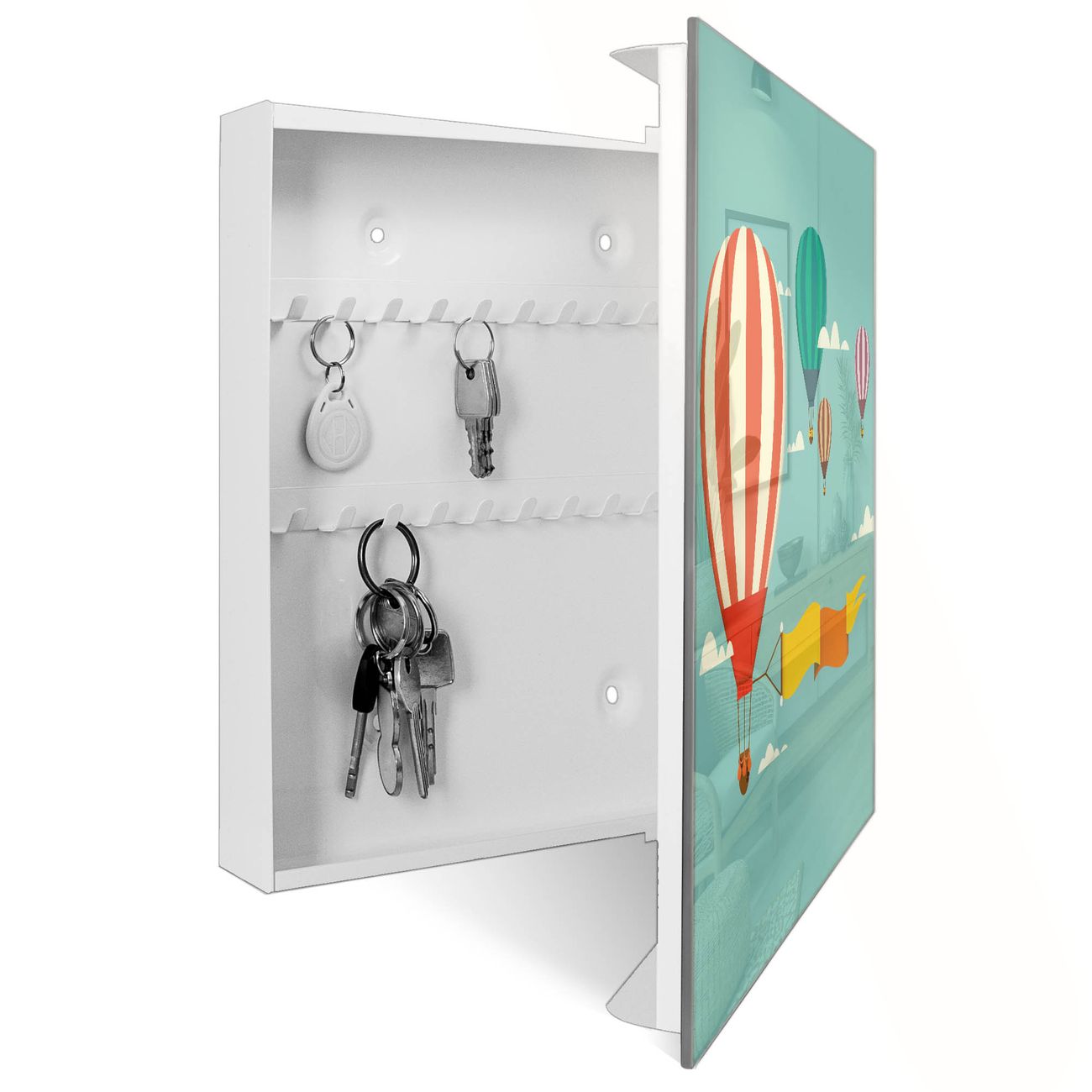 Bringe Ordnung und Eleganz in deinen Eingangsbereich mit dem banjado Schlüsselkasten Motiv Motiv Vier Ballons. Die moderne Schlüsselbox kombiniert funktionales Design mit hochwertiger Verarbeitung und wird so zu einem echten Hingucker in Flur, Büro oder Ferienwohnung. ✅ Stilvolle Schlüsselaufbewahrung mit Glasfront im Motiv Motiv Vier Ballons Der Design-Schlüsselkasten Motiv Motiv Vier Ballons bietet Platz für bis zu 50 Schlüssel, die auf 5 stabilen Reihen mit je 10 Haken übersichtlich verstaut werden. Mit seinen kompakten Maßen von 30 x 30 x 5 cm passt die Schlüsselbox perfekt auch in kleinere Räume. Der weiß lackierte Stahlkorpus mit rechts angeschlagenem Türscharnier harmoniert mit der Glasfront und fügt sich nahtlos in jedes Wohnambiente ein. Ob als Schlüsselorganizer für Zuhause oder als praktische Lösung für Büros, Praxen und Gewerbe, der banjado Schlüsselkasten sorgt für Ordnung und Übersicht. Dank der magnetischen, mit Kreidestiften beschreibbaren Glasfront kannst du Notizen anheften oder Termine direkt auf der Oberfläche festhalten. Die Schlüsselbox Motiv Motiv Vier Ballons zur Wandmontage wird inklusive Befestigungsmaterial geliefert und ist schnell angebracht. So hast du deine Schlüssel jederzeit griffbereit und zugleich stilvoll verstaut. Mit diesem banjado Schlüsselkasten Motiv Motiv Vier Ballons kombinierst du praktische Aufbewahrung mit stilvollem Wohndesign. Ob privat oder geschäftlich, die Schlüsselbox sorgt für mehr Ordnung, Übersicht und ein wohnliches Ambiente.Vorteile im Überblick