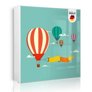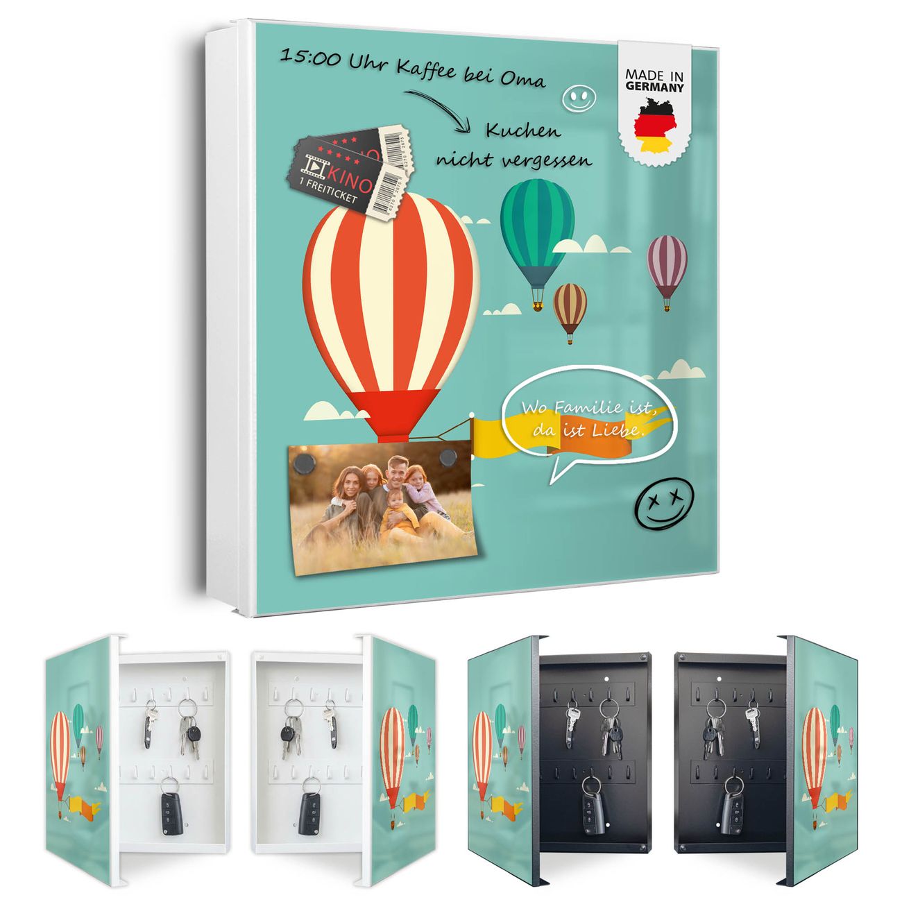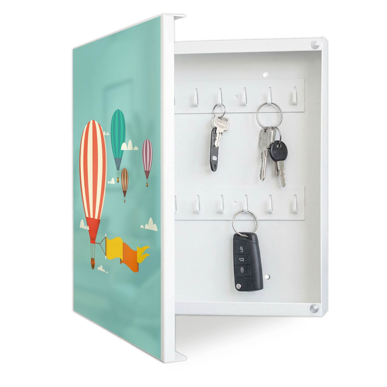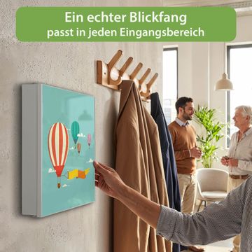 Bringe Ordnung und Eleganz in deinen Eingangsbereich mit dem banjado Schlüsselkasten Motiv Motiv Vier Ballons. Die moderne Schlüsselbox kombiniert funktionales Design mit hochwertiger Verarbeitung und wird so zu einem echten Hingucker in Flur, Büro oder Ferienwohnung. ✅ Stilvolle Schlüsselaufbewahrung mit Motiv Motiv Vier Ballons Der Design-Schlüsselkasten Motiv Motiv Vier Ballons bietet Platz für bis zu 32 Schlüssel, die auf 4 stabilen Reihen mit je 8 Haken übersichtlich verstaut werden. Mit seinen kompakten Maßen von 30 x 30 x 5 cm passt die Schlüsselbox perfekt auch in kleinere Räume. Der weiß lackierte Stahlkorpus mit links angeschlagenem Türscharnier harmoniert mit gedruckten Folie auf der Front und fügt sich nahtlos in jedes Wohnambiente ein. Ob als Schlüsselorganizer für Zuhause oder als praktische Lösung für Büros, Praxen und Gewerbe, der banjado Schlüsselkasten sorgt für Ordnung und Übersicht. Dank der magnetischen, mit Kreidestiften beschreibbaren Folie auf der Front kannst du Notizen anheften oder Termine direkt auf der Oberfläche festhalten. Die Schlüsselbox Motiv Motiv Vier Ballons zur Wandmontage wird inklusive Befestigungsmaterial geliefert und ist schnell angebracht. So hast du deine Schlüssel jederzeit griffbereit und zugleich stilvoll verstaut. Mit diesem banjado Schlüsselkasten Motiv Motiv Vier Ballons kombinierst du praktische Aufbewahrung mit stilvollem Wohndesign. Ob privat oder geschäftlich, die Schlüsselbox sorgt für mehr Ordnung, Übersicht und ein wohnliches Ambiente.Vorteile im Überblick