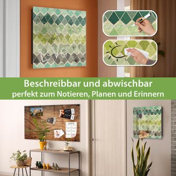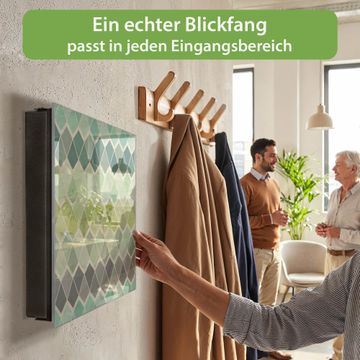 Bringe Ordnung und Eleganz in deinen Eingangsbereich mit dem banjado Schlüsselkasten Motiv Motiv Vier Farben Grün. Die moderne Schlüsselbox kombiniert funktionales Design mit hochwertiger Verarbeitung und wird so zu einem echten Hingucker in Flur, Büro oder Ferienwohnung. ✅ Stilvolle Schlüsselaufbewahrung mit Glasfront im Motiv Motiv Vier Farben Grün Der Design-Schlüsselkasten Motiv Motiv Vier Farben Grün bietet Platz für bis zu 50 Schlüssel, die auf 5 stabilen Reihen mit je 10 Haken übersichtlich verstaut werden. Mit seinen kompakten Maßen von 30 x 30 x 5 cm passt die Schlüsselbox perfekt auch in kleinere Räume. Der schwarz lackierte Stahlkorpus mit rechts angeschlagenem Türscharnier harmoniert mit der Glasfront und fügt sich nahtlos in jedes Wohnambiente ein. Ob als Schlüsselorganizer für Zuhause oder als praktische Lösung für Büros, Praxen und Gewerbe, der banjado Schlüsselkasten sorgt für Ordnung und Übersicht. Dank der magnetischen, mit Kreidestiften beschreibbaren Glasfront kannst du Notizen anheften oder Termine direkt auf der Oberfläche festhalten. Die Schlüsselbox Motiv Motiv Vier Farben Grün zur Wandmontage wird inklusive Befestigungsmaterial geliefert und ist schnell angebracht. So hast du deine Schlüssel jederzeit griffbereit und zugleich stilvoll verstaut. Mit diesem banjado Schlüsselkasten Motiv Motiv Vier Farben Grün kombinierst du praktische Aufbewahrung mit stilvollem Wohndesign. Ob privat oder geschäftlich, die Schlüsselbox sorgt für mehr Ordnung, Übersicht und ein wohnliches Ambiente.Vorteile im Überblick