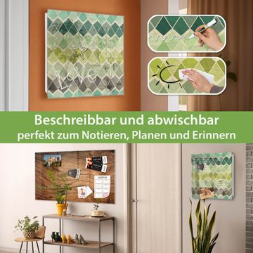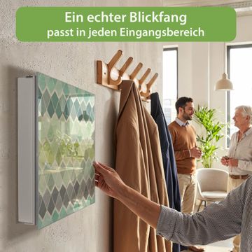 Bringe Ordnung und Eleganz in deinen Eingangsbereich mit dem banjado Schlüsselkasten Motiv Motiv Vier Farben Grün. Die moderne Schlüsselbox kombiniert funktionales Design mit hochwertiger Verarbeitung und wird so zu einem echten Hingucker in Flur, Büro oder Ferienwohnung. ✅ Stilvolle Schlüsselaufbewahrung mit Glasfront im Motiv Motiv Vier Farben Grün Der Design-Schlüsselkasten Motiv Motiv Vier Farben Grün bietet Platz für bis zu 50 Schlüssel, die auf 5 stabilen Reihen mit je 10 Haken übersichtlich verstaut werden. Mit seinen kompakten Maßen von 30 x 30 x 5 cm passt die Schlüsselbox perfekt auch in kleinere Räume. Der weiß lackierte Stahlkorpus mit rechts angeschlagenem Türscharnier harmoniert mit der Glasfront und fügt sich nahtlos in jedes Wohnambiente ein. Ob als Schlüsselorganizer für Zuhause oder als praktische Lösung für Büros, Praxen und Gewerbe, der banjado Schlüsselkasten sorgt für Ordnung und Übersicht. Dank der magnetischen, mit Kreidestiften beschreibbaren Glasfront kannst du Notizen anheften oder Termine direkt auf der Oberfläche festhalten. Die Schlüsselbox Motiv Motiv Vier Farben Grün zur Wandmontage wird inklusive Befestigungsmaterial geliefert und ist schnell angebracht. So hast du deine Schlüssel jederzeit griffbereit und zugleich stilvoll verstaut. Mit diesem banjado Schlüsselkasten Motiv Motiv Vier Farben Grün kombinierst du praktische Aufbewahrung mit stilvollem Wohndesign. Ob privat oder geschäftlich, die Schlüsselbox sorgt für mehr Ordnung, Übersicht und ein wohnliches Ambiente.Vorteile im Überblick