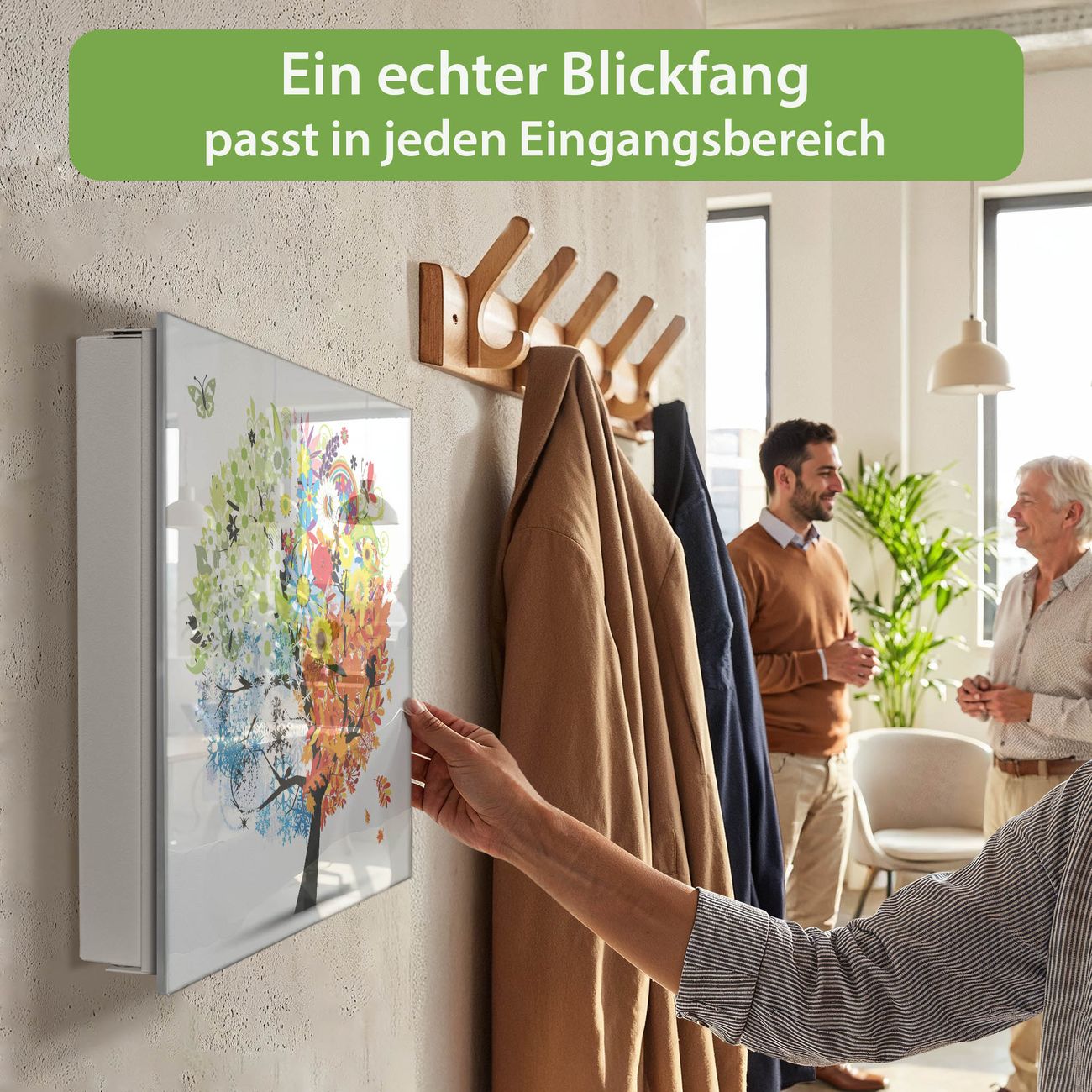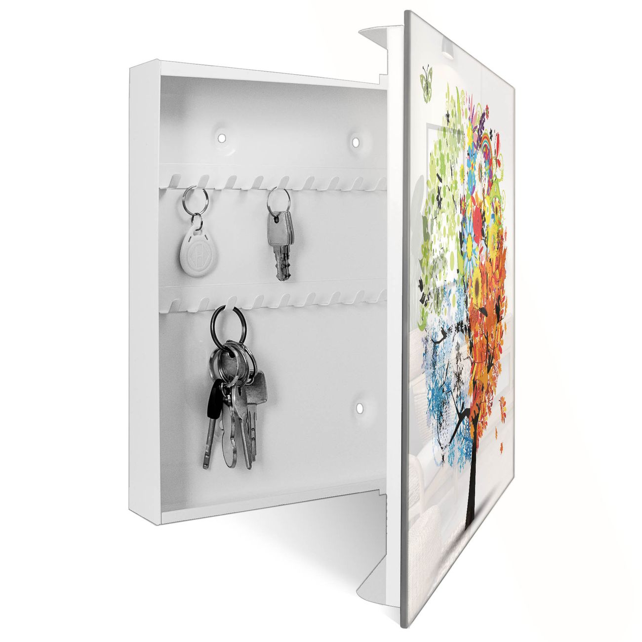 Bringe Ordnung und Eleganz in deinen Eingangsbereich mit dem banjado Schlüsselkasten Motiv Motiv Vier Jahreszeiten. Die moderne Schlüsselbox kombiniert funktionales Design mit hochwertiger Verarbeitung und wird so zu einem echten Hingucker in Flur, Büro oder Ferienwohnung. ✅ Stilvolle Schlüsselaufbewahrung mit Glasfront im Motiv Motiv Vier Jahreszeiten Der Design-Schlüsselkasten Motiv Motiv Vier Jahreszeiten bietet Platz für bis zu 50 Schlüssel, die auf 5 stabilen Reihen mit je 10 Haken übersichtlich verstaut werden. Mit seinen kompakten Maßen von 30 x 30 x 5 cm passt die Schlüsselbox perfekt auch in kleinere Räume. Der weiß lackierte Stahlkorpus mit rechts angeschlagenem Türscharnier harmoniert mit der Glasfront und fügt sich nahtlos in jedes Wohnambiente ein. Ob als Schlüsselorganizer für Zuhause oder als praktische Lösung für Büros, Praxen und Gewerbe, der banjado Schlüsselkasten sorgt für Ordnung und Übersicht. Dank der magnetischen, mit Kreidestiften beschreibbaren Glasfront kannst du Notizen anheften oder Termine direkt auf der Oberfläche festhalten. Die Schlüsselbox Motiv Motiv Vier Jahreszeiten zur Wandmontage wird inklusive Befestigungsmaterial geliefert und ist schnell angebracht. So hast du deine Schlüssel jederzeit griffbereit und zugleich stilvoll verstaut. Mit diesem banjado Schlüsselkasten Motiv Motiv Vier Jahreszeiten kombinierst du praktische Aufbewahrung mit stilvollem Wohndesign. Ob privat oder geschäftlich, die Schlüsselbox sorgt für mehr Ordnung, Übersicht und ein wohnliches Ambiente.Vorteile im Überblick