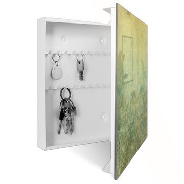 Bringe Ordnung und Eleganz in deinen Eingangsbereich mit dem banjado Schlüsselkasten Motiv Motiv Vintage Messing. Die moderne Schlüsselbox kombiniert funktionales Design mit hochwertiger Verarbeitung und wird so zu einem echten Hingucker in Flur, Büro oder Ferienwohnung. ✅ Stilvolle Schlüsselaufbewahrung mit Glasfront im Motiv Motiv Vintage Messing Der Design-Schlüsselkasten Motiv Motiv Vintage Messing bietet Platz für bis zu 50 Schlüssel, die auf 5 stabilen Reihen mit je 10 Haken übersichtlich verstaut werden. Mit seinen kompakten Maßen von 30 x 30 x 5 cm passt die Schlüsselbox perfekt auch in kleinere Räume. Der weiß lackierte Stahlkorpus mit rechts angeschlagenem Türscharnier harmoniert mit der Glasfront und fügt sich nahtlos in jedes Wohnambiente ein. Ob als Schlüsselorganizer für Zuhause oder als praktische Lösung für Büros, Praxen und Gewerbe, der banjado Schlüsselkasten sorgt für Ordnung und Übersicht. Dank der magnetischen, mit Kreidestiften beschreibbaren Glasfront kannst du Notizen anheften oder Termine direkt auf der Oberfläche festhalten. Die Schlüsselbox Motiv Motiv Vintage Messing zur Wandmontage wird inklusive Befestigungsmaterial geliefert und ist schnell angebracht. So hast du deine Schlüssel jederzeit griffbereit und zugleich stilvoll verstaut. Mit diesem banjado Schlüsselkasten Motiv Motiv Vintage Messing kombinierst du praktische Aufbewahrung mit stilvollem Wohndesign. Ob privat oder geschäftlich, die Schlüsselbox sorgt für mehr Ordnung, Übersicht und ein wohnliches Ambiente.Vorteile im Überblick