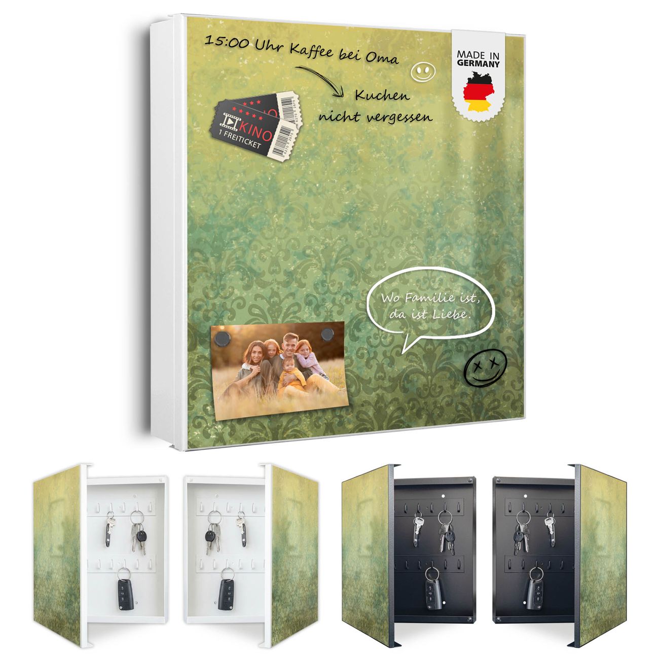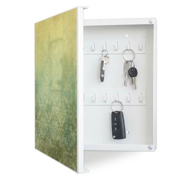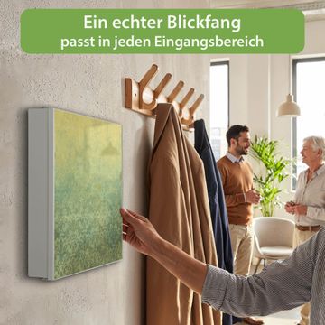 Bringe Ordnung und Eleganz in deinen Eingangsbereich mit dem banjado Schlüsselkasten Motiv Motiv Vintage Messing. Die moderne Schlüsselbox kombiniert funktionales Design mit hochwertiger Verarbeitung und wird so zu einem echten Hingucker in Flur, Büro oder Ferienwohnung. ✅ Stilvolle Schlüsselaufbewahrung mit Motiv Motiv Vintage Messing Der Design-Schlüsselkasten Motiv Motiv Vintage Messing bietet Platz für bis zu 32 Schlüssel, die auf 4 stabilen Reihen mit je 8 Haken übersichtlich verstaut werden. Mit seinen kompakten Maßen von 30 x 30 x 5 cm passt die Schlüsselbox perfekt auch in kleinere Räume. Der weiß lackierte Stahlkorpus mit links angeschlagenem Türscharnier harmoniert mit gedruckten Folie auf der Front und fügt sich nahtlos in jedes Wohnambiente ein. Ob als Schlüsselorganizer für Zuhause oder als praktische Lösung für Büros, Praxen und Gewerbe, der banjado Schlüsselkasten sorgt für Ordnung und Übersicht. Dank der magnetischen, mit Kreidestiften beschreibbaren Folie auf der Front kannst du Notizen anheften oder Termine direkt auf der Oberfläche festhalten. Die Schlüsselbox Motiv Motiv Vintage Messing zur Wandmontage wird inklusive Befestigungsmaterial geliefert und ist schnell angebracht. So hast du deine Schlüssel jederzeit griffbereit und zugleich stilvoll verstaut. Mit diesem banjado Schlüsselkasten Motiv Motiv Vintage Messing kombinierst du praktische Aufbewahrung mit stilvollem Wohndesign. Ob privat oder geschäftlich, die Schlüsselbox sorgt für mehr Ordnung, Übersicht und ein wohnliches Ambiente.Vorteile im Überblick